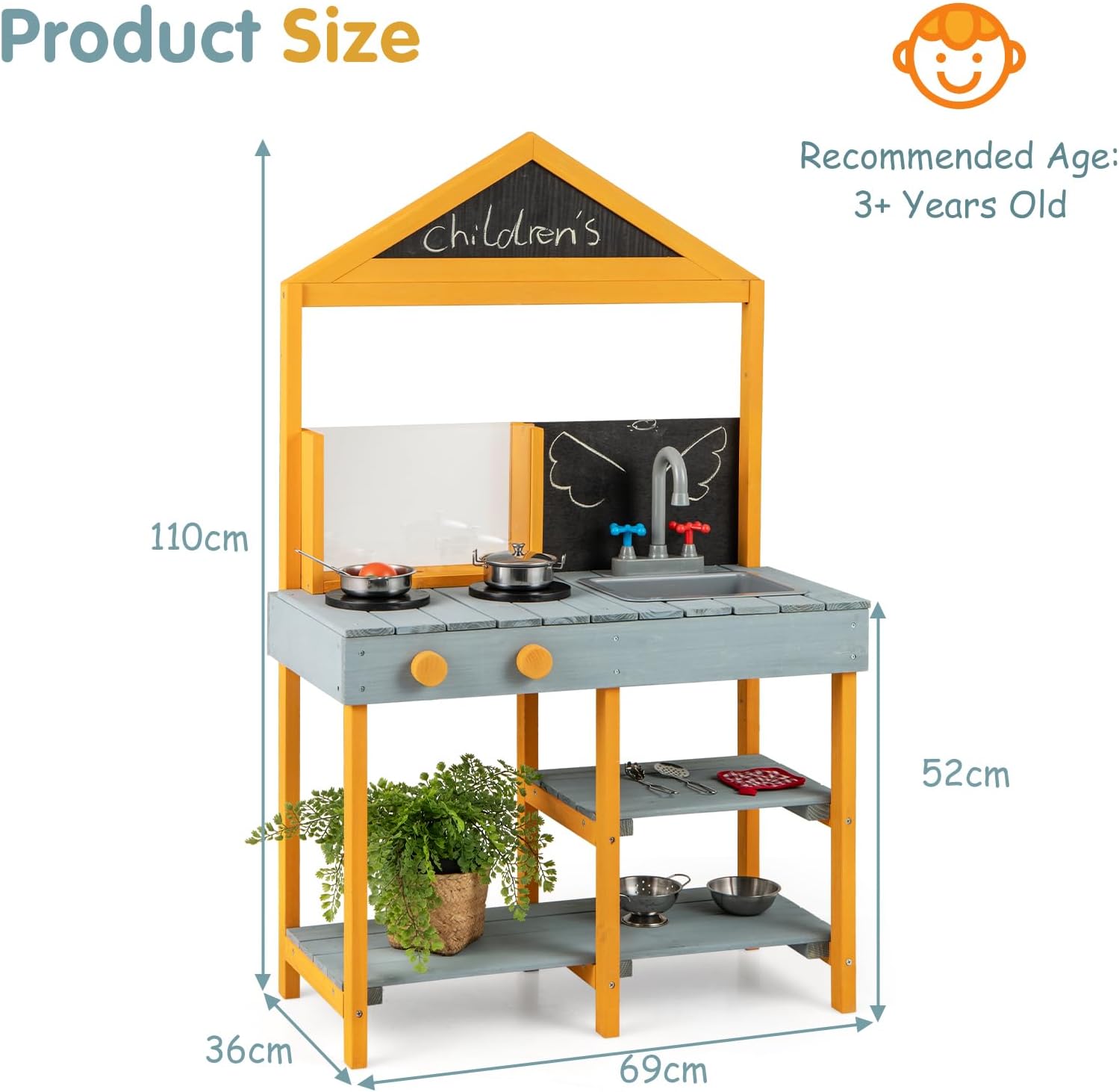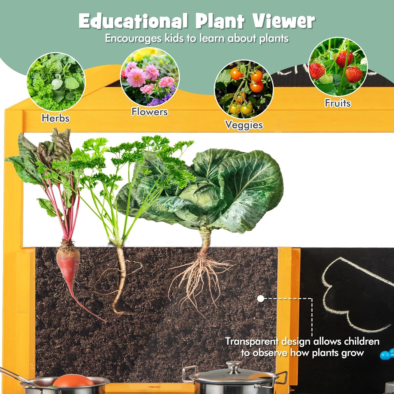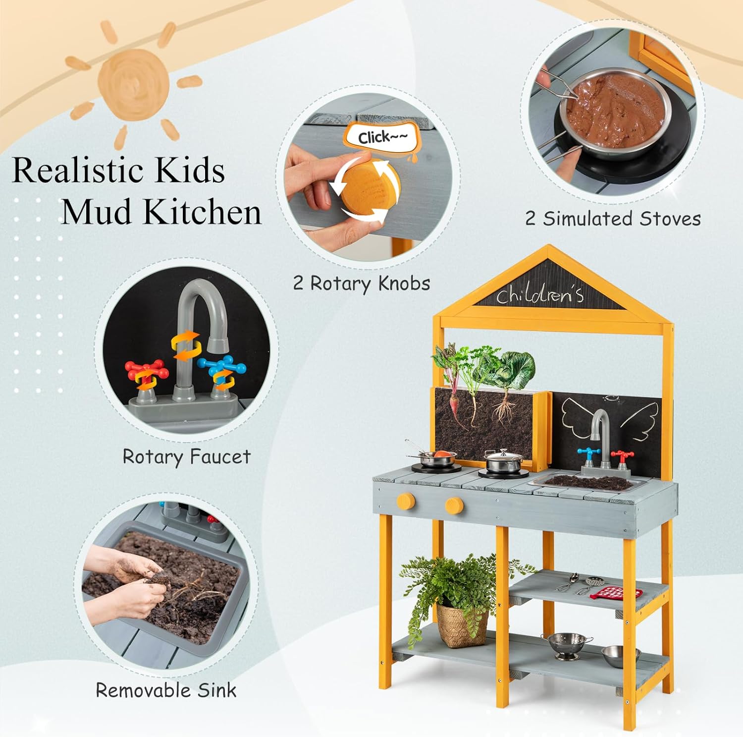 CUCINA MULTIFUNZIONALE PER BAMBINI DA ESTERNO: Questa cucina giocattolo per bambini da giardino non solo è dotata di 2 lavelli e rubinetti estraibili, ma anche di 2 lavagnette creative e ripiani aperti, che permettono ai bambini di giocare con la propria immaginazione, ma anche di sviluppare buoni hábiti di organizzazione e ordine GIOCATTOLI CREATIVI PER VASI DA PIANTARE: Oltre ai giocattoli da cucina come forni simulati e pentole e padelle, questo giocattolo da esterno per bambini è anche equipaggiato con vasi trasparenti per piantare con osservazione delle radici, che permettono ai piccoli giardinieri di osservare il processo di crescita delle piante mentre sperimentano il divertimento del piantare MATERIALE NATURALE IN ABETE: La nostra cucina da esterno per bambini è realizzata in abete naturale di alta qualità, abbastanza resistente e durevole da rimanere con i bambini per anni, offrendo loro uno spazio di gioco sicuro e affidabile MIGLIORA LE ABILITÀ PRATICHE: I bambini devono mescolare fango e acqua per cuocere e cucinare durante il gioco, perfezionando così le loro abilità pratiche e motorie fini, permettendo loro di imparare e crescere attraverso il gioco SCELTA REGALO PERFETTA: Questo giocattolo da cucina per bambini è un regalo ideale per il compleanno o le vacanze del tuo bambino, adatto ai bambini dai 3 anni in su, permettendo loro di divertirsi mentre incoraggia la loro creatività e immaginazione