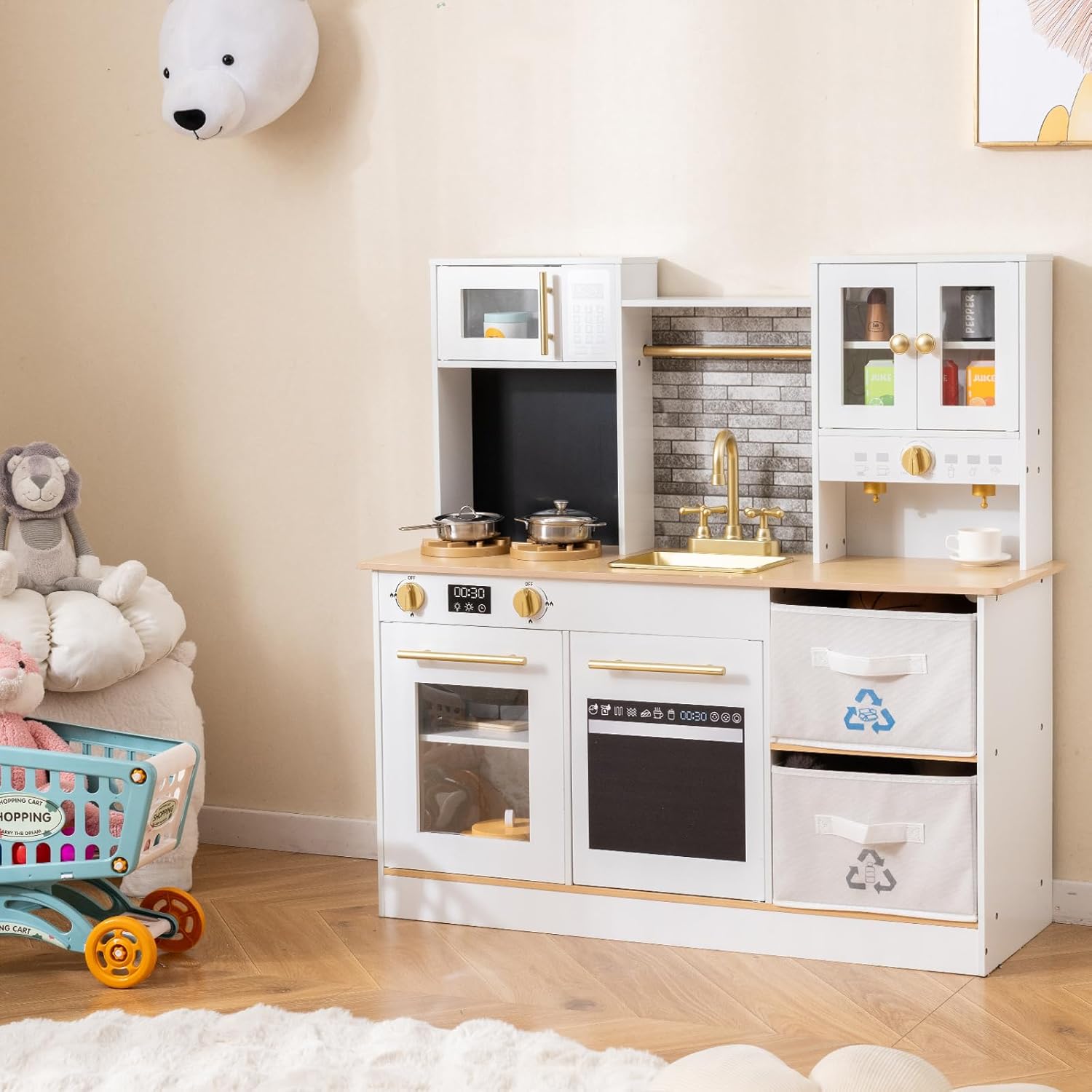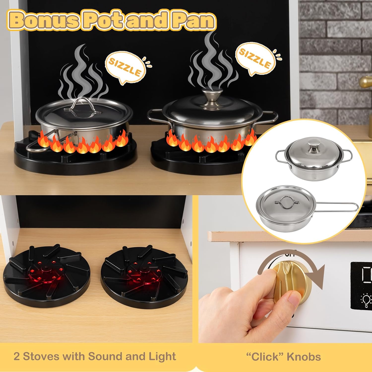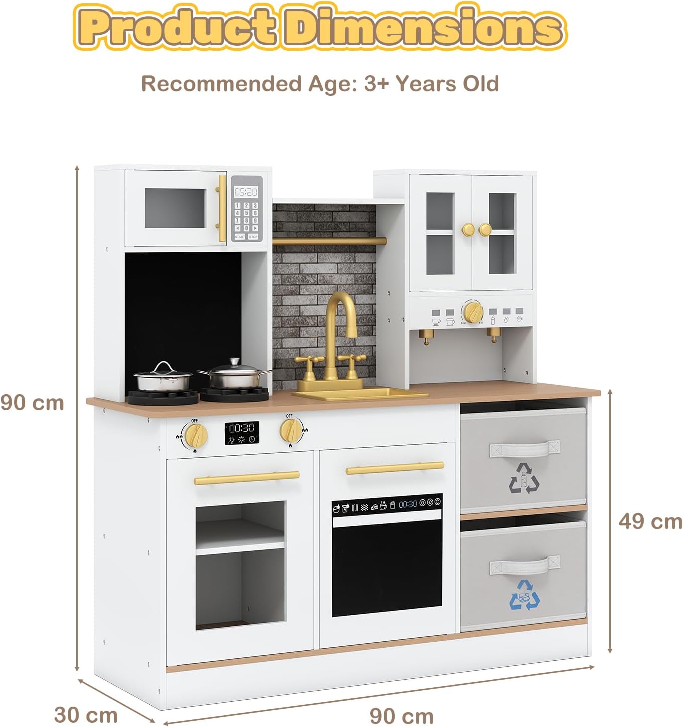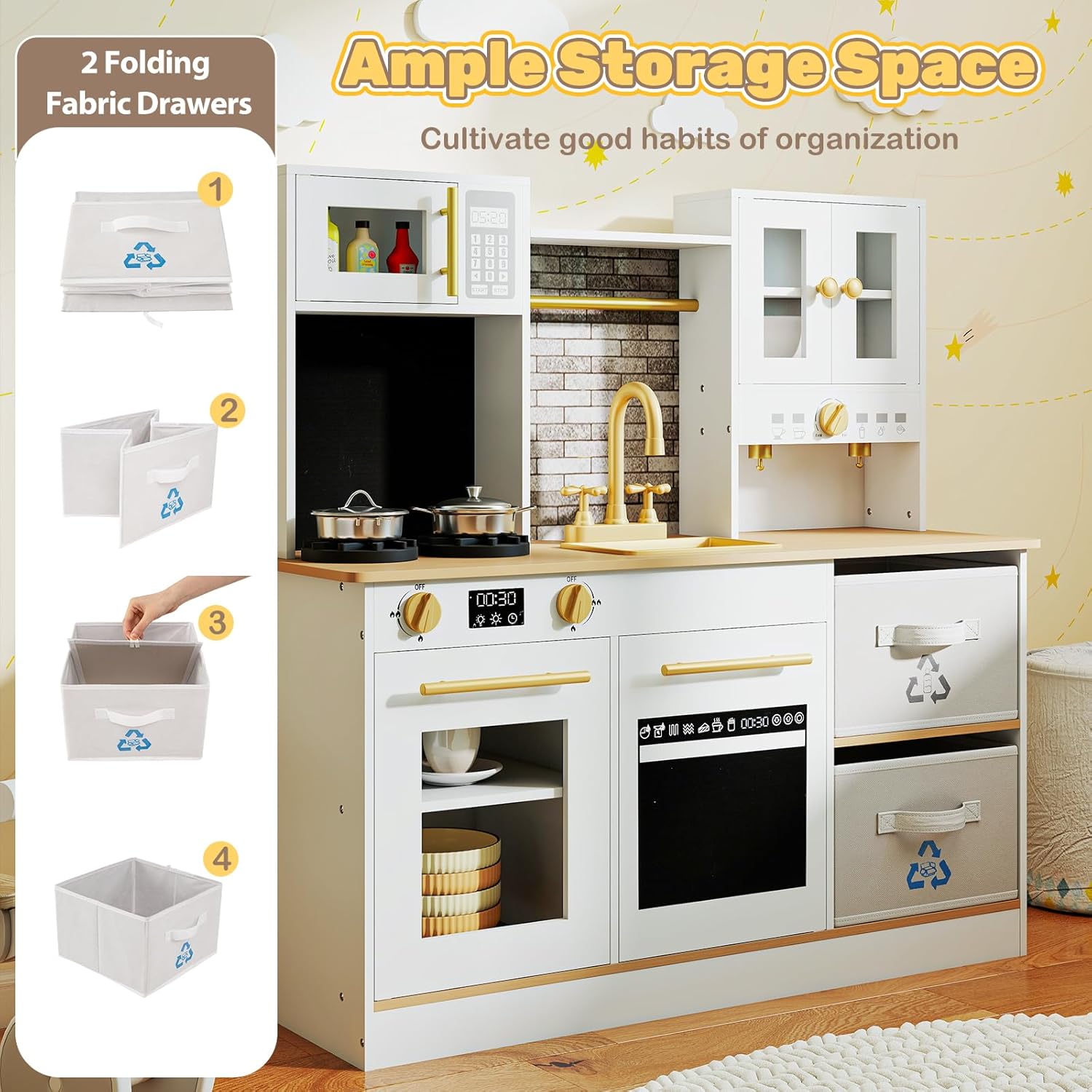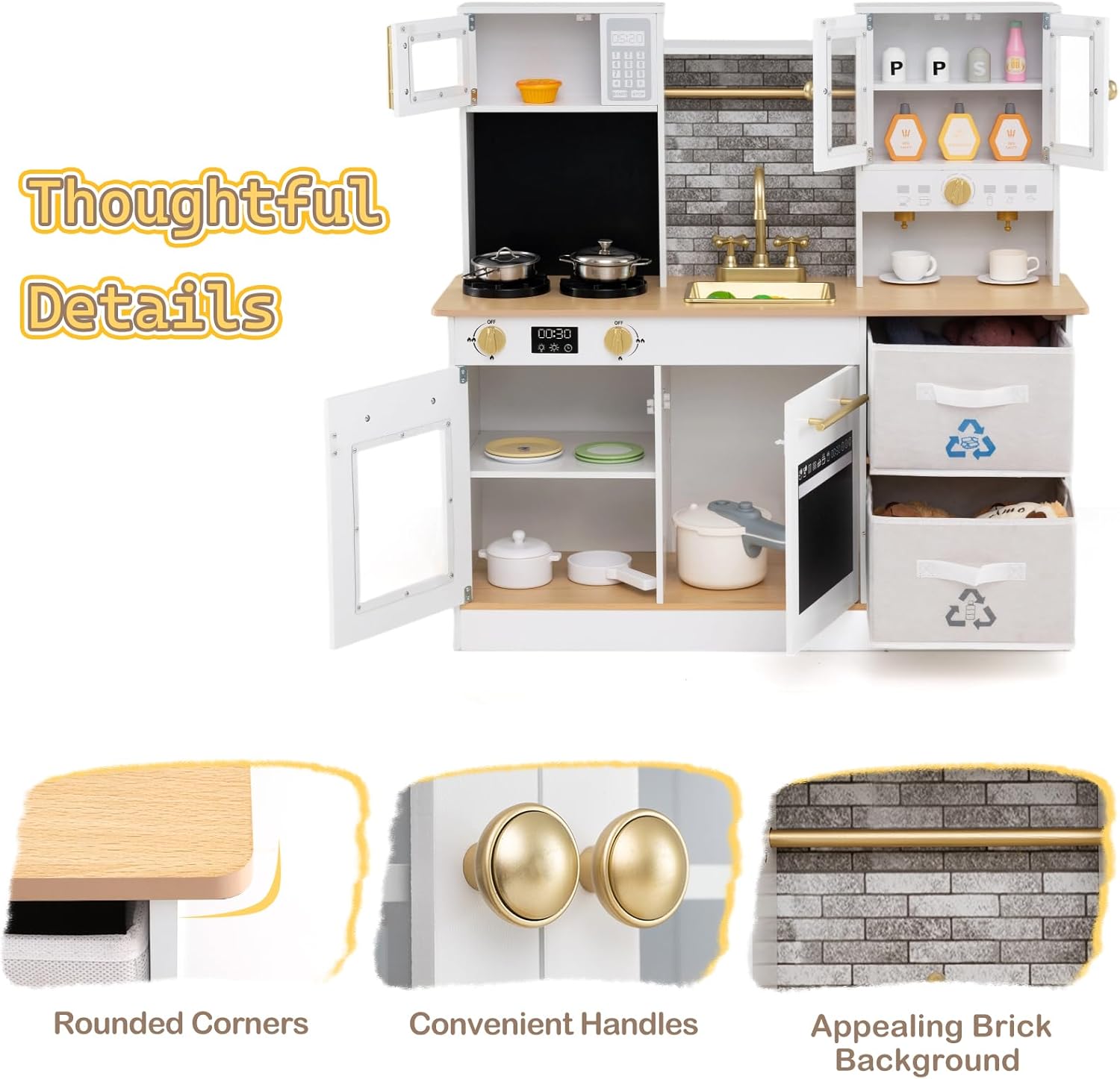 ESPERIENZA DI CUCINA IMMERSIVA: Questa cucina giocattolo per bambini è dotata di 2 fornelli con effetti sonori e luminosi, in grado di simulare con precisione il processo di cottura reale, permettendo ai bambini di immedesimarsi istantaneamente nel ruolo di “piccolo chef”. Quando il bambino gira la manopola, il fornello emette contemporaneamente un realistico scoppiettio di combustione e lampeggia con una luce calda di colore rosso, aumentando notevolmente il coinvolgimento e il divertimento durante il gioco CONFIGURAZIONE CUCINA A TUTTO TONDO: Questa cucina simulata comprende forno a microonde, macchina del caffè, lavello e rubinetto realistici, abbinati a un set completo di mini utensili da cucina, coprendo le funzioni fondamentali di una cucina reale. I bambini possono interagire con azioni come “lavare i piatti con il rubinetto” o “riscaldare nel microonde”, sviluppando naturalmente l’interesse per le faccende domestiche e acquisendo consapevolezza della vita quotidiana DESIGN CON GRANDE CAPACITÀ DI STOCCAGGIO: Questa cucina legno per bambini è dotata di 2 armadietti indipendenti e 2 cassetti pieghevoli in tessuto, offrendo ampio spazio per riporre gli utensili e gli accessori da cucina dei bambini. Questo design aiuta non solo a mantenere ordinata la cucina giocattolo, ma anche a educare i bambini a mettere in ordine autonomamente, favorendo così buone abitudini di organizzazione durante il gioco SICUREZZA A TUTTO TONDO: Questo set cucina per bambini è realizzato con materiali di alta qualità, sicuri, atossici, resistenti agli urti e adatti al gioco dei più piccoli, garantendo la sicurezza del bambino fin dall’origine. Tutti gli angoli della cucina sono smussati per evitare spigoli vivi che possano ferire il bambino, proteggendo attentamente il bambino durante il gioco e offrendo maggiore tranquillità ai genitori STIMOLA CREATIVITÀ E IMMAGINAZIONE: L’aspetto di questa cucinetta per bambini è altamente realistico, offrendo ai bambini numerosi scenari interattivi e spazi per la fantasia, supportando il gioco individuale o la collaborazione con familiari e amici. Ideale per bambini di età superiore ai 3 anni, è un regalo di alta qualità che porta gioia e preziosi ricordi, perfetto per compleanni, la Festa dei Bambini o il Natale