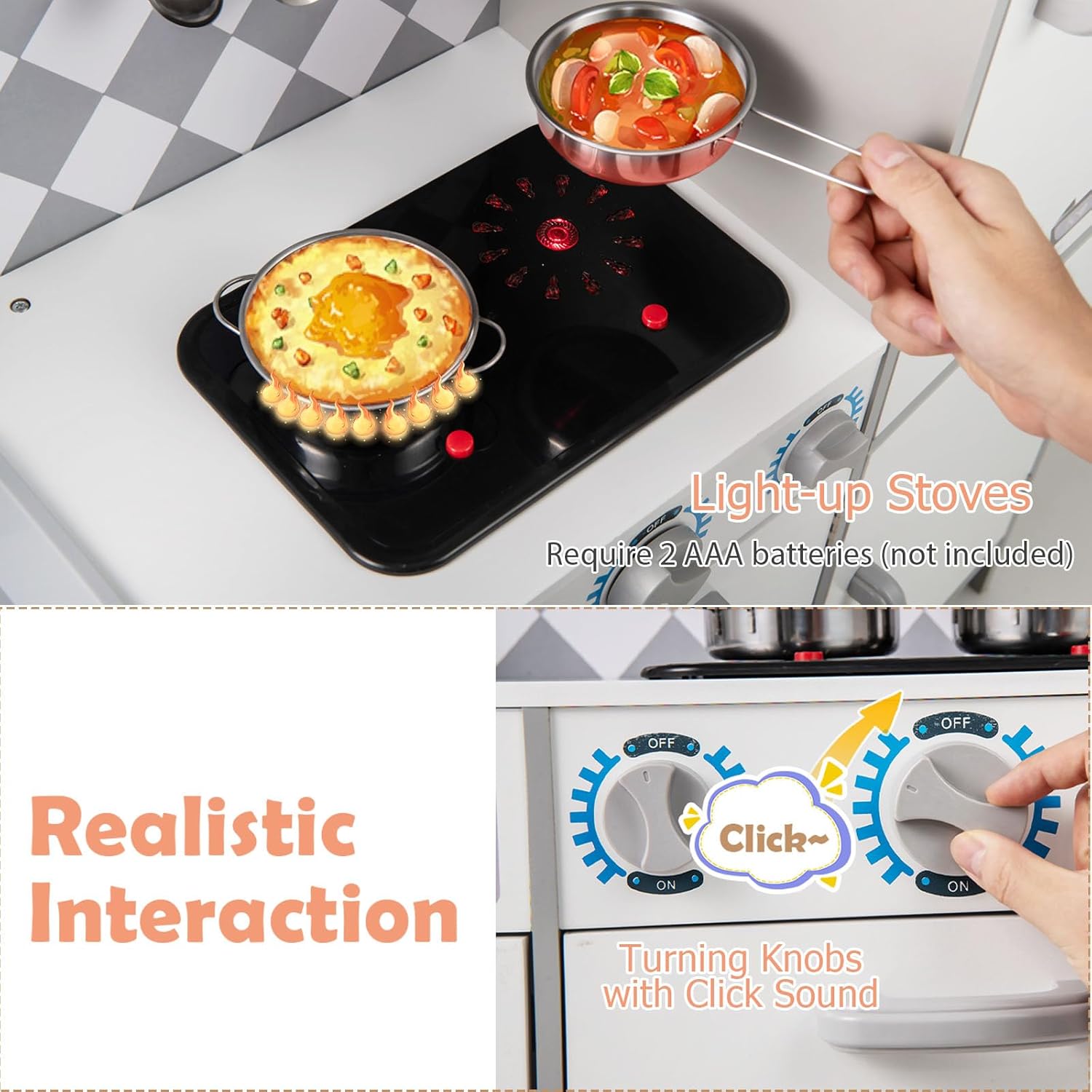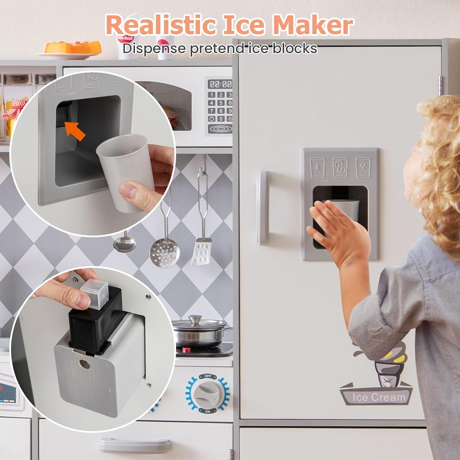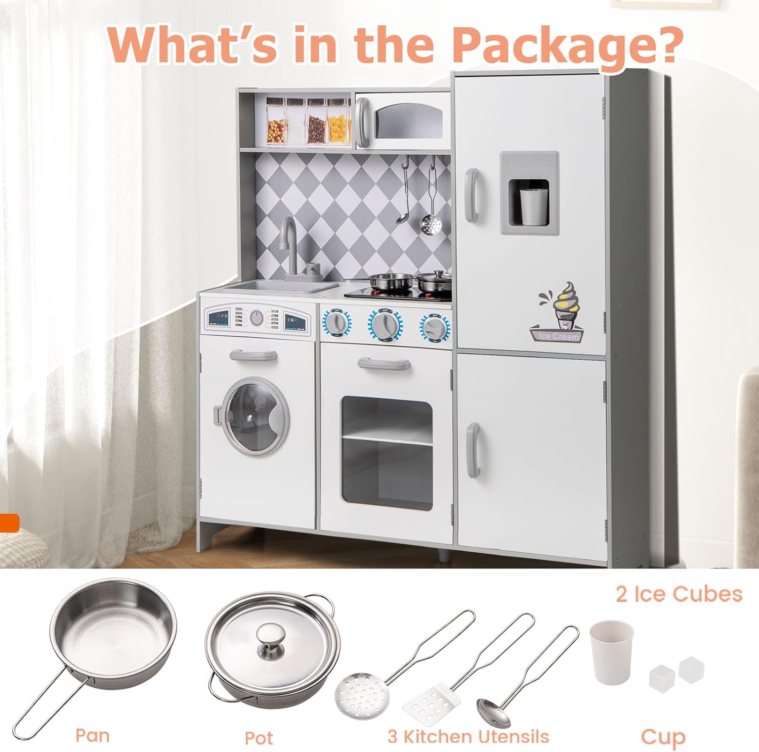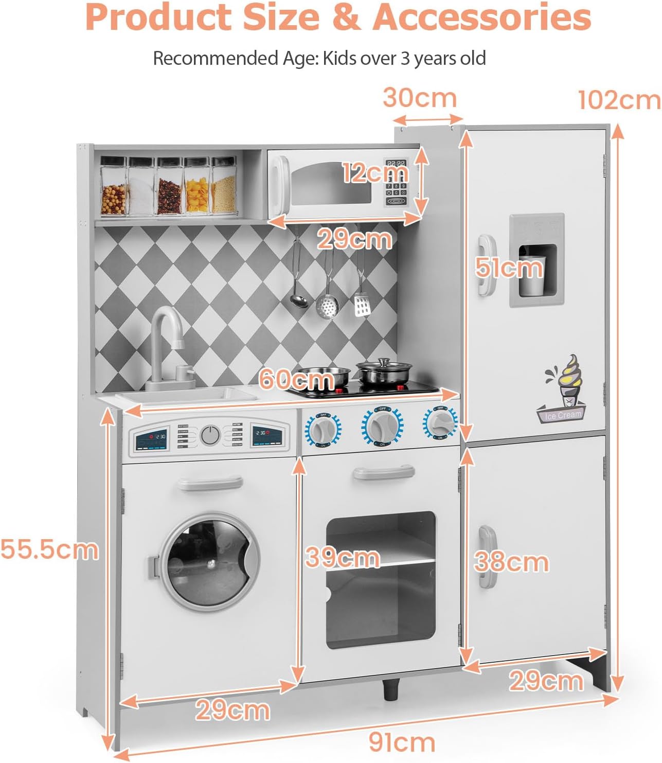 ACCESSORI RICCHI: Oltre agli utensili da cucina di base, come pentole e mestoli, questo set da cucina per bambini è dotato di accessori speciali come rubinetto, coperchio della porta della lavatrice in plastica, che permettono ai bambini di simulare scene di cucina reali e godersi un'esperienza di gioco più ricca e variegata MATERIALI SICURI: Questo cucina giocattolo per bambini è realizzato in MDF, un materiale resistente all'usura e ecologico, privo di sostanze tossiche e dannose, resistente alla deformazione, garantendo la sicurezza dei bambini durante il gioco. Inoltre, le maniglie delle porte sono progettate in modo arrotondato per evitare incidenti DESIGN LUMINOSO E SONORO: Il fornello a gas del set da cucina legno per bambini è dotato di funzioni luminose e sonore (richiede 2 batterie AAA non incluse), i bambini possono sentire il suono del gas e vedere la luce lampeggiare quando girano le manopole, aumentando il senso di realtà e divertimento, stimolando l'esplorazione e l'immaginazione dei bambini REALIZZA IL SOGNO DI DIVENTARE CUOCO: Le dimensioni di 91 x 30 x 102 cm/ 82 x 25 x 80,5 cm sono perfette per i bambini in età prescolare, il design realistico della cucina, come il ghiaccio, la macchina per il ghiaccio e altri dettagli, permette ai bambini di esprimere liberamente la propria fantasia e di vivere il divertimento di essere un piccolo cuoco nel gioco di ruolo IMPARARE GIOCANDO: Simulando scene reali di cucina, i bambini non solo possono divertirsi giocando, ma possono anche imparare abilità di base in cucina, capire l'uso e la funzione degli utensili da cucina, sviluppare abilità manuali e di autogestione, acquisire conoscenze e crescere mentre giocano