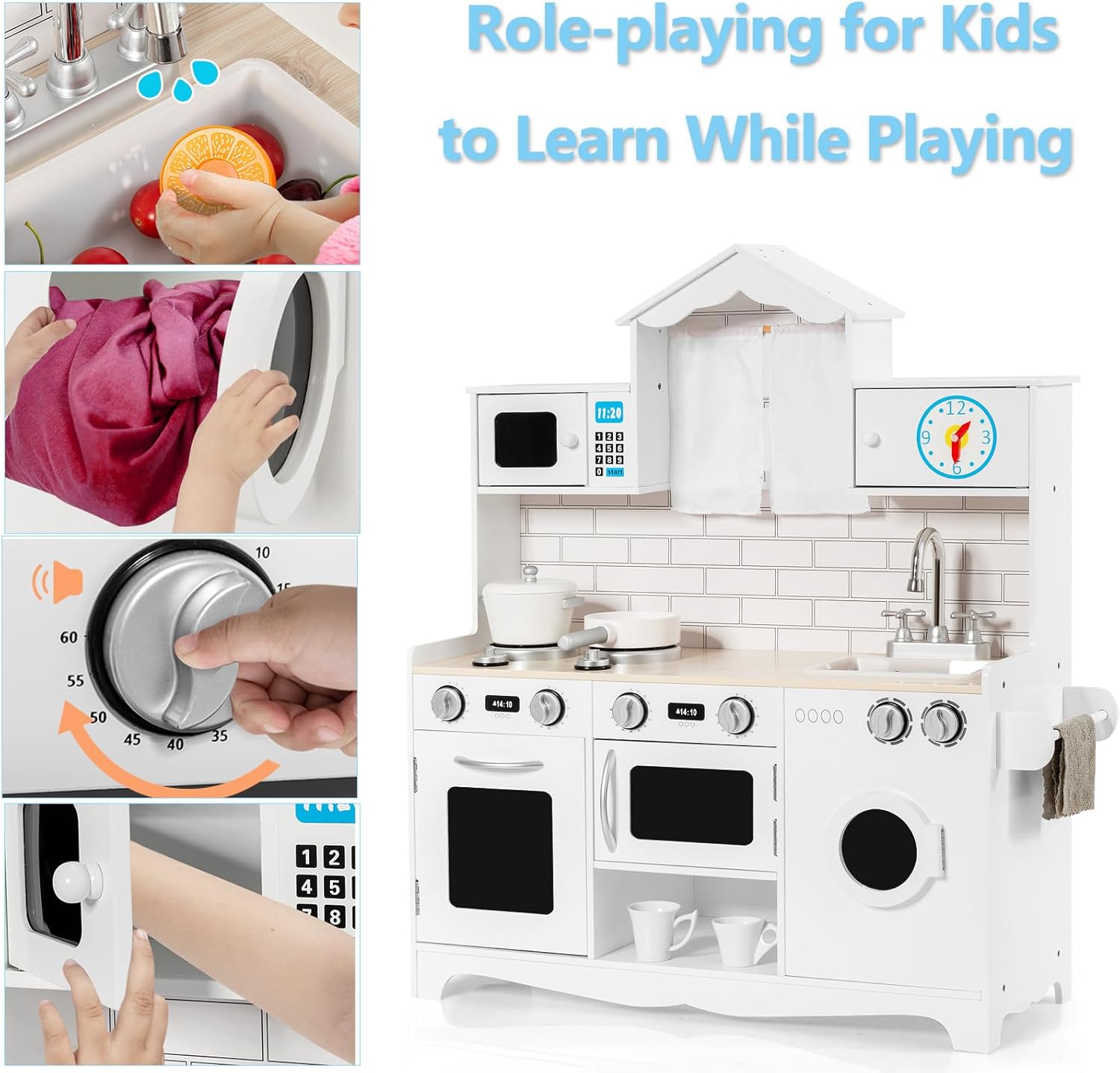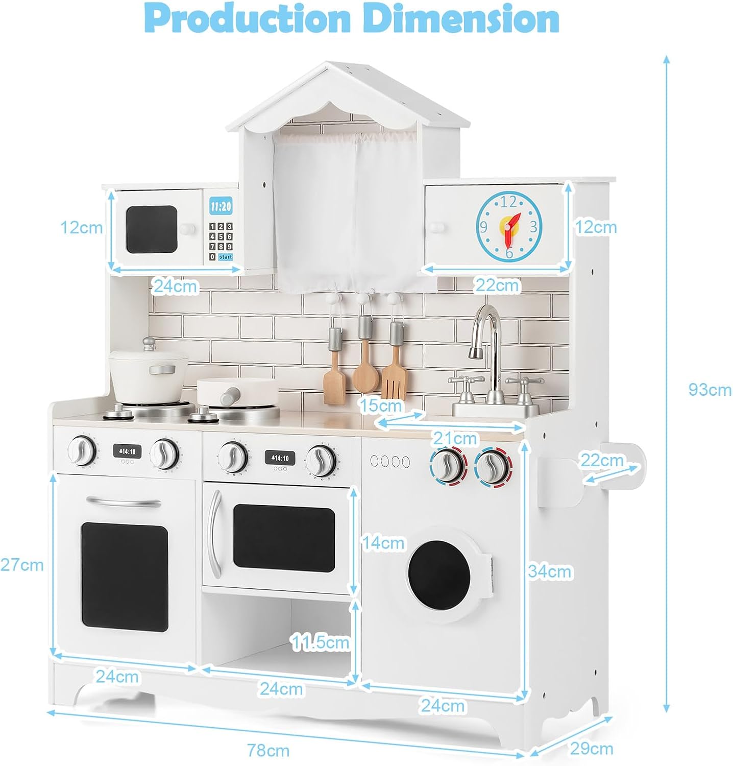 ~Accessori completi~ Questa cucina giocattolo per bambini è dotata di vari accessori come rubinetti in plastica, manopole e altro ancora, che consentono ai bambini di simulare la preparazione dei pasti, lavare le verdure e altro ancora, stimolando notevolmente la loro creatività e immaginazione. ~Giocattoli didattici~ Questa cucinetta per bambini non solo aiuta i bambini a sviluppare la capacità motoria e di coordinazione, ma anche a potenziare la capacità cognitiva e di pensiero critico, permettendo loro di imparare mentre si divertono. ~Dettagli realistici~ Il design di questa cucina legno per bambini è curato nei minimi dettagli, con rubinetti e fornelli realistici che creano un'atmosfera simile a quella di una vera cucina, aumentando il divertimento e la sensazione di realismo durante il gioco. ~Sicuro e resistente~ Questo giocattolo da cucina è realizzato in MDF e PP, materiali robusti e resistenti che resistono bene all'usura e agli urti, garantendo la sicurezza dei bambini. I materiali sono privi di sostanze tossiche e sicuri per un utilizzo tranquillo da parte dei bambini. ~Facile da montare~ Questa cucina per bambini è accompagnata da istruzioni di montaggio chiare e facili da seguire, che consentono ai genitori di assemblare facilmente il giocattolo senza l'uso di attrezzi specializzati, risparmiando tempo e permettendo ai bambini di divertirsi immediatamente con il giocattolo.