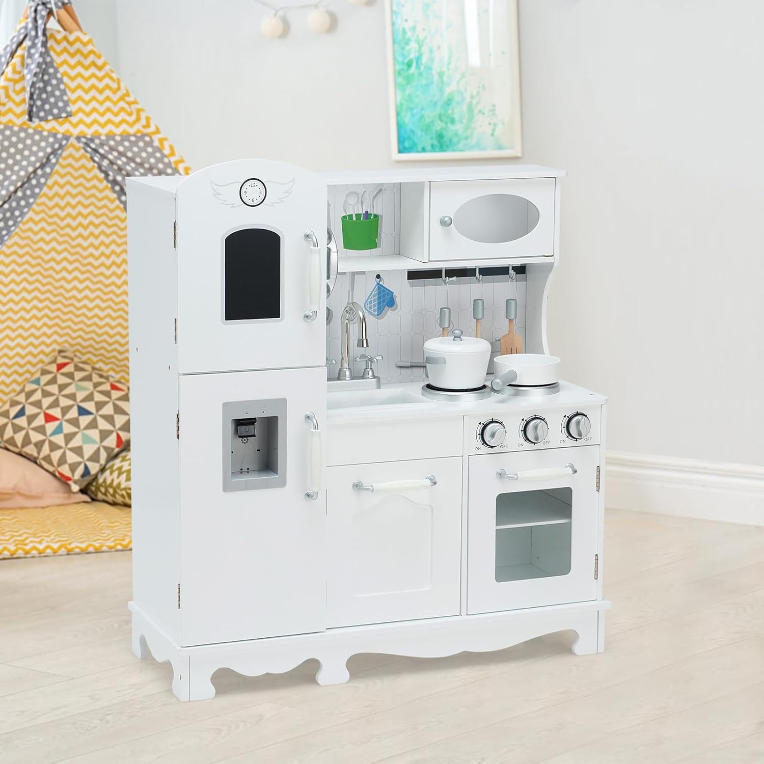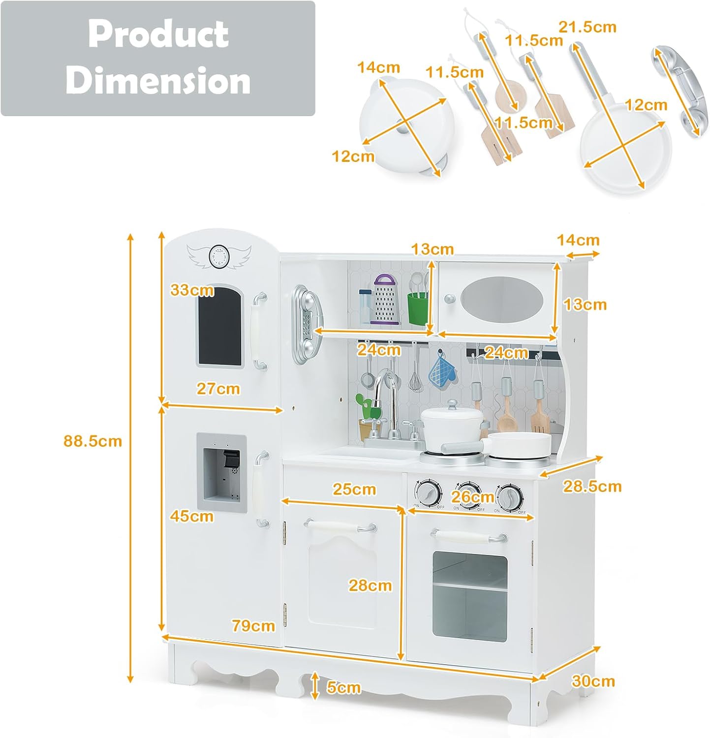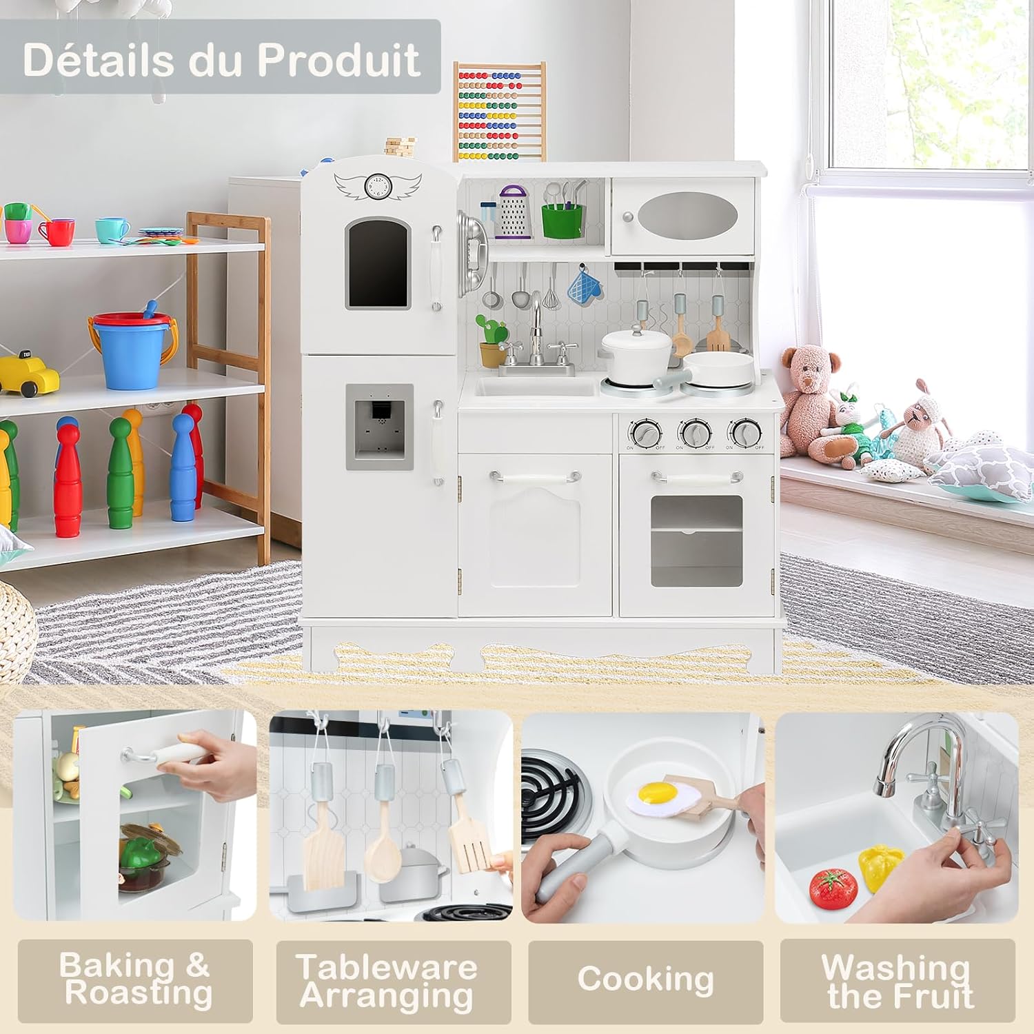 CUCINA DI IMITAZIONE COMPLETA: Immergi i tuoi bambini in un mondo di gioco realistico con la nostra cucina per bambini. Dotata di un lavello, di un forno simulato, di un armadio, di un distributore d'acqua, di una cucina e di 3 ganci, questa cucina offre un'esperienza di gioco autentica. Inoltre, un mini orologio, una lavagna e un adorabile telefono aggiungono un tocco di divertimento extra. SICUREZZA E QUALITÀ SUPERIORE: La sicurezza dei tuoi bambini è la nostra priorità. Realizzata con materiali di alta qualità come il MDF e il PP ecologico, la nostra cucina giocattolo per bambini garantisce un utilizzo sicuro. La superficie liscia e i bordi arrotondati assicurano una manipolazione sicura. DIVERTIMENTO INTERATTIVO IN CUCINA: Arricchisci il gioco dei tuoi bambini con una varietà di accessori divertenti. Potranno immergersi in attività culinarie divertenti, come lavare le verdure nel lavello e cucinare sul fornello a gas che emette suoni realistici. Un'esperienza interattiva che stimolerà la loro immaginazione e creatività. REGALO EDUCATIVO PERFETTO: Regala ai tuoi bambini un dono che unisce divertimento ed educazione. Attraverso i giochi di ruolo offerti da questa cucina legno per bambini, potranno sviluppare le loro abilità cognitive e pratiche mentre si familiarizzano con il mondo della cucina. Un regalo ideale per celebrare occasioni speciali come compleanni, Natale o la Giornata dei bambini. MONTAGGIO SEMPLIFICATO: Con un design classico ed elegante, la nostra cucinetta per bambini è facile da montare grazie al dettagliato manuale di istruzioni incluso. Tutti gli accessori necessari sono forniti per semplificare il processo di assemblaggio e consentire ai tuoi bambini di godere rapidamente del loro nuovo spazio di gioco.