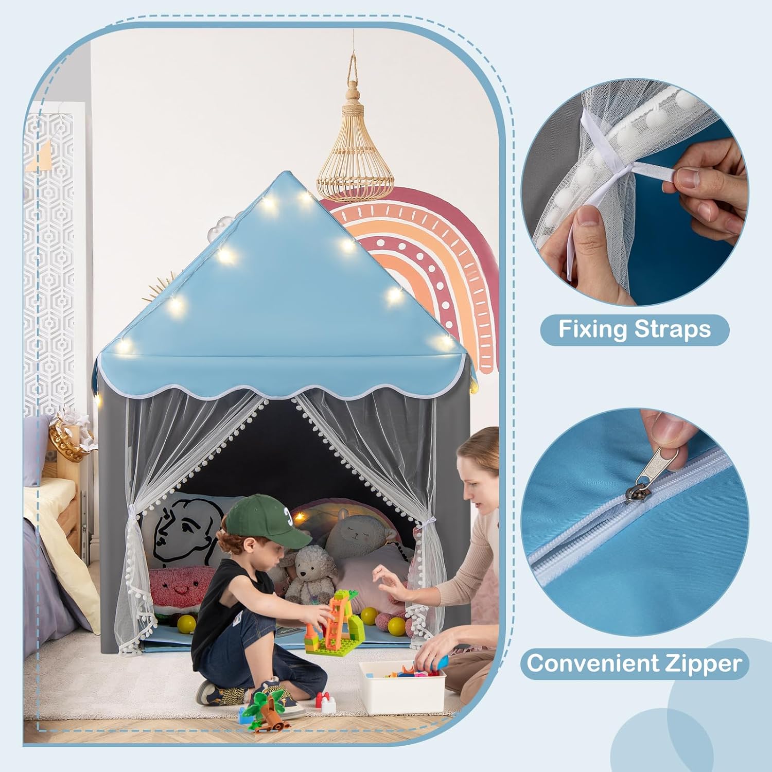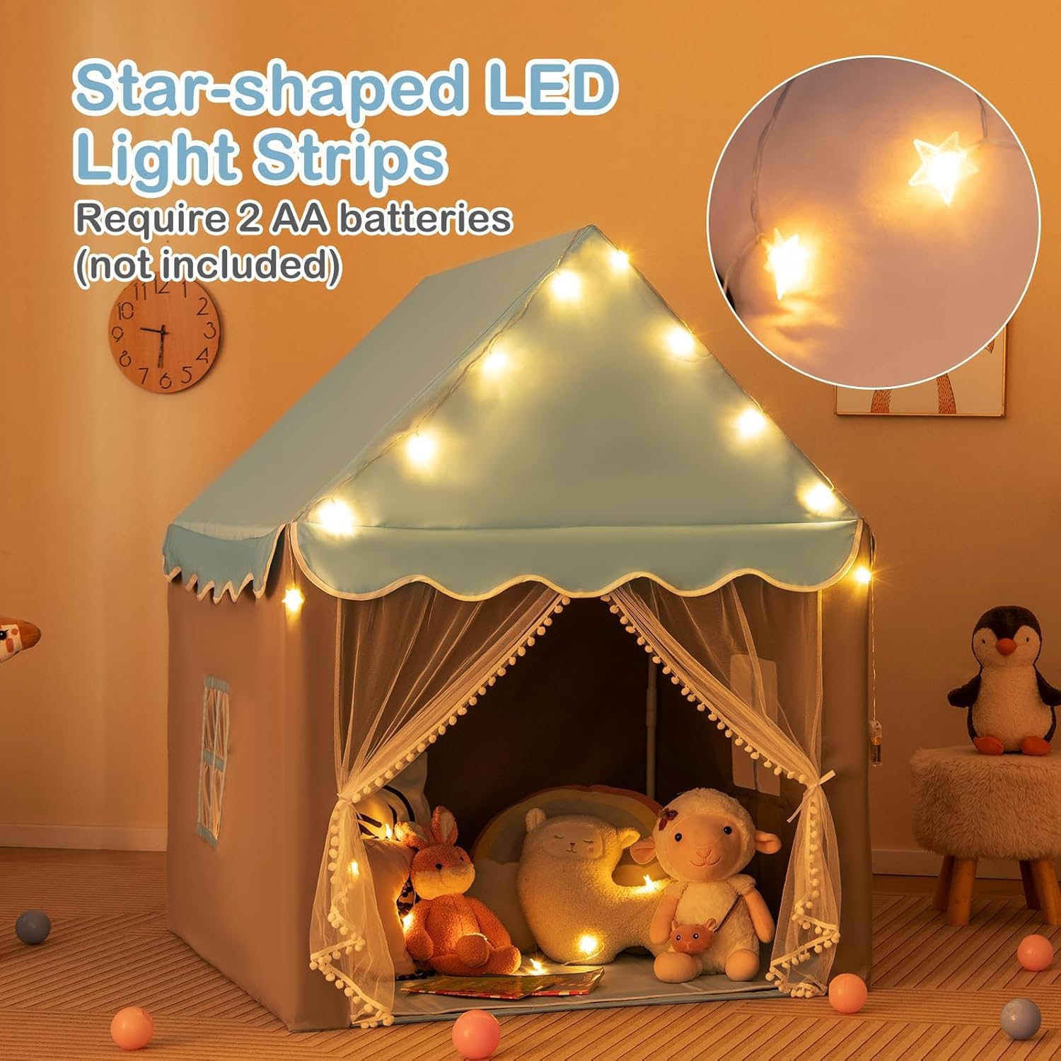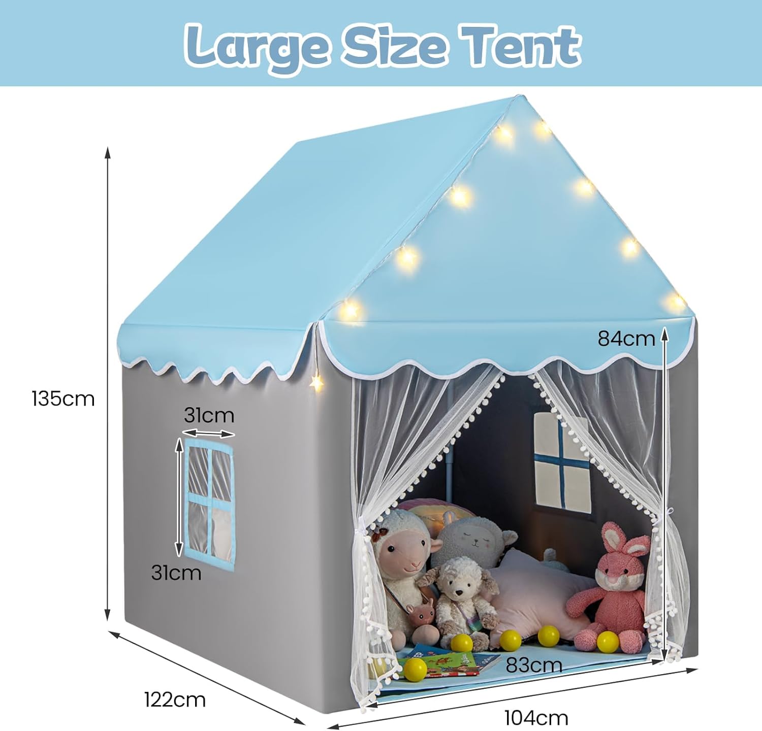 UNO SPAZIO RICREATIVO PER BAMBINI: Le dimensioni generose della tenda per bambini di 105 x 121 x 136 cm (L x P x A), ideale per ospitare fino a 4 bambini contemporaneamente, consentendo varie attività ludiche come il riposo, la lettura e giochi in famiglia TENDA PER BAMBINI RESISTENTE E SOLIDA: Realizzata in poliestere e cotone di alta qualità, questa casa da gioco offre uno spazio arioso, resistente all'umidità e delicato sulla pelle dei bambini. La struttura robusta in tubi di PVC garantisce stabilità e sicurezza ottimali AMBIENTE MAGICO E VENTILAZIONE OTTIMALE: Dotata di una luminosa ghirlanda di 2 metri con 10 stelle colorate, la tenda gioco bambini crea un'atmosfera accogliente. Inoltre, il tappeto in cotone morbido e le due finestre in rete assicurano comfort e una buona ventilazione UNA SORPRESA PER I BAMBINI: Con i suoi colori vivaci e il design incantevole, questa tenda bambini cameretta offre un mondo magico ai bambini. Il tendaggio di aerazione consente momenti ludici e intimi. Perfetto per compleanni, serate pigiama e altre occasioni speciali MONTAGGIO SEMPLICE E PRATICO: Le istruzioni passo dopo passo e le chiare illustrazioni della capanna per bambini da interno consentono un montaggio facile e rapido senza necessità di utensili. Le cerniere sul fondo facilitano il montaggio e lo smontaggio, e la sua leggerezza lo rende un accessorio portatile per l'uso interno o esterno