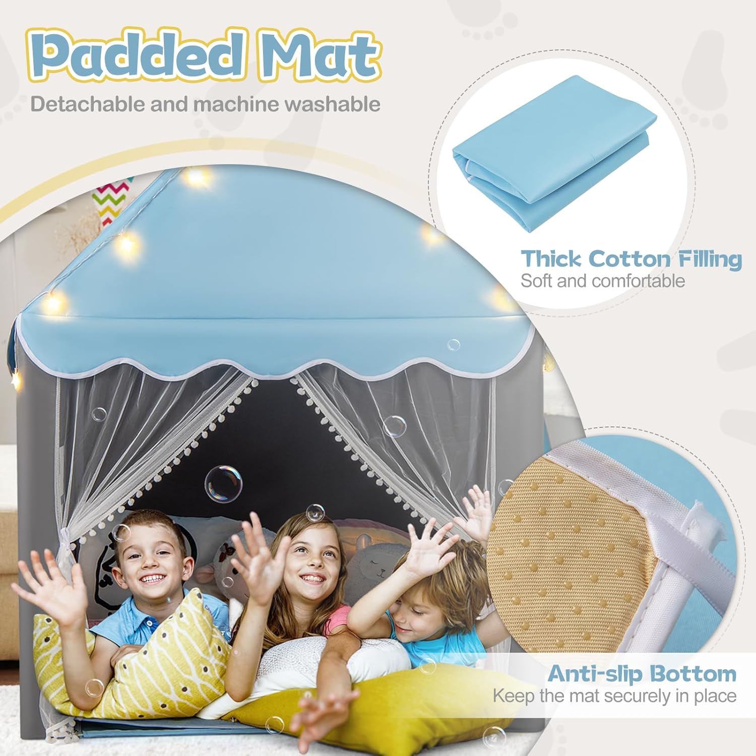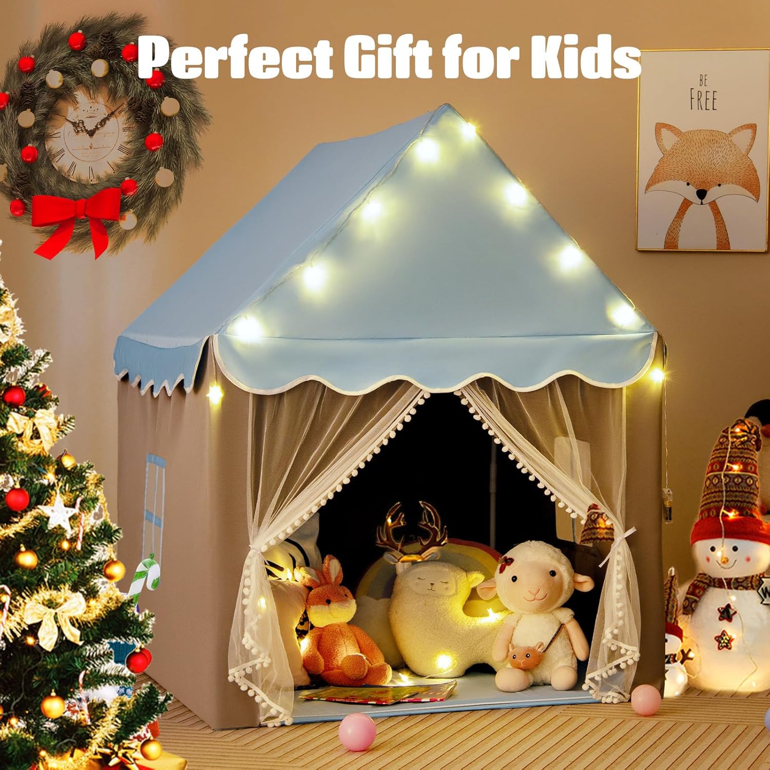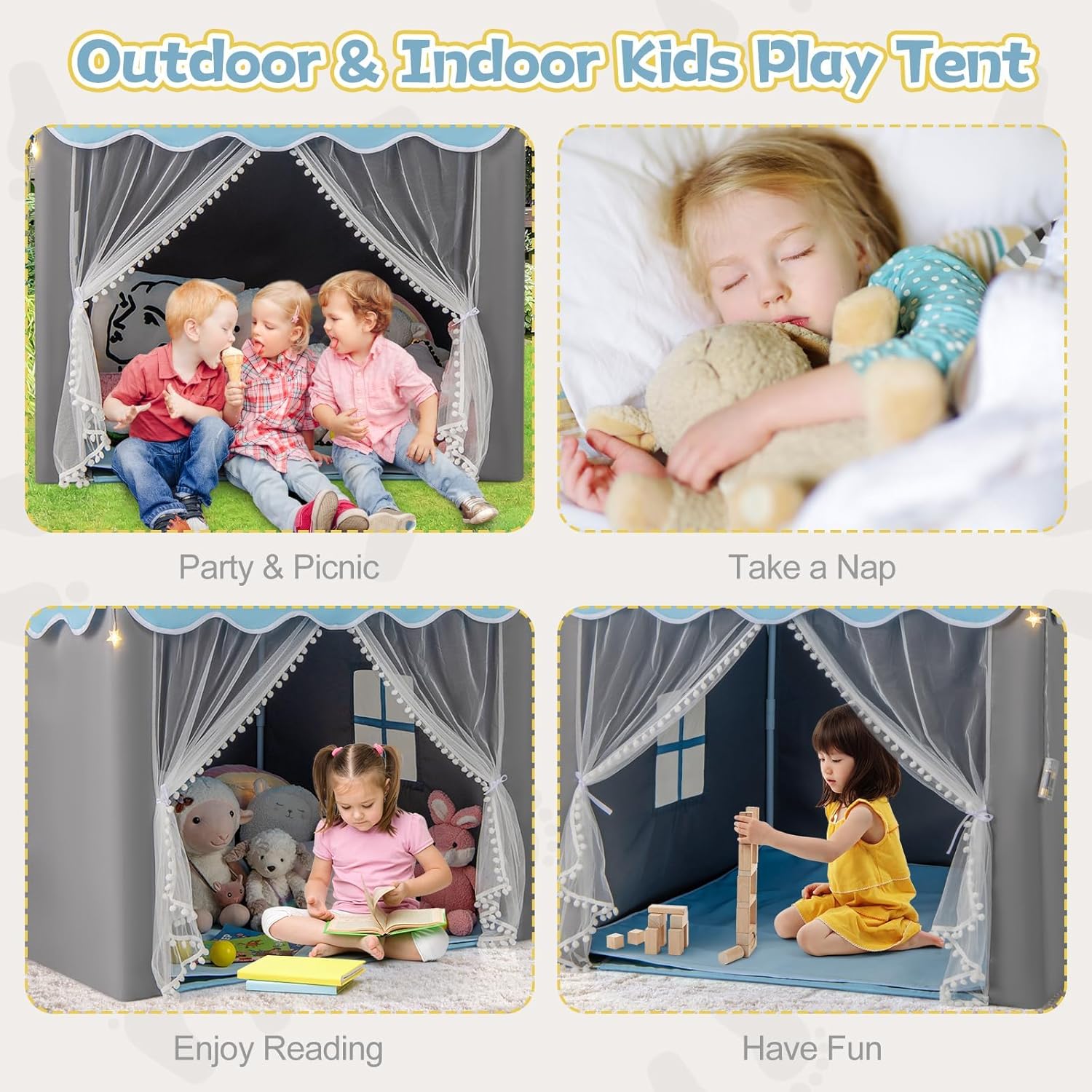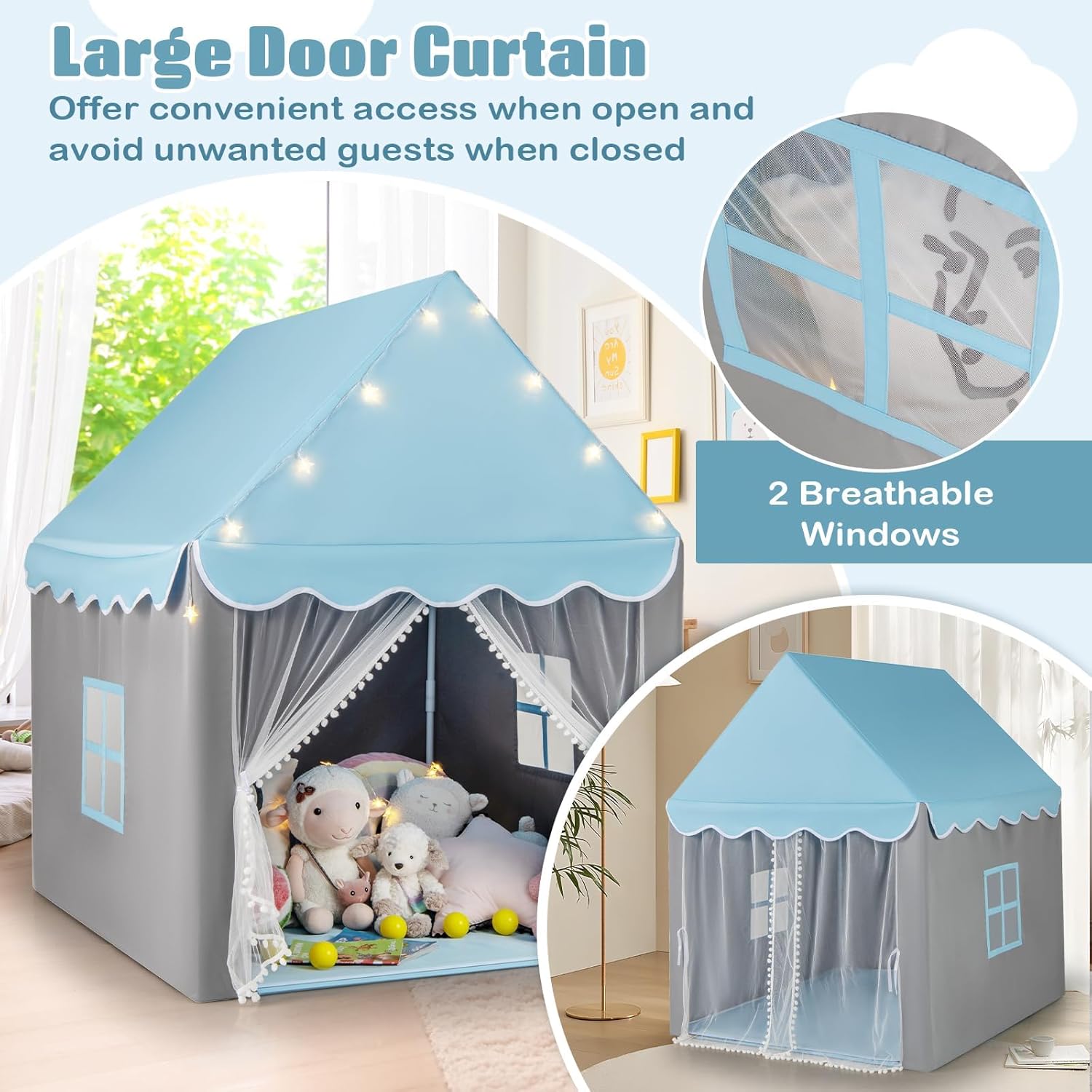 UNO SPAZIO RICREATIVO PER BAMBINI: Le dimensioni generose della tenda per bambini di 105 x 121 x 136 cm (L x P x A), ideale per ospitare fino a 4 bambini contemporaneamente, consentendo varie attività ludiche come il riposo, la lettura e giochi in famiglia TENDA PER BAMBINI RESISTENTE E SOLIDA: Realizzata in poliestere e cotone di alta qualità, questa casa da gioco offre uno spazio arioso, resistente all'umidità e delicato sulla pelle dei bambini. La struttura robusta in tubi di PVC garantisce stabilità e sicurezza ottimali AMBIENTE MAGICO E VENTILAZIONE OTTIMALE: Dotata di una luminosa ghirlanda di 2 metri con 10 stelle colorate, la tenda gioco bambini crea un'atmosfera accogliente. Inoltre, il tappeto in cotone morbido e le due finestre in rete assicurano comfort e una buona ventilazione UNA SORPRESA PER I BAMBINI: Con i suoi colori vivaci e il design incantevole, questa tenda bambini cameretta offre un mondo magico ai bambini. Il tendaggio di aerazione consente momenti ludici e intimi. Perfetto per compleanni, serate pigiama e altre occasioni speciali MONTAGGIO SEMPLICE E PRATICO: Le istruzioni passo dopo passo e le chiare illustrazioni della capanna per bambini da interno consentono un montaggio facile e rapido senza necessità di utensili. Le cerniere sul fondo facilitano il montaggio e lo smontaggio, e la sua leggerezza lo rende un accessorio portatile per l'uso interno o esterno