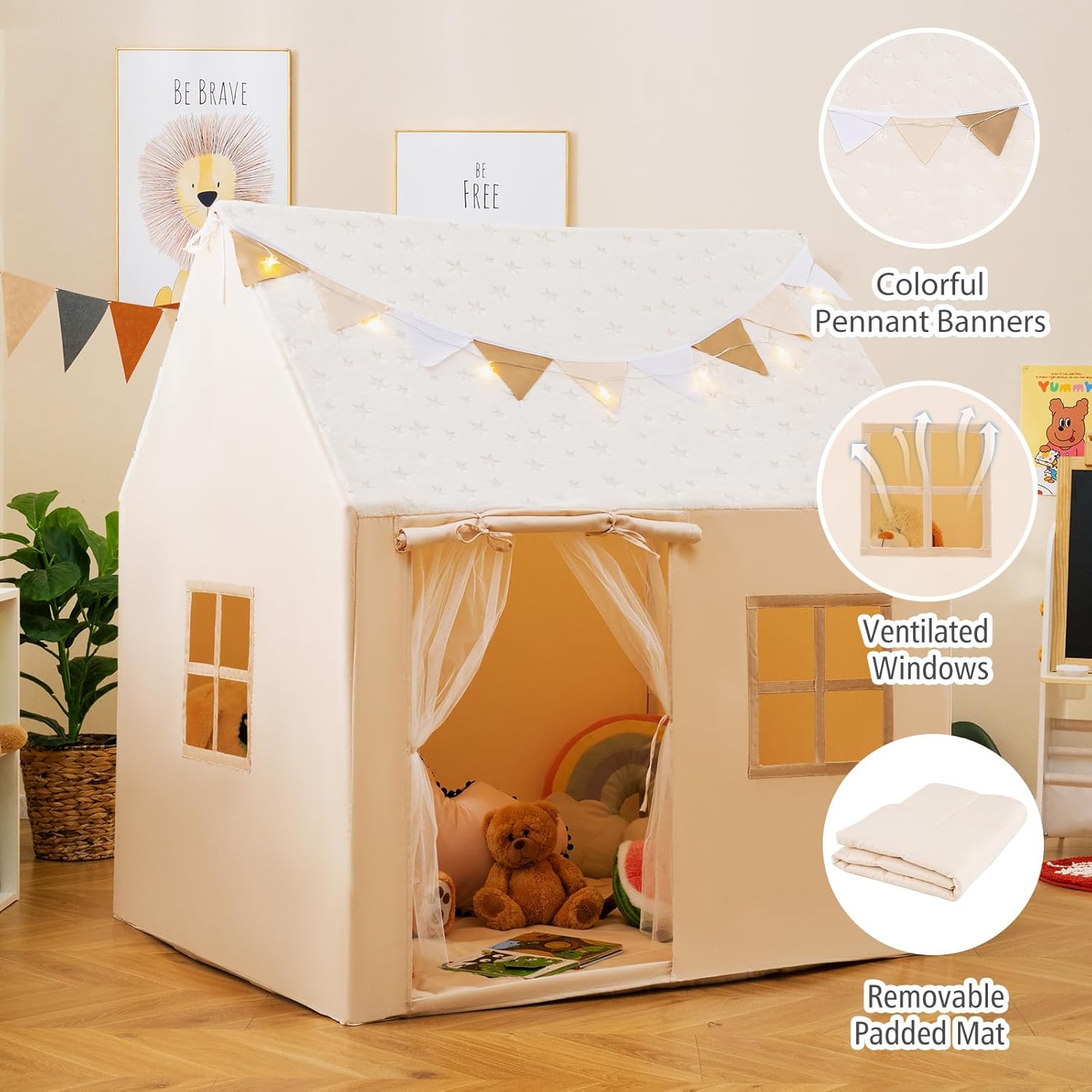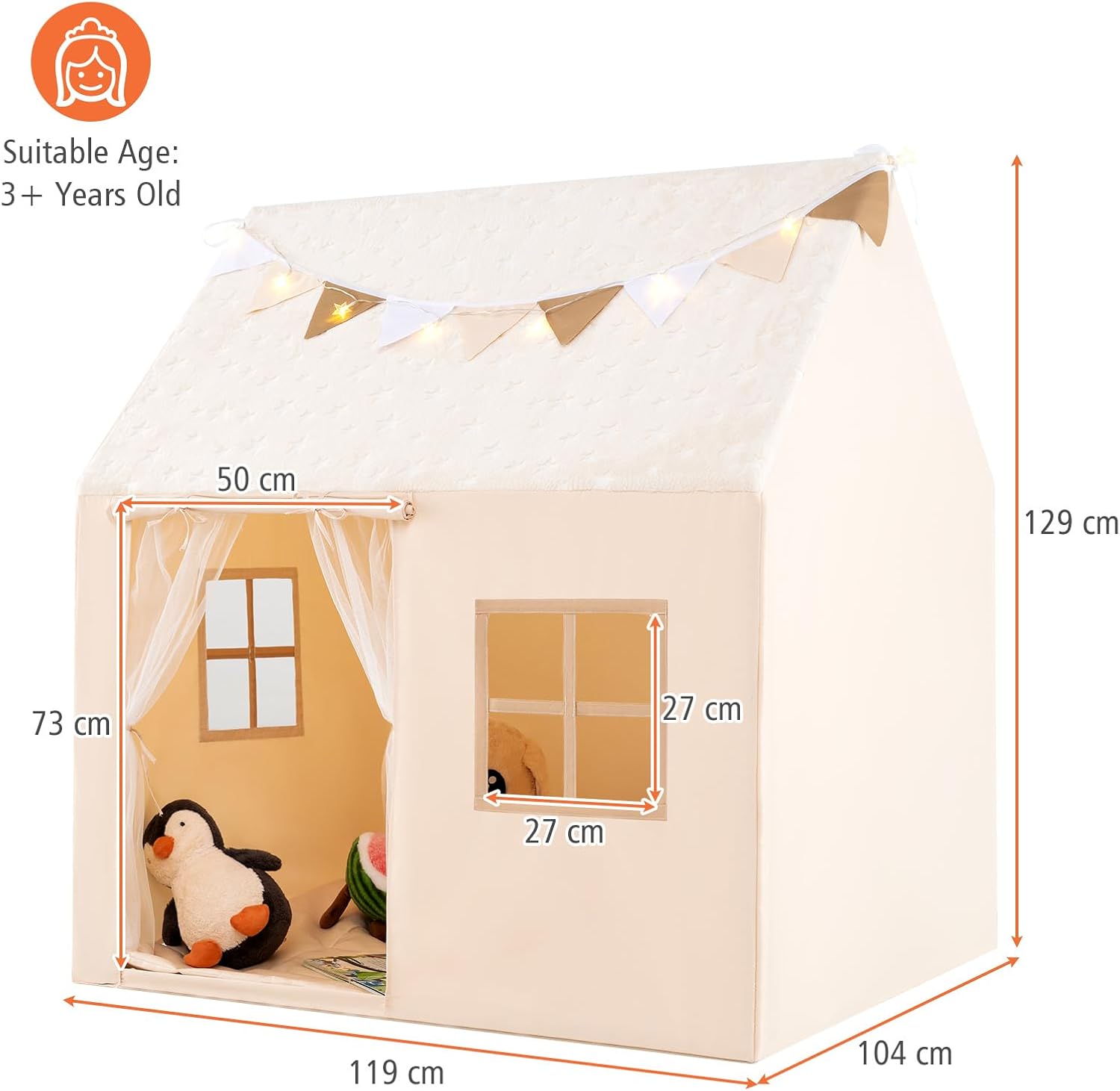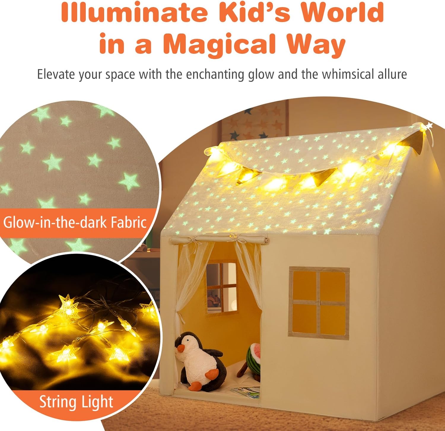 STELLE FLUORESCENTI DA SOGNO: Questa tenda per bambini è realizzata in un tessuto unico fluorescente, che brilla in una luce verde affascinante durante la notte ed è decorata con un motivo a stelle che stimola l'immaginazione del tuo bambino, trasformando ogni gioco in una magica avventura. La tenda bambini misura 119x104x129 cm ed è abbastanza spaziosa per soddisfare le esigenze dei bambini CONFIGURAZIONE DI LUSSO E COMFORT: La tenda da gioco è dotata di morbidi cuscini in pile che offrono una sensazione delicata e creano uno spazio esclusivo e caldo per i bambini. Abbinato alla decorazione di lanterne stellari e bandierine colorate, si crea un mondo privato che è sia sognante che confortevole. Il tappetino è facile da pulire e protegge ogni passo della sana crescita del tuo bambino DESIGN DI PRIVACY E VENTILAZIONE: La casa per bambini ha un design a tenda doppio con tende in mussola bianca traspirante, che non solo permette ai bambini di entrare e uscire liberamente, ma consente anche di regolare luce e privacy a seconda delle esigenze, creando il proprio piccolo mondo. Le finestre a rete di 27x27 cm consentono la circolazione dell'aria e un ampio campo visivo, permettendo ai bambini di godere della propria privacy e percepire contemporaneamente la vitalità del mondo esterno TENDA PRINCIPESSA PER APPLICAZIONI MULTIFUNZIONALI: Che si tratti di una casa da gioco per bambini accanto al letto o di un posto tranquillo per il tuo bambino per giocare all'interno e all'esterno, questa capanna per bambini da interno è la scelta perfetta. Il suo resistente telaio in PVC garantisce sicurezza e stabilità, consentendo ai bambini di esplorare e giocare senza preoccupazioni. È adatto ai bambini a partire dai 3 anni e accompagna ogni momento importante del loro sviluppo QUALITÀ DI MONTAGGIO SEMPLICE: L'assemblaggio della casa da gioco può essere facilmente eseguito senza complicati attrezzi, permettendo ai genitori di risparmiare preoccupazioni e fatica. La casetta tenda per bambini è realizzata con materiali di alta qualità e dettagli pregiati che soddisfano gli alti standard e sono un compagno affidabile nel percorso della crescita dei bambini. La scelta è un regalo d'amore e creatività per il tuo bambino