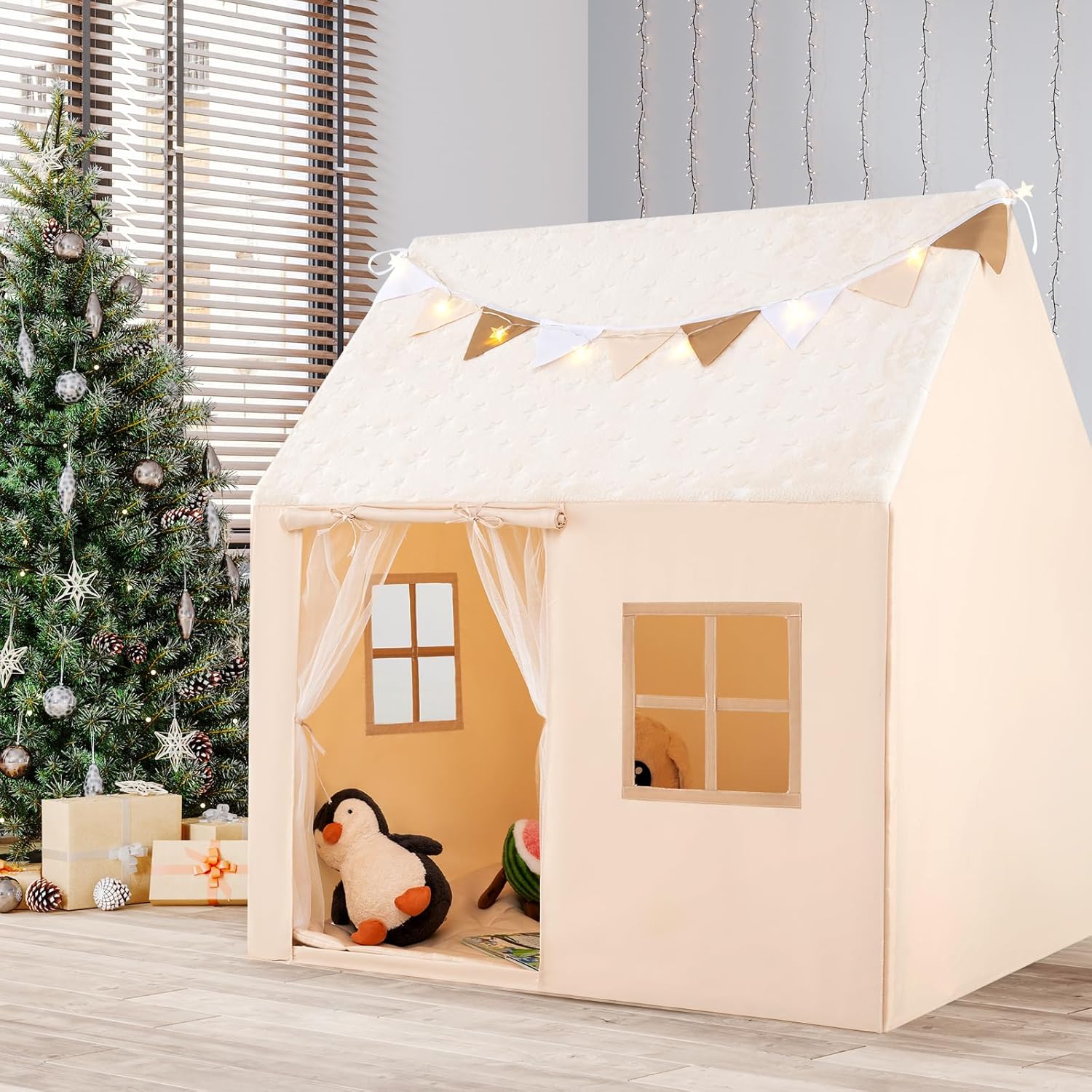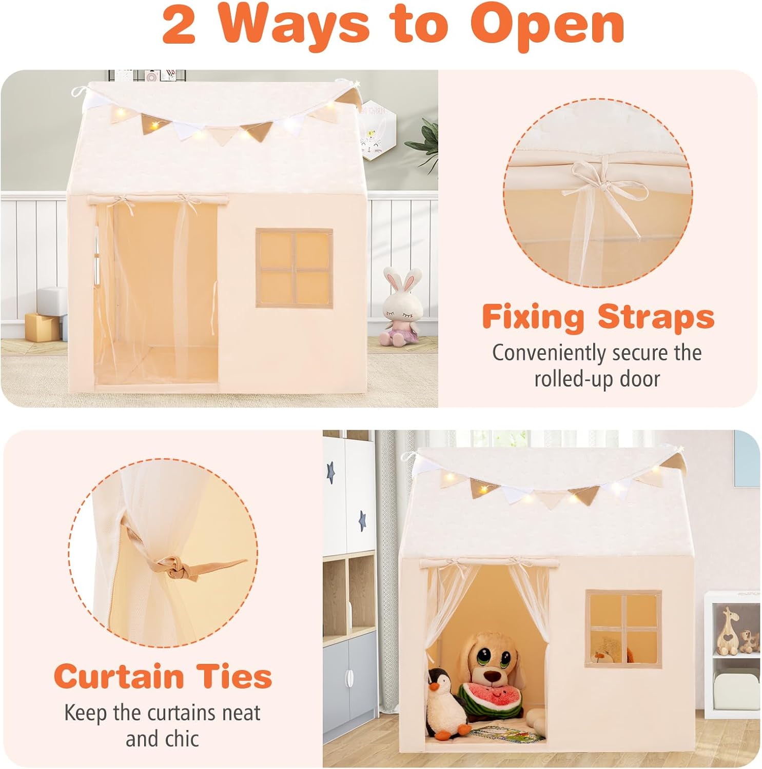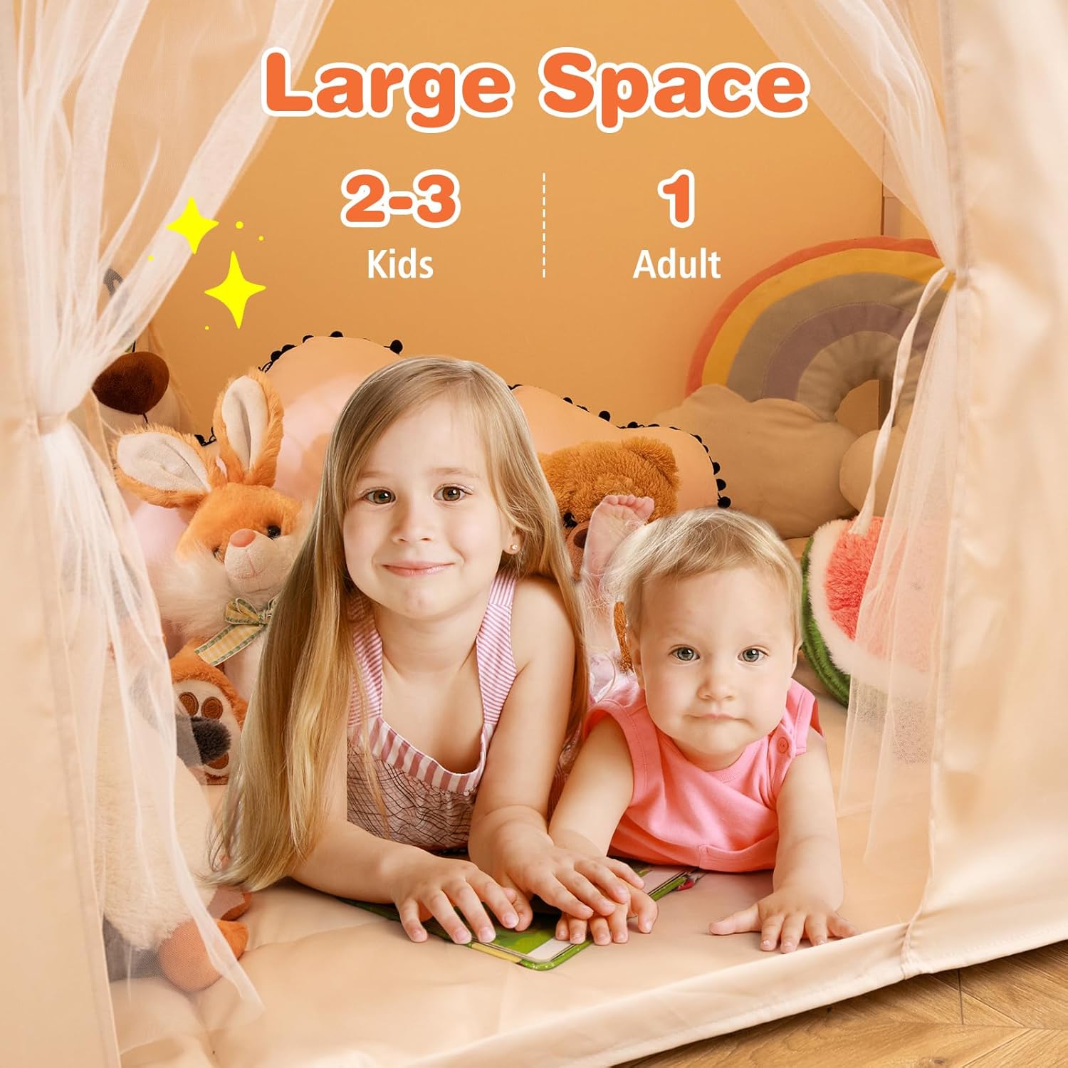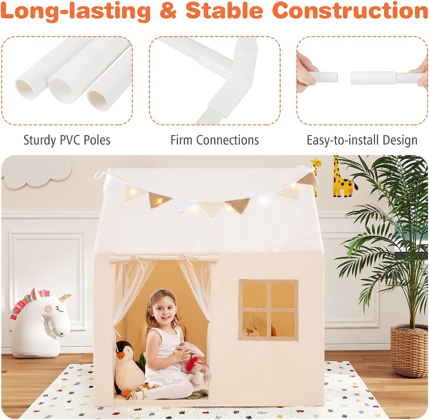 STELLE FLUORESCENTI DA SOGNO: Questa tenda per bambini è realizzata in un tessuto unico fluorescente, che brilla in una luce verde affascinante durante la notte ed è decorata con un motivo a stelle che stimola l'immaginazione del tuo bambino, trasformando ogni gioco in una magica avventura. La tenda bambini misura 119x104x129 cm ed è abbastanza spaziosa per soddisfare le esigenze dei bambini CONFIGURAZIONE DI LUSSO E COMFORT: La tenda da gioco è dotata di morbidi cuscini in pile che offrono una sensazione delicata e creano uno spazio esclusivo e caldo per i bambini. Abbinato alla decorazione di lanterne stellari e bandierine colorate, si crea un mondo privato che è sia sognante che confortevole. Il tappetino è facile da pulire e protegge ogni passo della sana crescita del tuo bambino DESIGN DI PRIVACY E VENTILAZIONE: La casa per bambini ha un design a tenda doppio con tende in mussola bianca traspirante, che non solo permette ai bambini di entrare e uscire liberamente, ma consente anche di regolare luce e privacy a seconda delle esigenze, creando il proprio piccolo mondo. Le finestre a rete di 27x27 cm consentono la circolazione dell'aria e un ampio campo visivo, permettendo ai bambini di godere della propria privacy e percepire contemporaneamente la vitalità del mondo esterno TENDA PRINCIPESSA PER APPLICAZIONI MULTIFUNZIONALI: Che si tratti di una casa da gioco per bambini accanto al letto o di un posto tranquillo per il tuo bambino per giocare all'interno e all'esterno, questa capanna per bambini da interno è la scelta perfetta. Il suo resistente telaio in PVC garantisce sicurezza e stabilità, consentendo ai bambini di esplorare e giocare senza preoccupazioni. È adatto ai bambini a partire dai 3 anni e accompagna ogni momento importante del loro sviluppo QUALITÀ DI MONTAGGIO SEMPLICE: L'assemblaggio della casa da gioco può essere facilmente eseguito senza complicati attrezzi, permettendo ai genitori di risparmiare preoccupazioni e fatica. La casetta tenda per bambini è realizzata con materiali di alta qualità e dettagli pregiati che soddisfano gli alti standard e sono un compagno affidabile nel percorso della crescita dei bambini. La scelta è un regalo d'amore e creatività per il tuo bambino