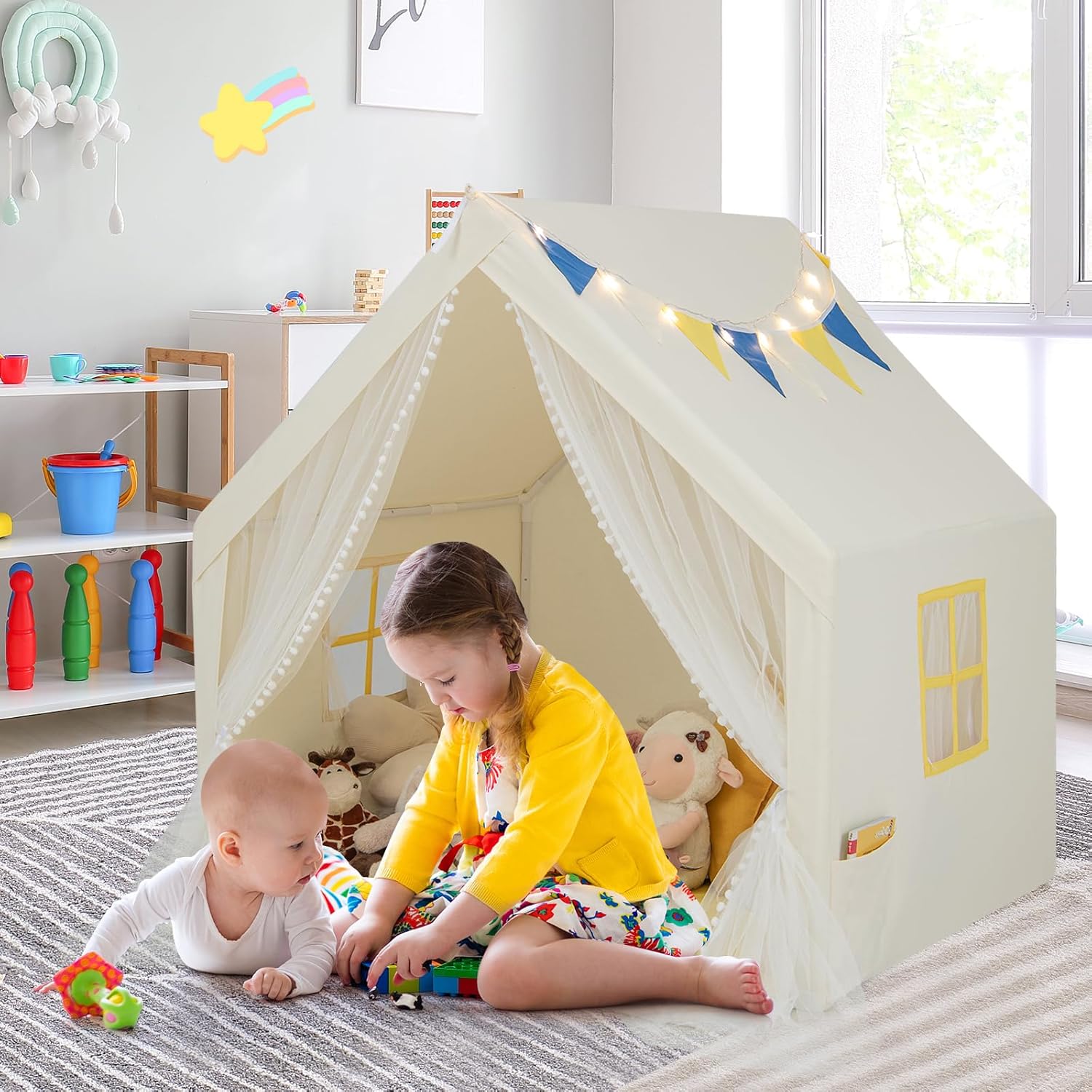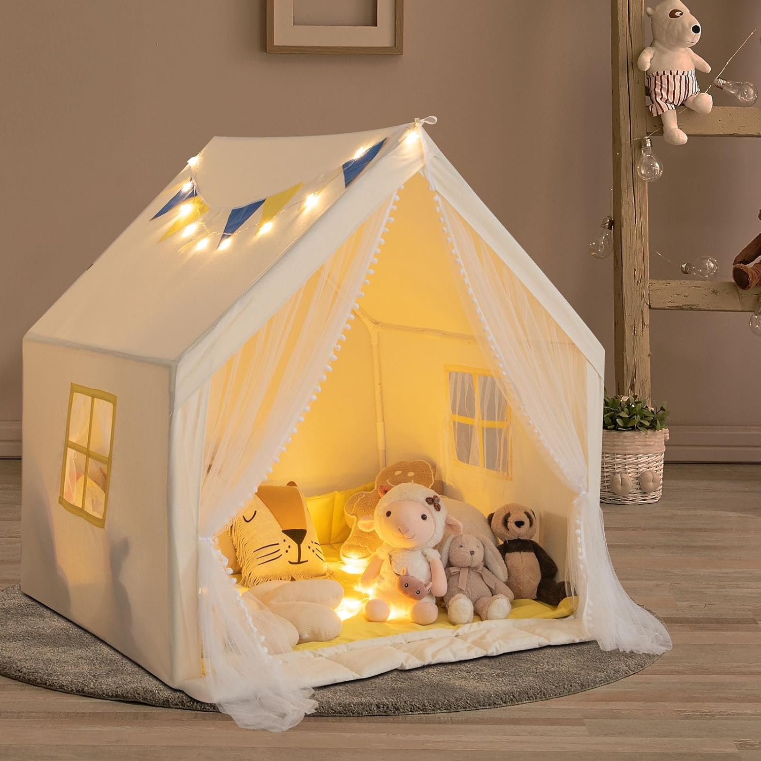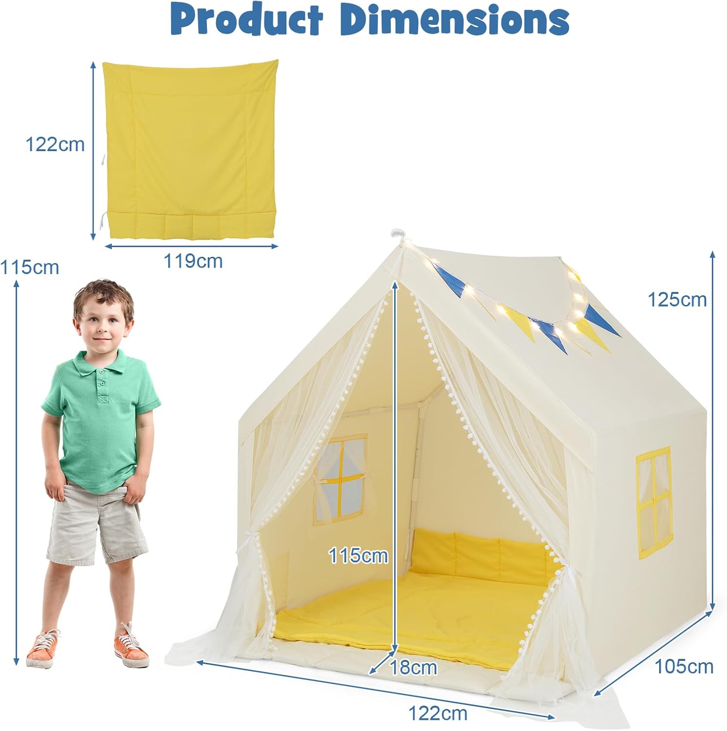 SPAZIO DI GIOCO CONFORTEVOLE E SPAZIOSO: La tenda da gioco per bambini offre uno spazio di gioco generoso di 122 x 105 x 125 cm (L x P x A), consentendo a 2 bambini di divertirsi per ore. Il suo design a forma di casa e il colore beige fresco o blu vibrante lo rendono un'aggiunta attraente a qualsiasi area giochi STRUTTURA ROBUSTA PER MASSIMA STABILITÀ: Il telaio di supporto in tubi di PVC spessi da 19 mm garantisce una stabilità e integrità strutturale ottimali della tenda per bambini. Il fondo piatto migliorato evita anche cadute quando i bambini entrano nella tenda MATERIALI DI QUALITÀ PER UN COMFORT OTTIMALE: Realizzata in resistente misto poliestere e cotone, la tenda gioco bambini è resistente alle lacrime e alle pieghe, garantendo un uso duraturo. Il tappeto in cotone morbido con bordi rialzati può anche fungere da cuscini per un comfort aggiuntivo durante il gioco o il riposo ACCESSORI GIOCOSI E ADORABILI: La casa da gioco per bambini è dotata di luci stellate, finestre con tende in mussola e bandierine decorative appese, aggiungendo un tocco di fantasia. Una tasca laterale permette un facile accesso agli oggetti piccoli DESIGN VERSATILE E MONTAGGIO FACILE: La tenda indiani per bambini può essere utilizzata come un comodo letto o come una divertente capanna per bambini da interno, con la possibilità di creare un'area sicura grazie al tessuto anteriore allegato. Il montaggio è semplice grazie alle chiare illustrazioni del manuale utente, senza necessità di attrezzi