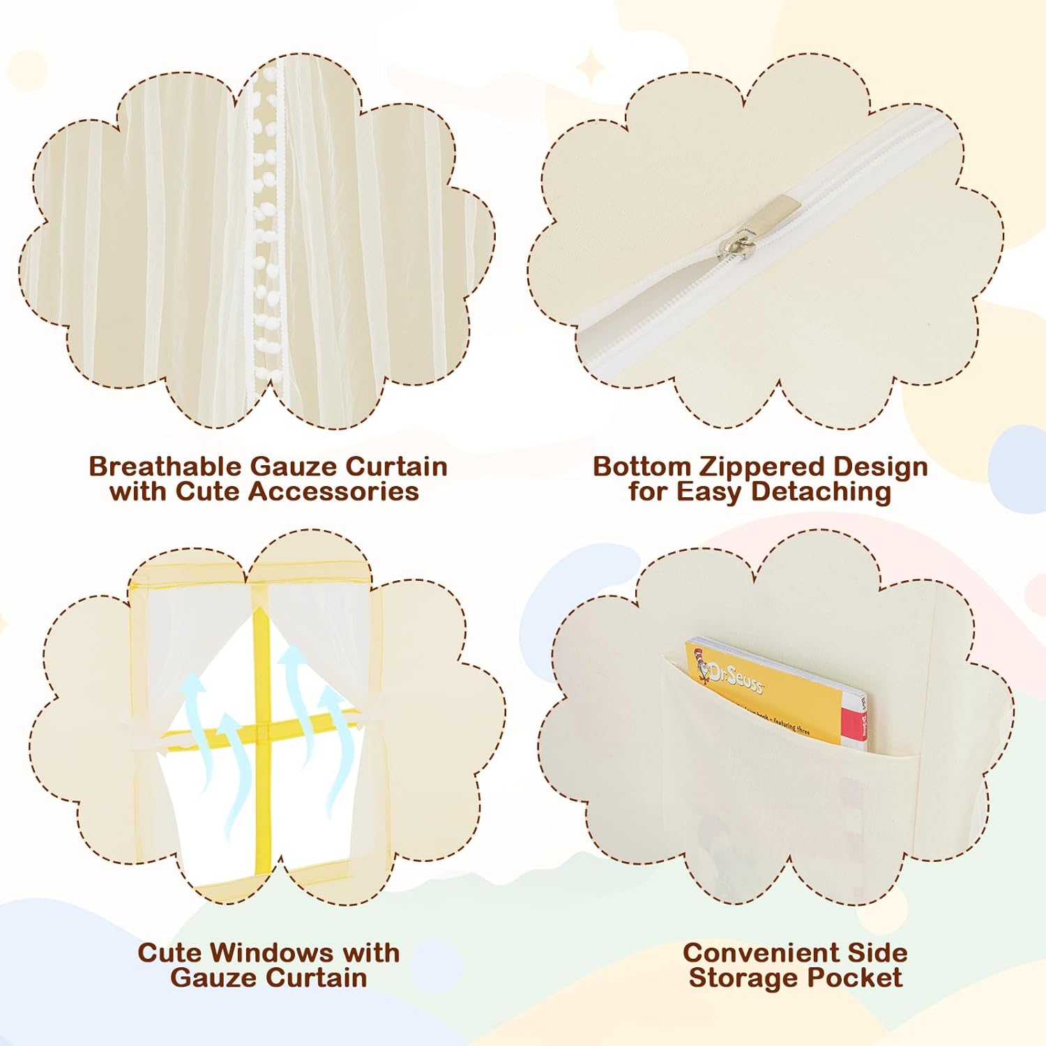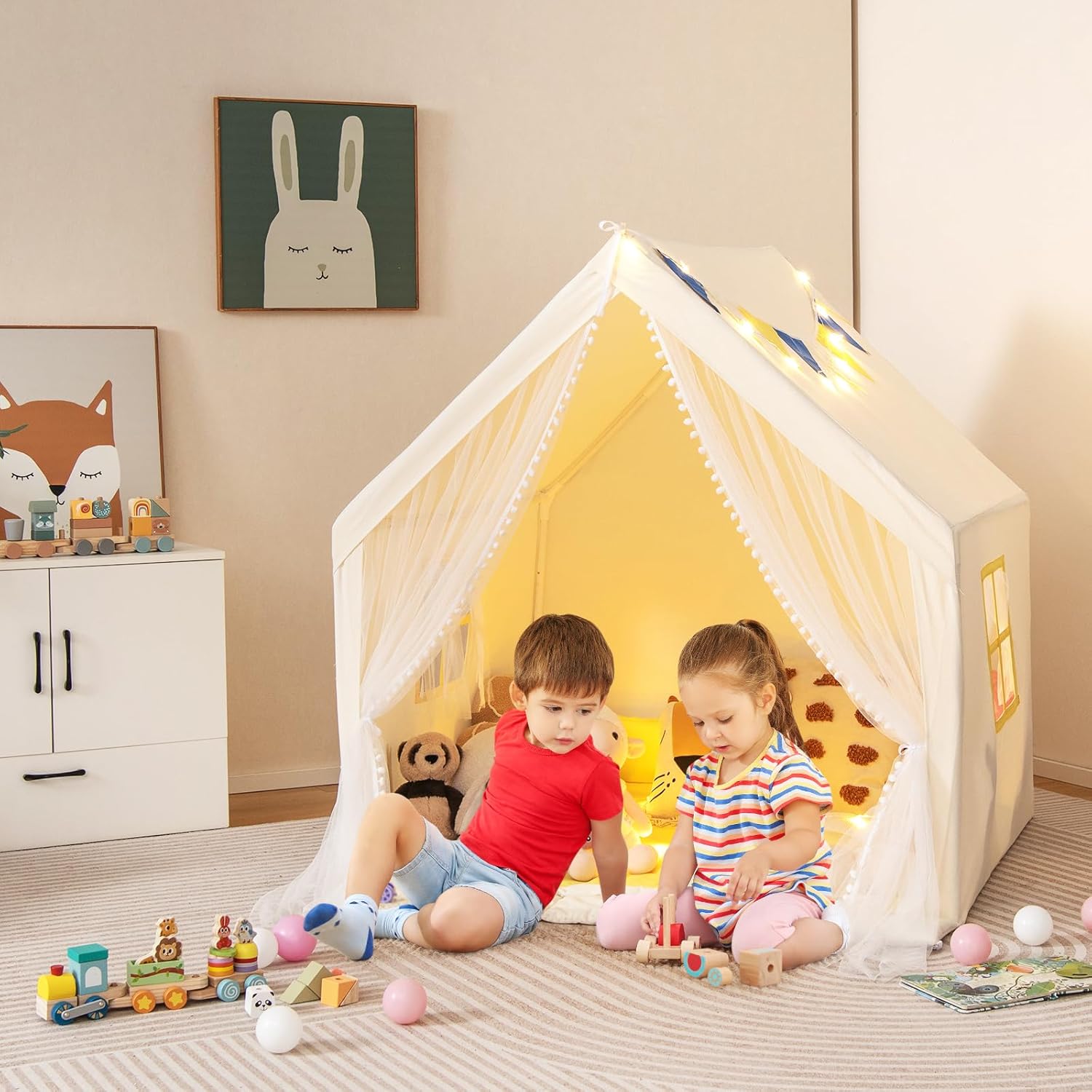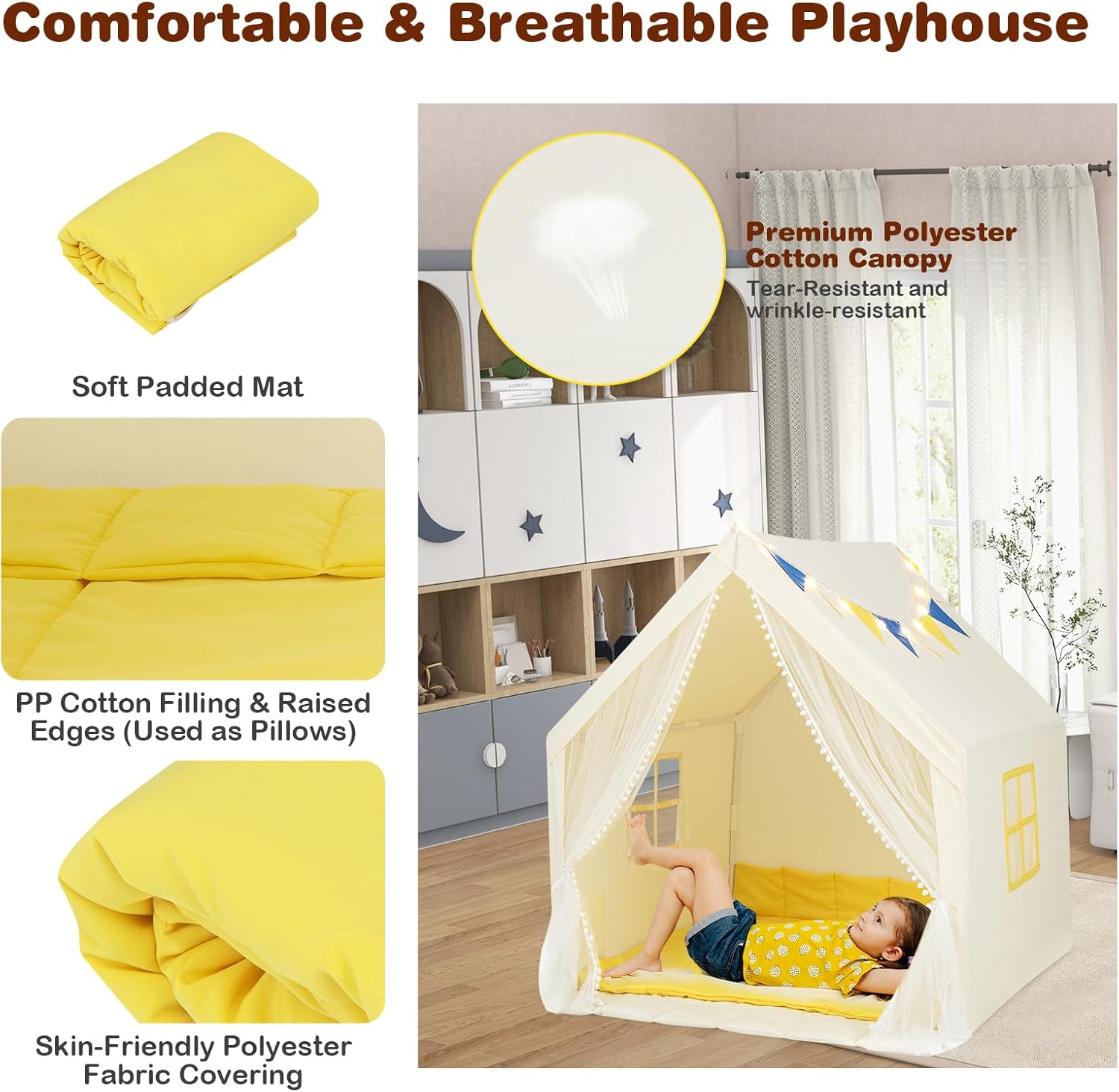 SPAZIO DI GIOCO CONFORTEVOLE E SPAZIOSO: La tenda da gioco per bambini offre uno spazio di gioco generoso di 122 x 105 x 125 cm (L x P x A), consentendo a 2 bambini di divertirsi per ore. Il suo design a forma di casa e il colore beige fresco o blu vibrante lo rendono un'aggiunta attraente a qualsiasi area giochi STRUTTURA ROBUSTA PER MASSIMA STABILITÀ: Il telaio di supporto in tubi di PVC spessi da 19 mm garantisce una stabilità e integrità strutturale ottimali della tenda per bambini. Il fondo piatto migliorato evita anche cadute quando i bambini entrano nella tenda MATERIALI DI QUALITÀ PER UN COMFORT OTTIMALE: Realizzata in resistente misto poliestere e cotone, la tenda gioco bambini è resistente alle lacrime e alle pieghe, garantendo un uso duraturo. Il tappeto in cotone morbido con bordi rialzati può anche fungere da cuscini per un comfort aggiuntivo durante il gioco o il riposo ACCESSORI GIOCOSI E ADORABILI: La casa da gioco per bambini è dotata di luci stellate, finestre con tende in mussola e bandierine decorative appese, aggiungendo un tocco di fantasia. Una tasca laterale permette un facile accesso agli oggetti piccoli DESIGN VERSATILE E MONTAGGIO FACILE: La tenda indiani per bambini può essere utilizzata come un comodo letto o come una divertente capanna per bambini da interno, con la possibilità di creare un'area sicura grazie al tessuto anteriore allegato. Il montaggio è semplice grazie alle chiare illustrazioni del manuale utente, senza necessità di attrezzi