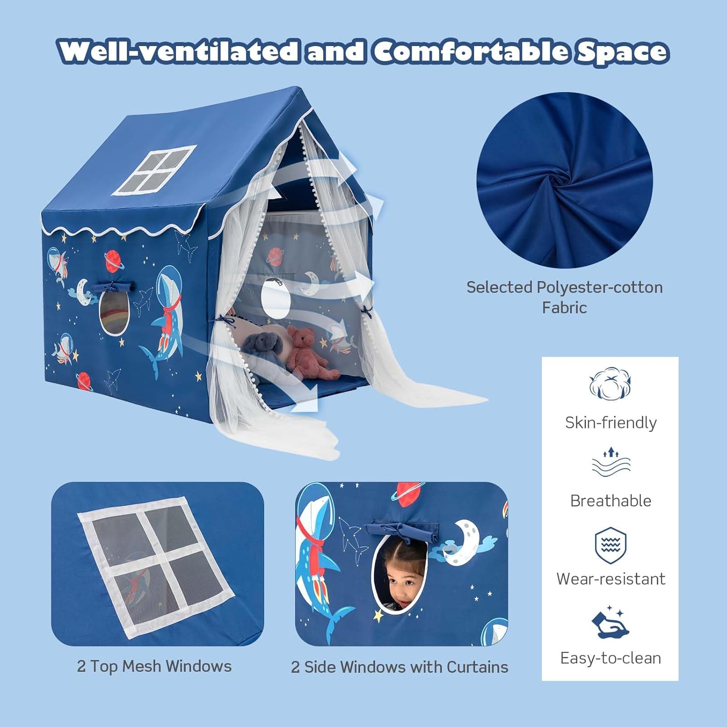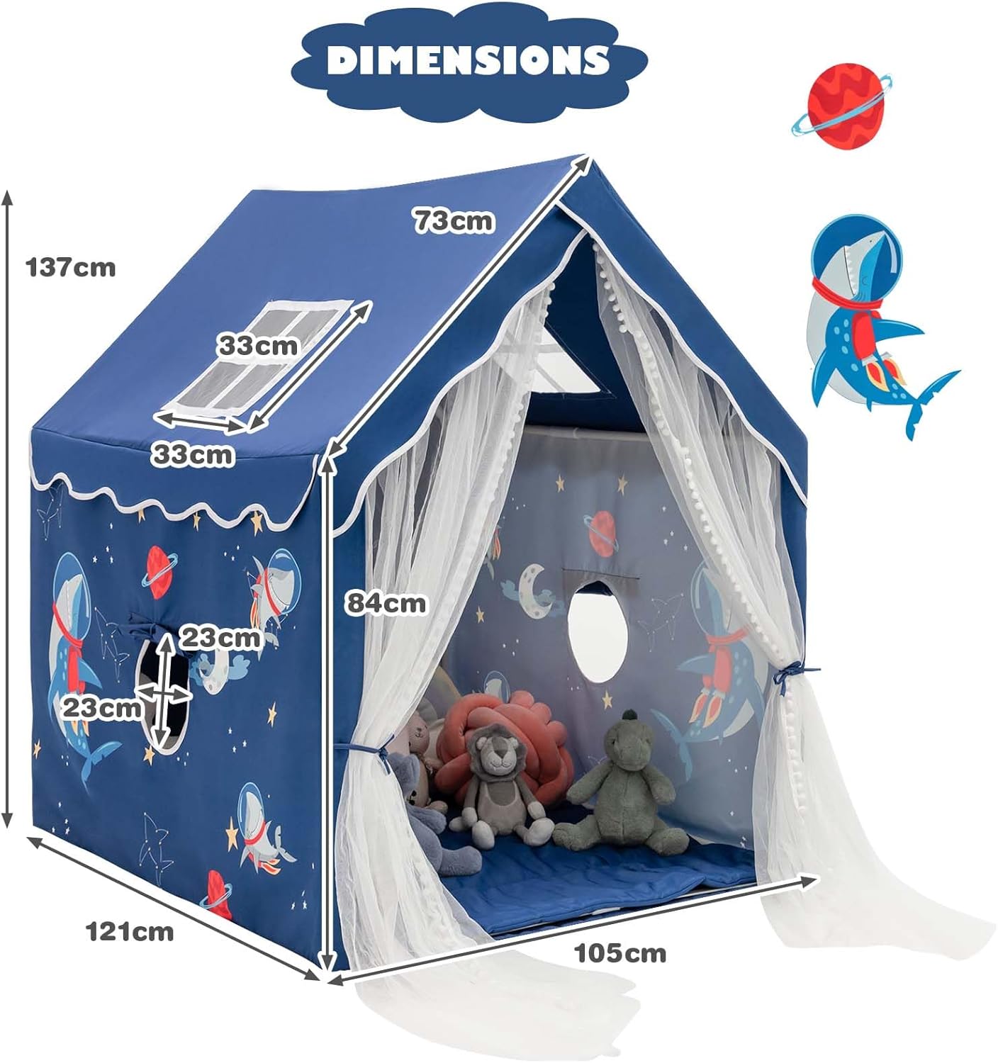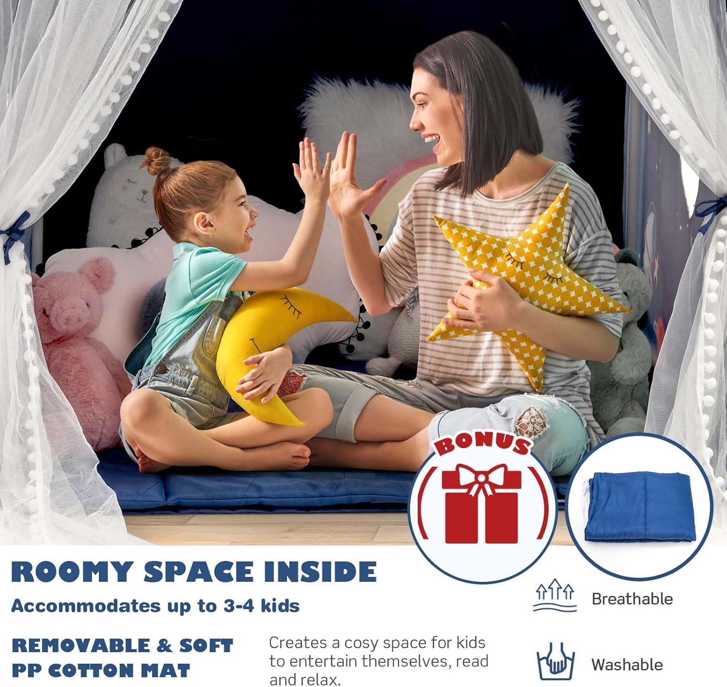 SPAZIOSO ED INCREDIBILE: La tenda per bambini misura generose 121 x 105 x 137 cm ed è abbastanza accogliente per 3-4 bambini che possono giocarci, leggere o anche fare un pisolino. I morbidi cuscini sono grandi 121 x 97 cm e garantiscono ancora più comfort ai bambini DESIGN CON EMOZIONANTE MOTIVO CARTOON: Il colorato motivo a cartone animato rende l'aspetto della tenda gioco bambini ancora più adorabile e attraente, perfetto per attività familiari e all'aperto. L'aspetto realistico della casa, con la delicata porta a griglia, crea uno spazio divertente e creativo per i bambini CONSTRUZIONE SICURA E ROBUSTA: La casa da gioco è realizzata in resistente tessuto di poliestere-cotone, combinato con robusti supporti in PVC e design della struttura triangolare per garantire stabilità e sicurezza della tenda bambini cameretta. Leggero e compatto, con un peso netto di soli 4 kg, è facile da trasportare e da spostare DESIGN CON MULTIPLA VENTILAZIONE: Questa capanna per bambini da interno ha 4 finestre in rete, di cui 2 finestre superiori e 2 finestre laterali con design a tendina, che favoriscono efficacemente la circolazione dell'aria e rendono la tenda da gioco per bambini più ventilata e fresca REGALO PERFETTO CON GRANDE VALORE: La casetta tenda per bambini non è solo un ottimo regalo per i bambini, ma è adatta anche ai bambini dai 1 anno in su. Un design strutturale perfetto e materiali durevoli creano un bellissimo e misterioso paradiso per i bambini dove giocare, imparare ed esplorare
