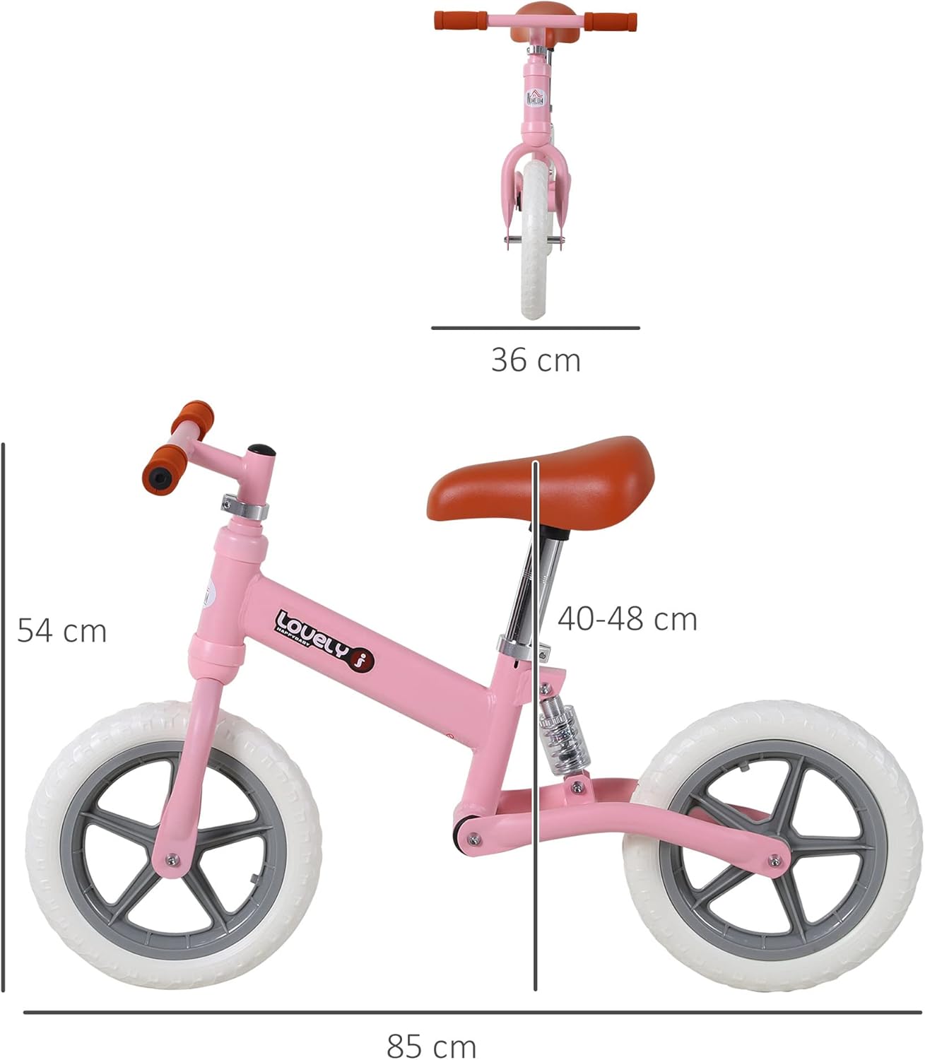 LEARNING BIKE: Helps your child get to grips with the basics before using a proper bike, such as balance, hand and eye coordination. A fun and colourful piece that will encourage them to learn. METAL FRAME: Low slung for your sweetie to get on and off easily, this baby balance bike forms a tough core which supports them as they learn. ADJUSTABLE SEAT: This kids balance bike ensures they are properly seated, with soft-grip handlebars for them to hold and safely and comfortably. TWO SAFE TYRES: Non-slip for a smooth and safe ride, working with the shock absorber for a smooth ride which no sudden shocks or bumps. DIMENESIONS: 54H x 85L x 36Wcm. Seat: 40-48Hcm. MAXIMUM LOAD WEIGHT 25KG. FOR AGES 2-5 YEARS. ASSEMBLY REQUIRED.