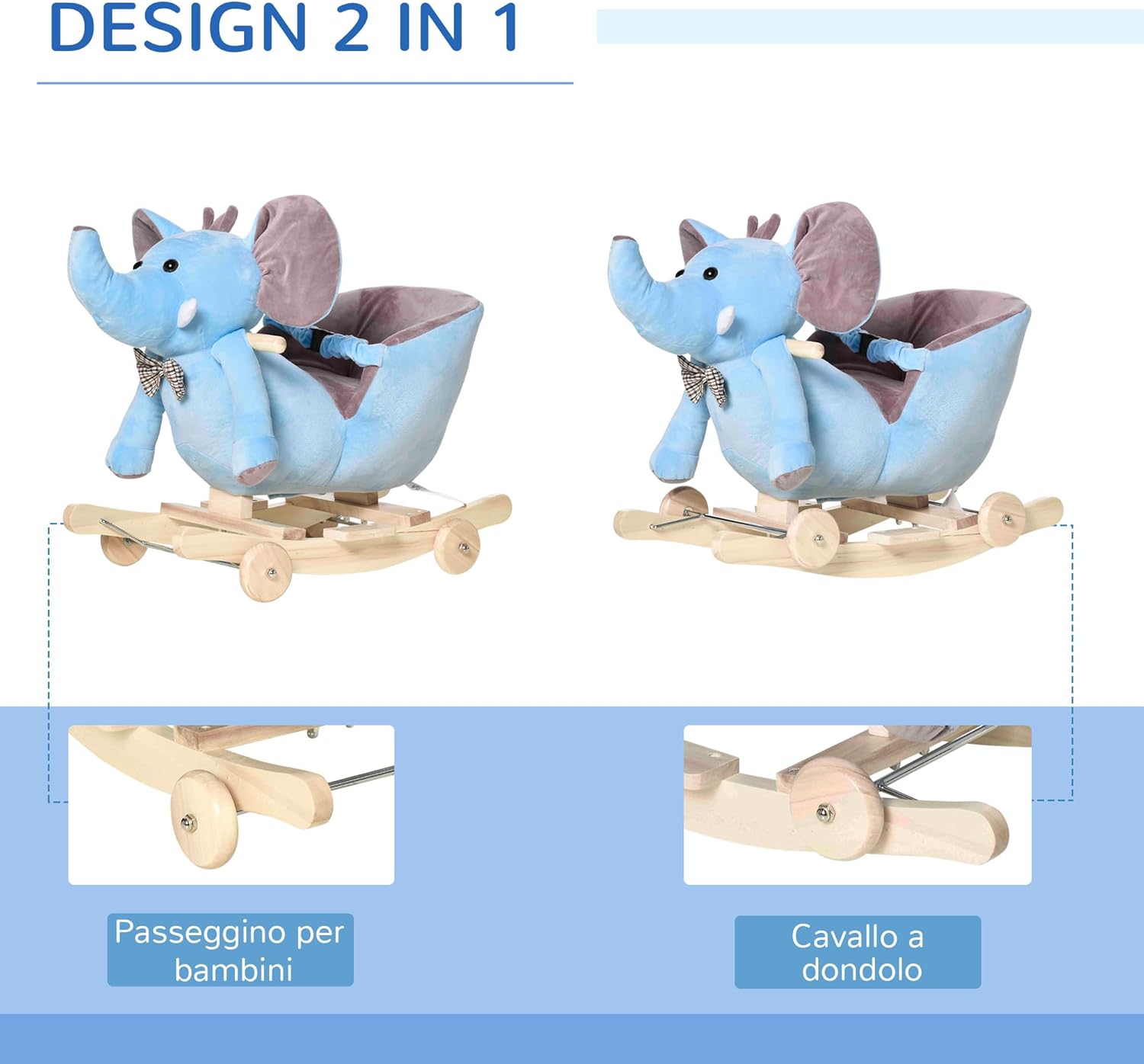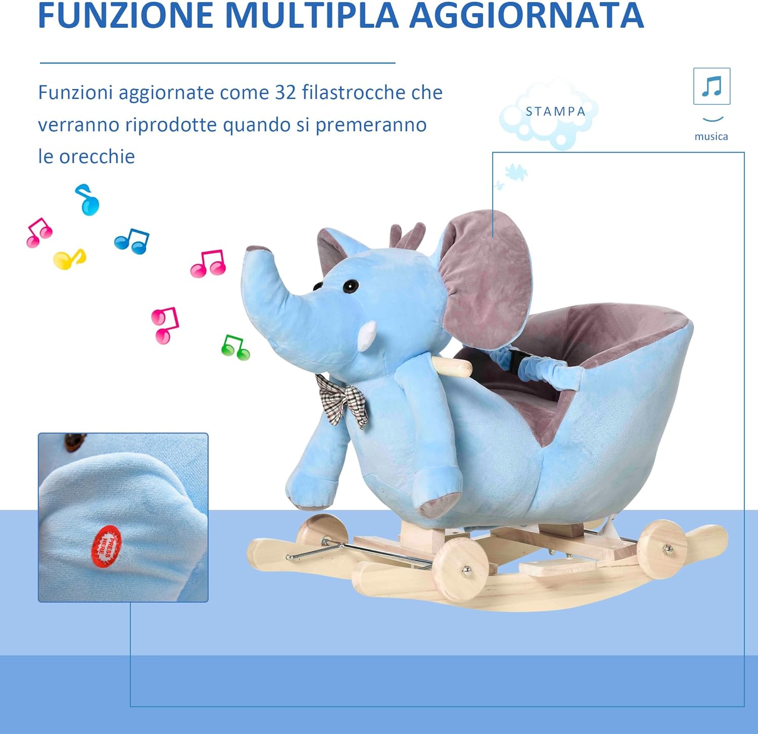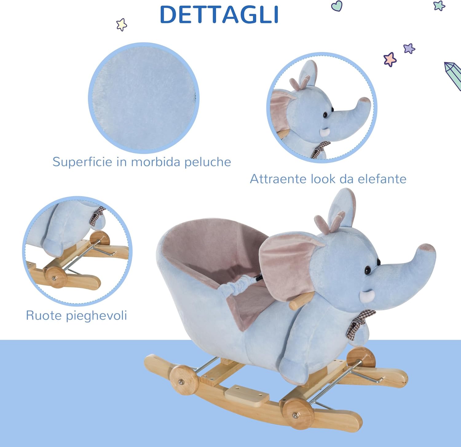 DESIGN 2 IN 1: Il nostro animale a dondolo presenta pattini dei binari lisci e 4 rotelle pieghevoli, fungendo così sia da cavallo a dondolo che da trasporto. Un solo acquisto per due diverse funzionalità ACCOMPAGNAMENTO SONORO: Questo elefante a dondolo dalle funzionalità moderne è dotato di 32 canzoncine che verranno riprodotte premendo le orecchie (2 batterie AA incluse) RIVESTIMENTO IN PELUCHE: Il corpo in peluche morbido e la maniglia anteriore ergonomica del cavallo a dondolo offrono un'esperienza realistica di gioco per tutti i bimbi dai 18 mesi in su MOVIMENTO SICURO E DELICATO: Le rotelle lisce e la cintura di sicurezza del dondolo per bambini garantiscono la massima tranquillità in ogni momento del gioco, permettendo al tuo bambino di divertirsi senza rischi DIMENSIONI: Dimensioni complessive: 60L x 35P x 45A cm. Montaggio richiesto