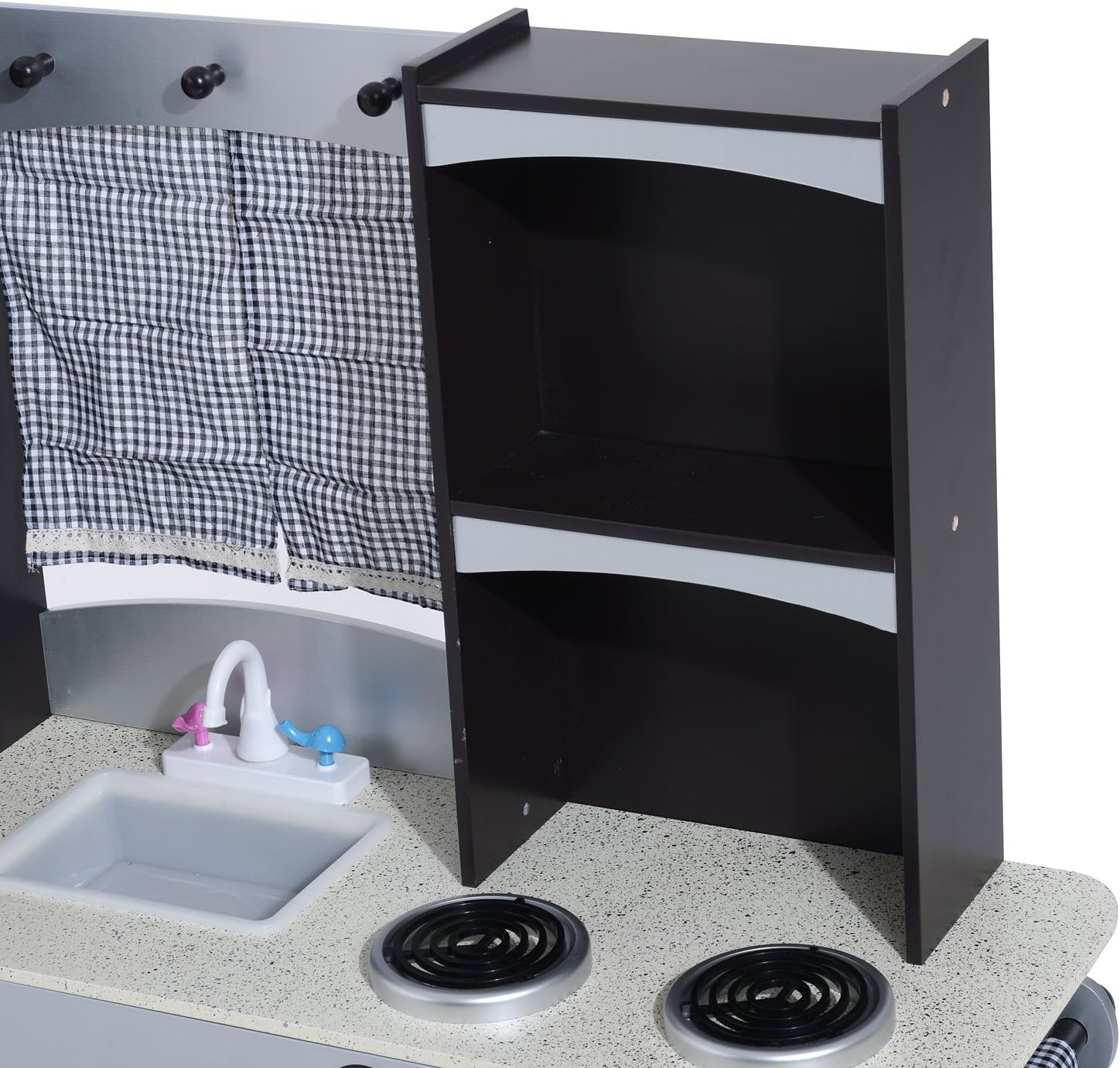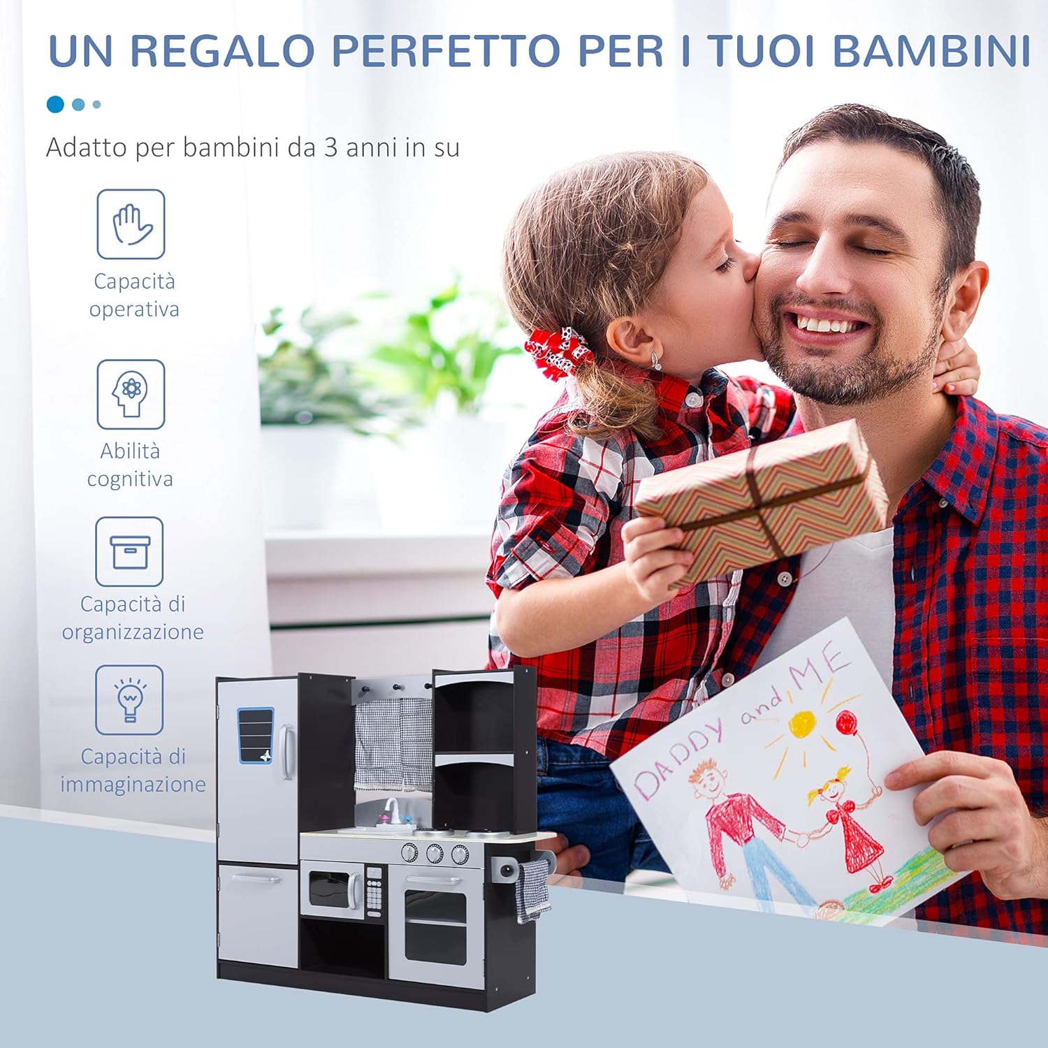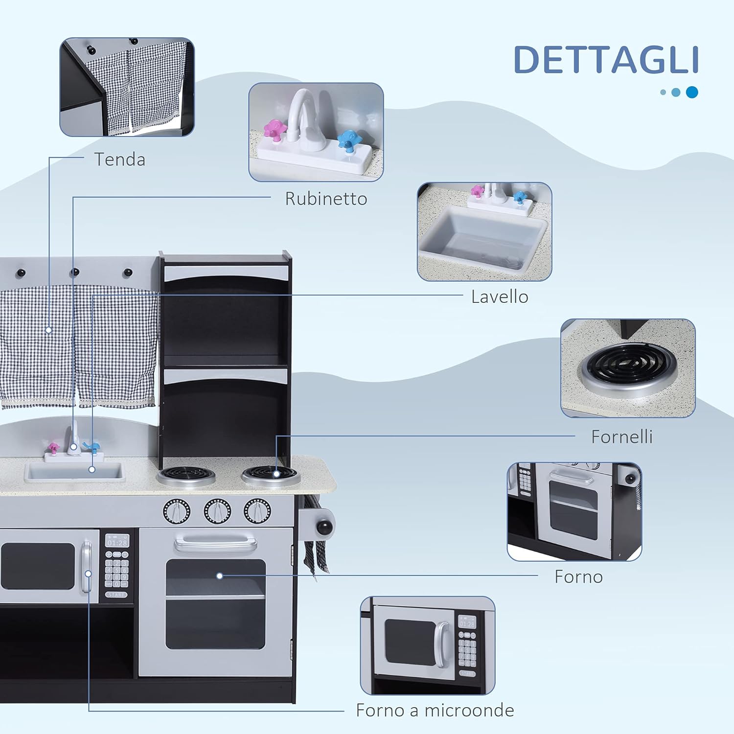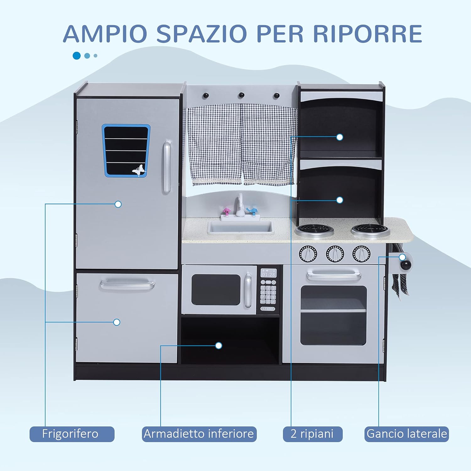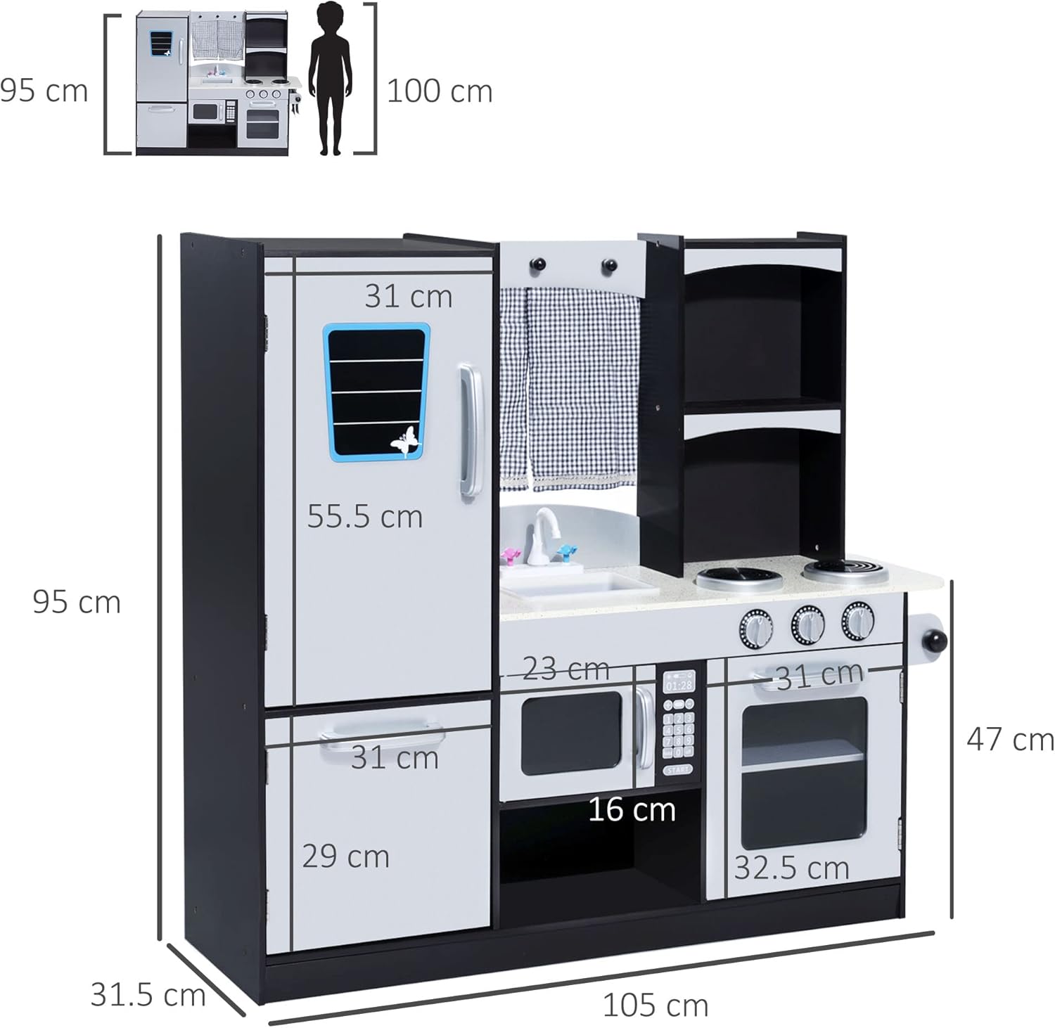 SET DA GIOCO COMPLETO: Cucina giocattolo con una varietà di gadget come frigorifero, microonde, forno, fornelli, lavandino con rubinetto, congelatore. SICURO: Finiture atossiche e materiali sicuri per i bambini. Prodotto di alta qualità con certificazioni EN71-1-2-2-3, ASTMF963, CPSIA. DIVERTIMENTO REALISTICO: Viene fornito con un paio di tende e un piccolo canovaccio. Le porte di forno, microonde e frigorifero sono trasparenti, proprio come nella vita reale! INCORAGGIA LA CREATIVITÀ: Migliora l'immaginazione dei tuoi bambini e incoraggia lo sviluppo cinestesico, attraverso il gioco di ruolo e lo sviluppo cognitivo. Adatto per bambini di età superiore ai 3 anni. DIMENSIONI: 105L x 31.5P x 95Acm. Dimensioni lavello: 18L x 13.5Pcm. Dimensioni microonde: 23L x 16Pcm. Dimensioni forno: 31L x 32.5Pcm. Peso netto: 21kg