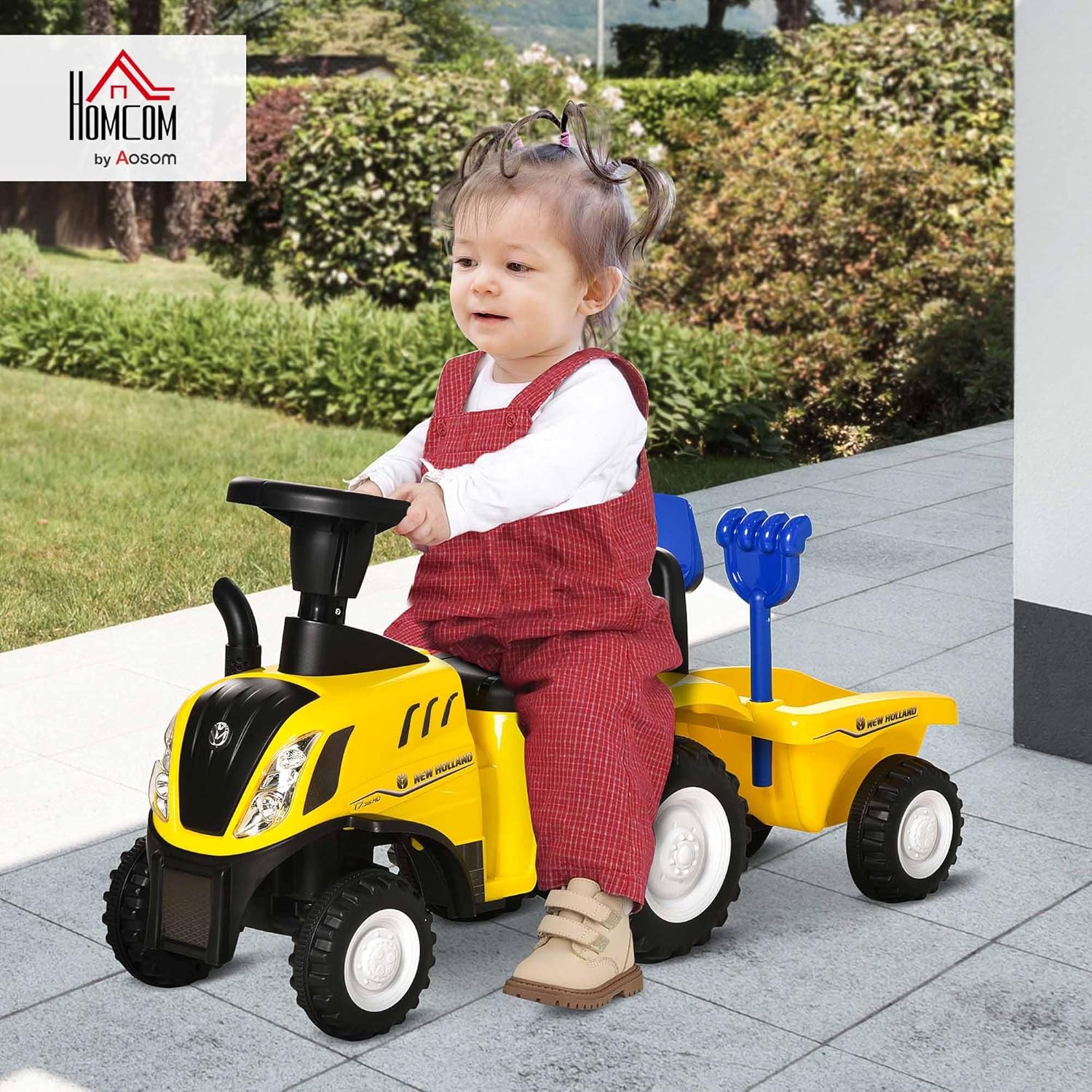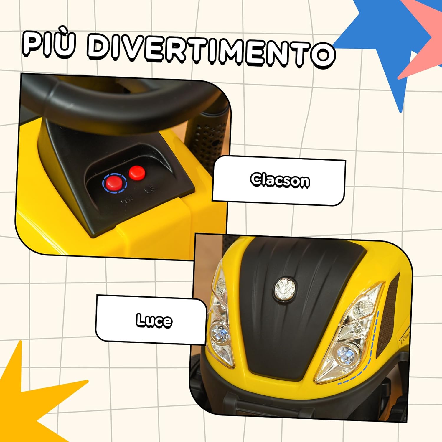 DESIGN 2 IN 1: Il design del gioco cavalcabile favorisce lo sviluppo della muscolatura dei bambini mentre si muovono. È un gioco ideale anche per imparare a camminare e con gli accessori inclusi i bimbi possono divertirsi a giocare con terra e sabbia. MULTIFUNZIONE: Questo trattore giocattolo cavalcabile è dotato di clacson, luci e rimorchio, per dare tante opzioni di gioco ai più piccoli. DESIGN SICURO: Il trattore cavalcabile non ha bisogno di batterie e il movimento avviene a spinta. Il grande volante aiuta i bambini a controllare facilmente la direzione. CONFORTEVOLE: Lo schienale della seduta in PP con design ergonomico offre un sostegno ottimale ai bambini mentre giocano. DIMENSIONI: Dimensioni generali: 91L x 29P x 44Acm. Dimensioni seduta: 18L x 17P x 25Acm (altezza da terra), Capacità di peso: 25kg. Età consigliata: 12-36 mesi. Nota: sono necessarie 2 batterie AA (non incluse).