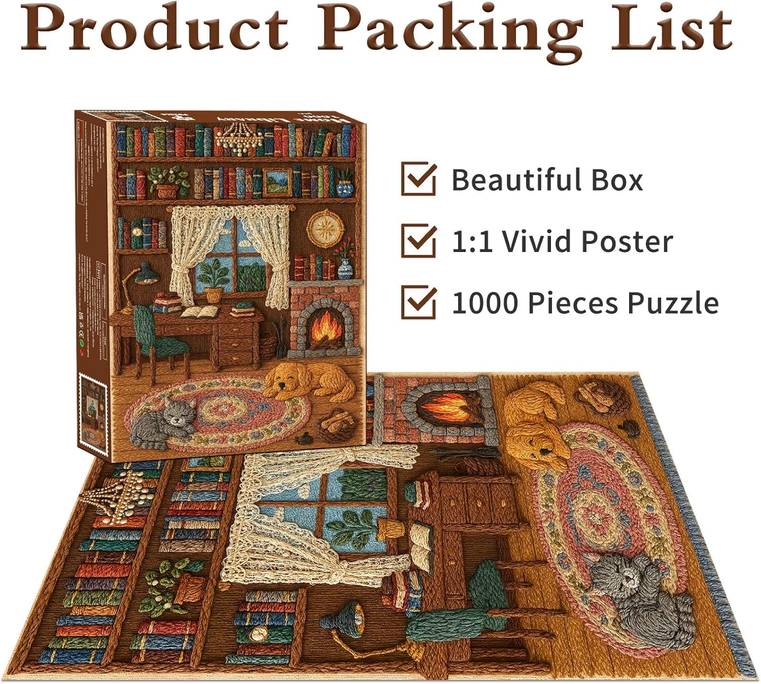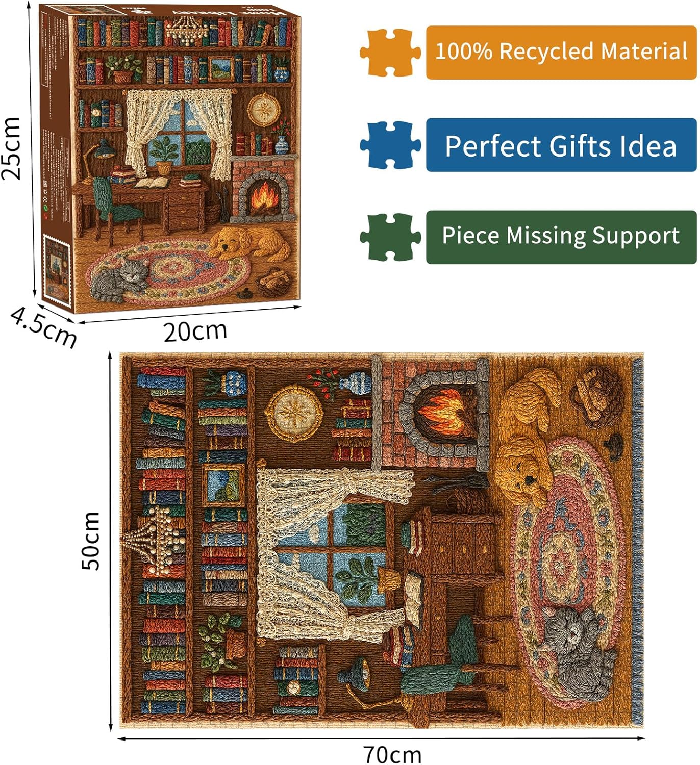 Immagine: questa immagine affascinante mostra un'accogliente scena di biblioteca progettata interamente nello stile del filo o dell'arte del ricamo. Un caminetto scoppiettante diffonde una luce calda attraverso la stanza, dove un cane dorato e un gatto grigio riposano pacificamente su un tappeto intrecciato colorato. Materiale di alta qualità: i nostri puzzle per adulti sono tagliati con precisione da carta resistente, riciclata al 100%, non tossica, resistente e durevole. Un ulteriore poster puzzle antiriflesso e bordi arrotondati privi di polvere sono sicuri per i tuoi piccoli. Perché giocare ai puzzle: momenti consapevoli quotidiani