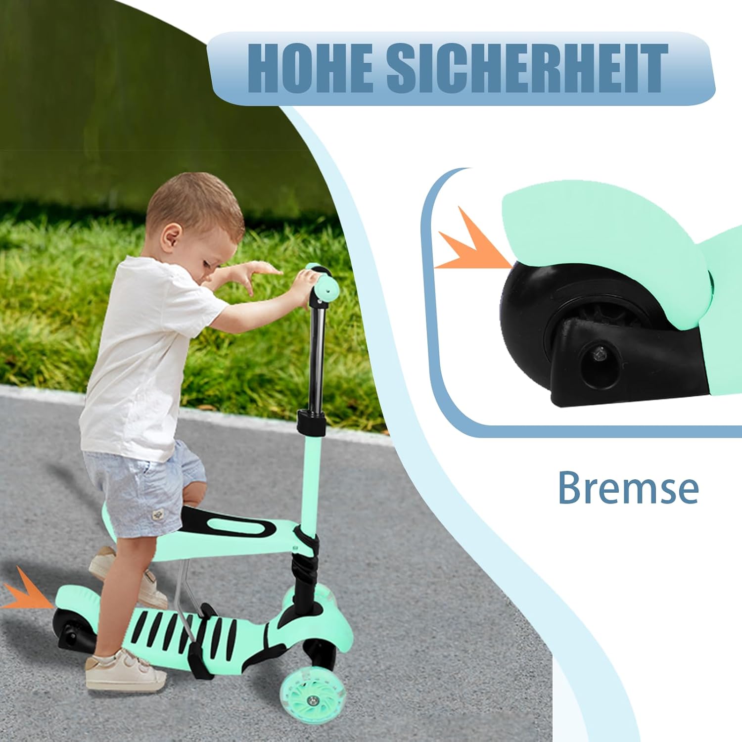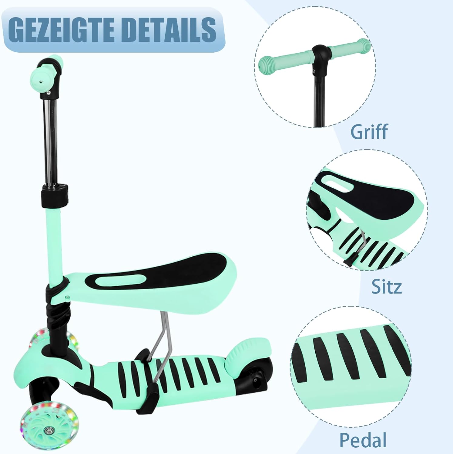 Multifunzione e regolazione: Sedile rimovibile per 3 modalità di gioco (in piedi/seduto/corsa). Regolazione in altezza a 3 livelli (68-73-78 cm) per bambini dai 2 agli 8 anni. Sicurezza premium: Telaio in alluminio rinforzato + ruote luminose a LED da 5 cm. L'ampio assale anteriore e la struttura triangolare impediscono il ribaltamento. Robusta capacità di carico: telaio da 80 kg e carico del sedile da 20 kg. Base in nylon rinforzato e protezione frontale ammortizzante. Design intelligente: Sterzo a gravità per curve stabili. Pieghevole per riporre e trasportare in poco spazio. Comfort e durata: Sedile ergonomico e senza sbavature. Ruote magnetiche a LED (senza batteria) + pneumatici in PU ammortizzanti.