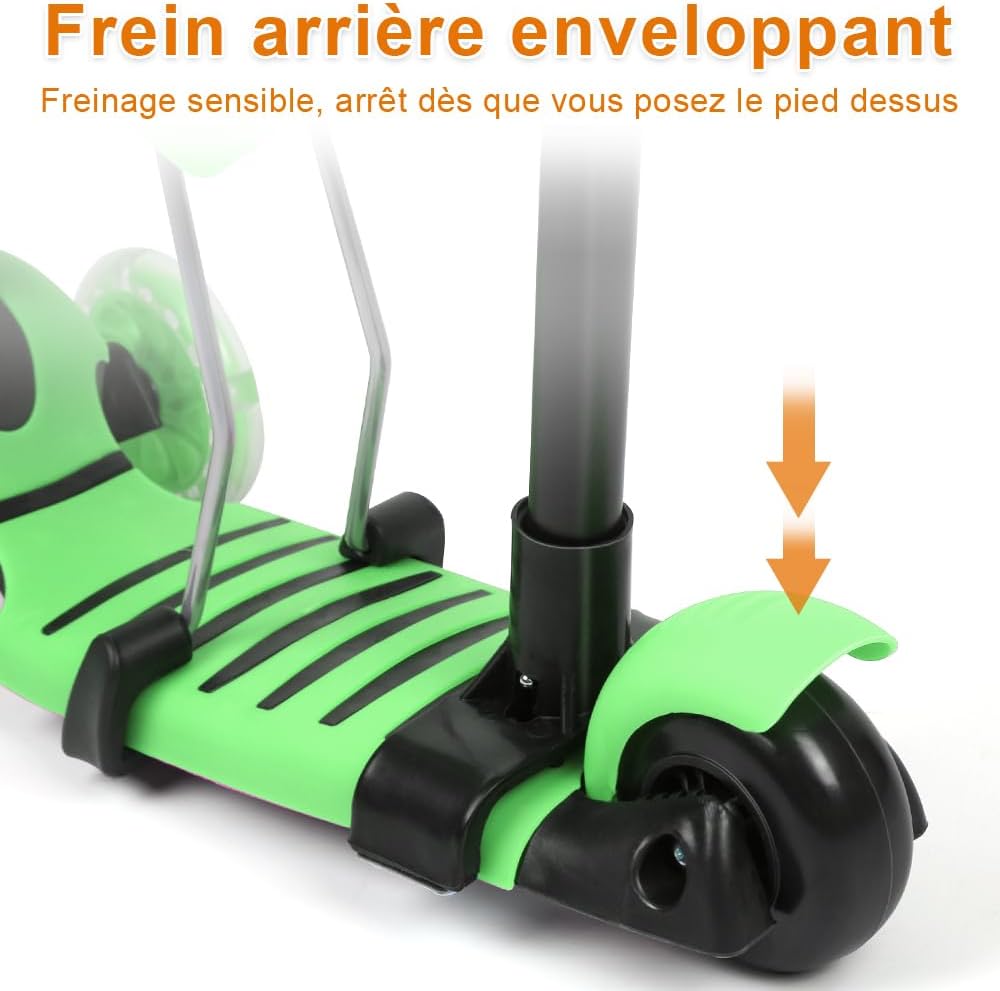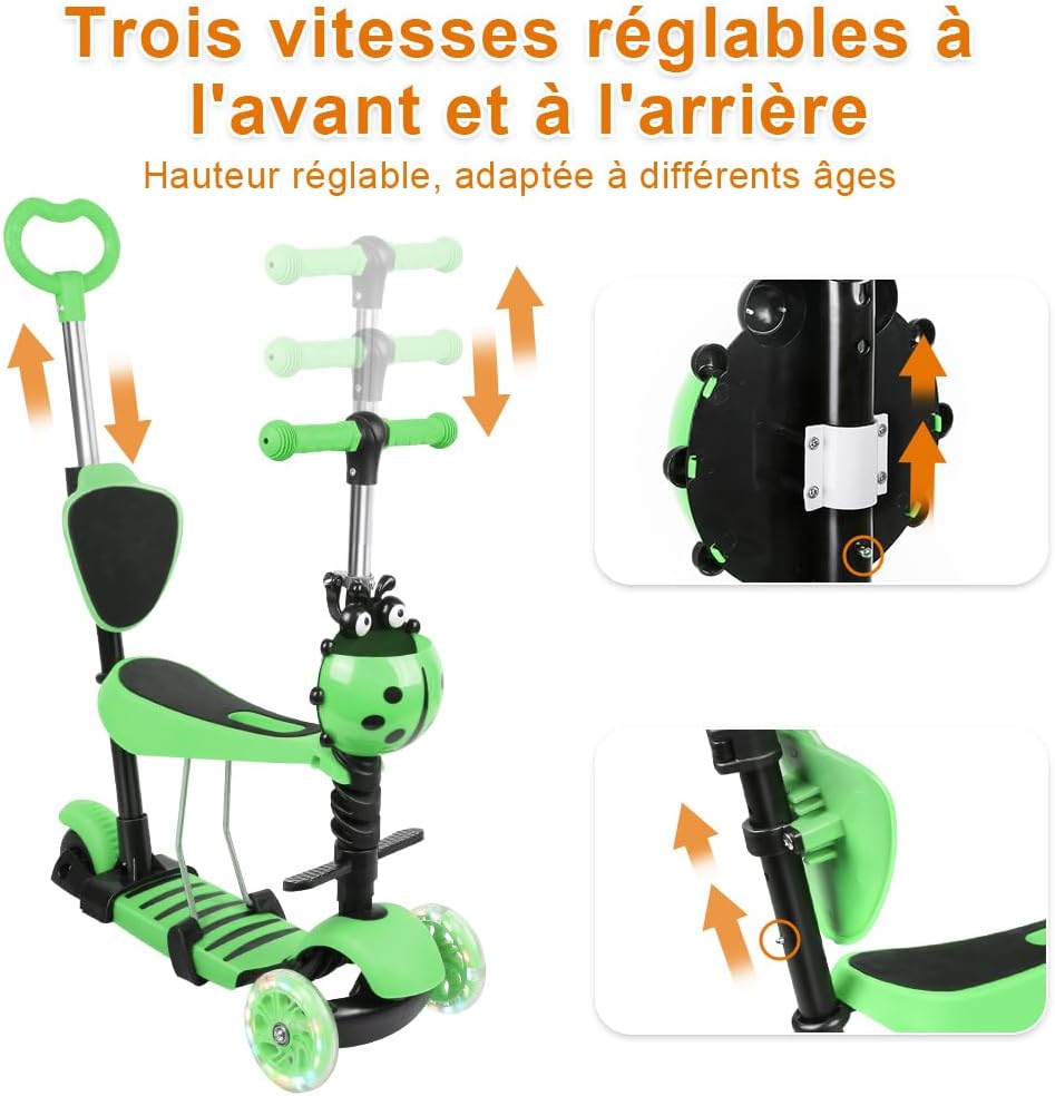 Sicurezza rinforzata: struttura in lega di alluminio resistente con base in nylon, supporta fino a 20 kg sul sedile e 50 kg per il veicolo, garantendo stabilità e durata. Ruote versatili: ruote LED silenziose e larghe da 5 cm realizzate in resistente PU con illuminazione magnetica senza batteria, per una guida fluida e divertente. Modalità regolabili: si trasforma in monopattino, sedile o passeggino in piedi, con sedile rimovibile e manubrio regolabile a 3 altezze (58-66 cm) per adattarsi alla crescita del bambino. 【Costruzione stabile】Doppia chiusura, maggiore spaziatura delle ruote anteriori e struttura triangolare per una migliore stabilità in curva senza rischio di ribaltamento. Comodo trasporto: design pieghevole con maniglia integrata, dimensioni compatte (60 x 27 x 16 cm) e peso leggero (3,8 kg) per riporlo e trasportarlo facilmente.