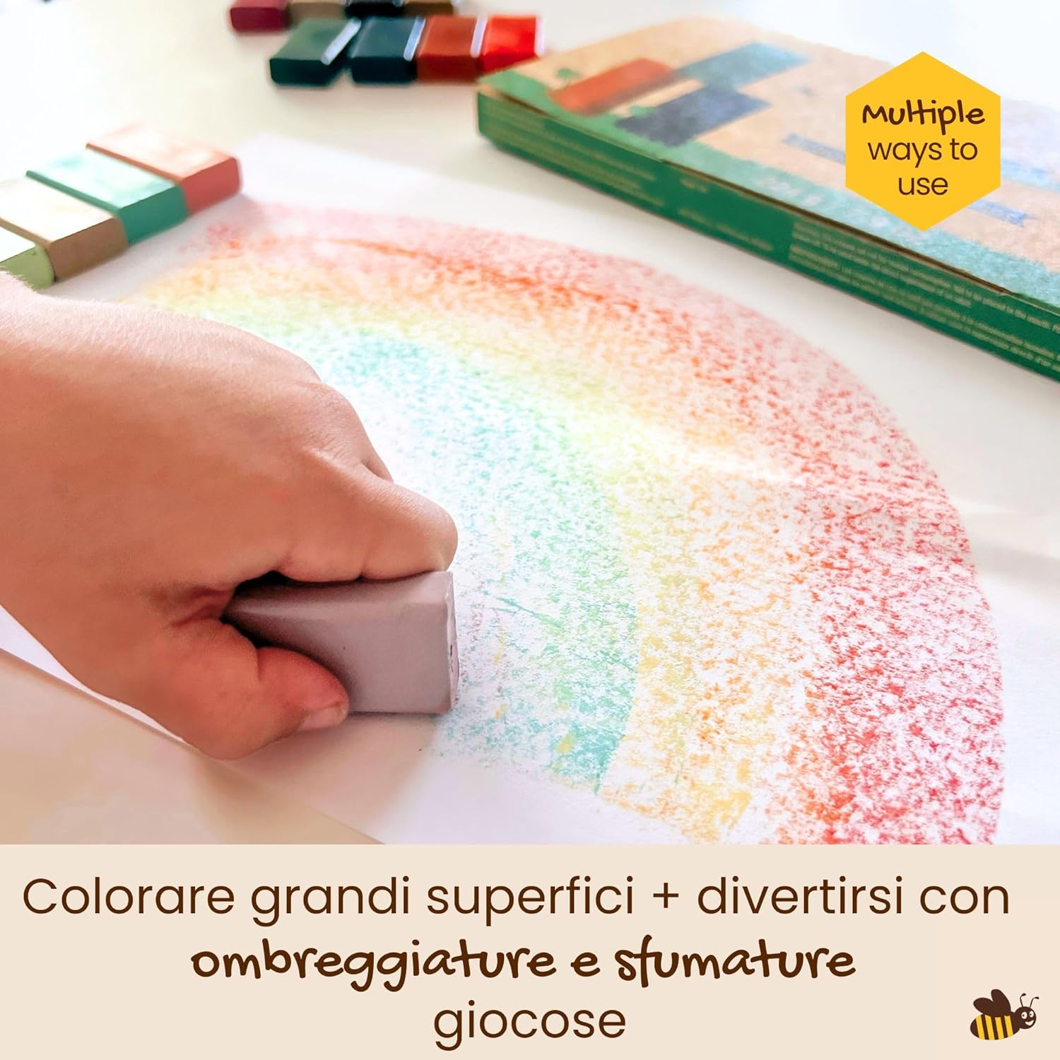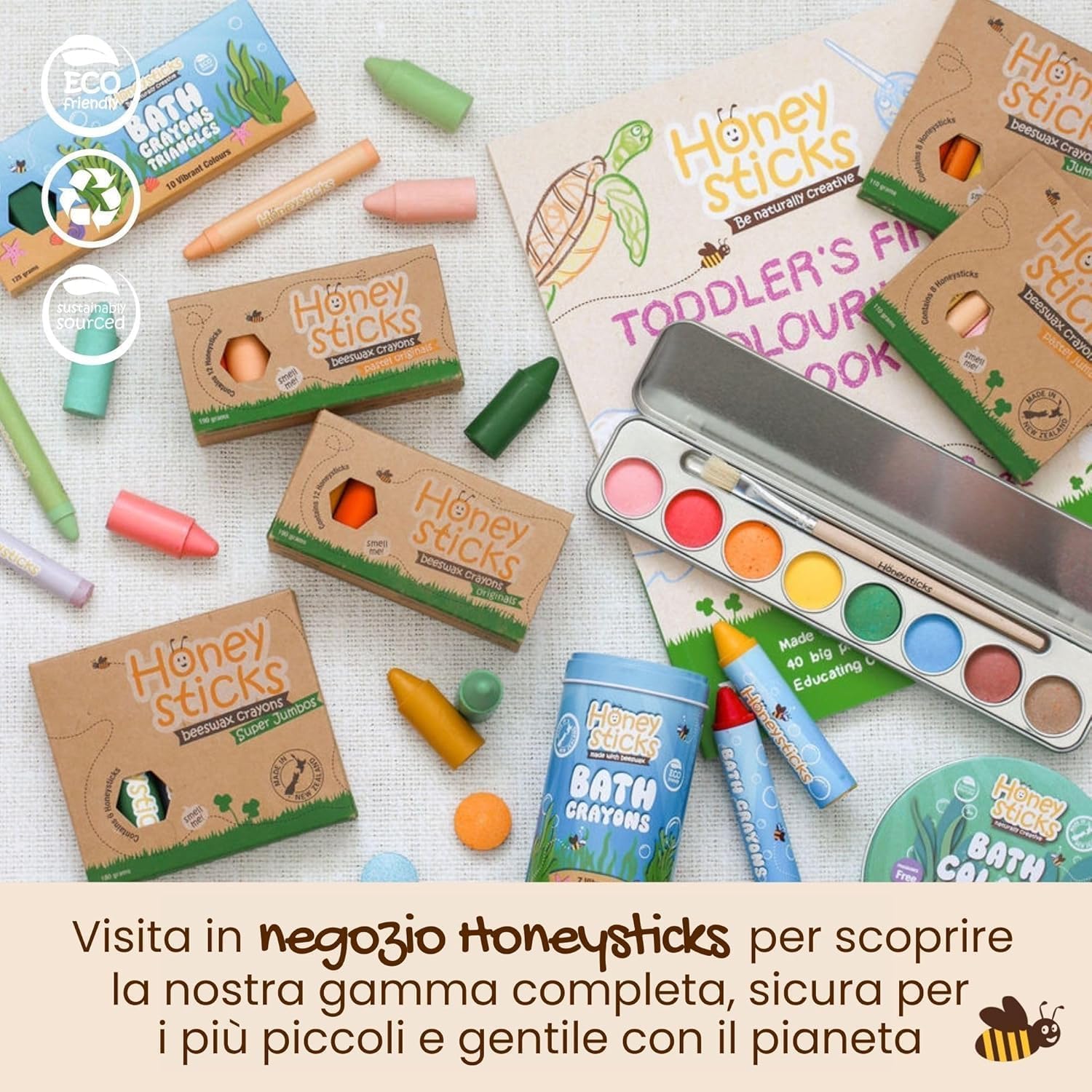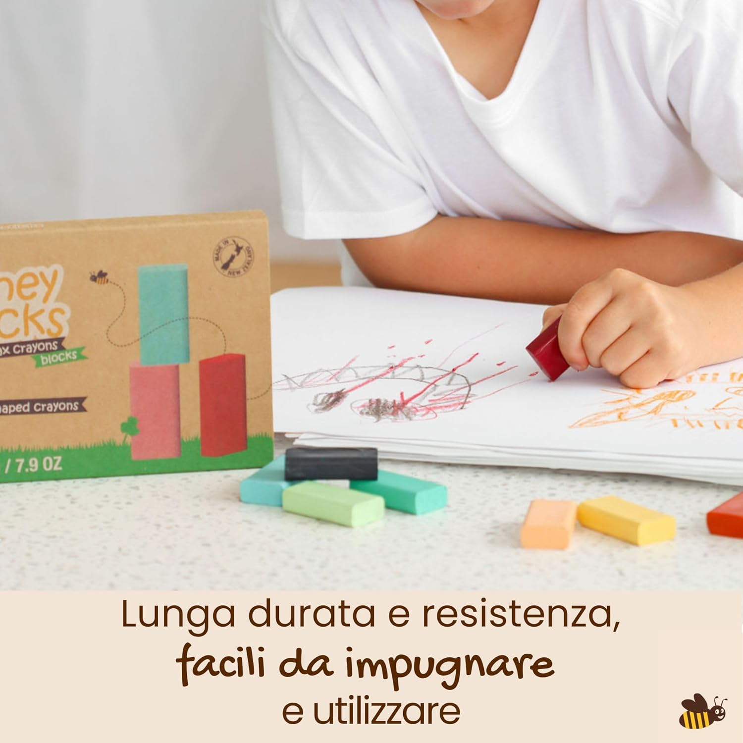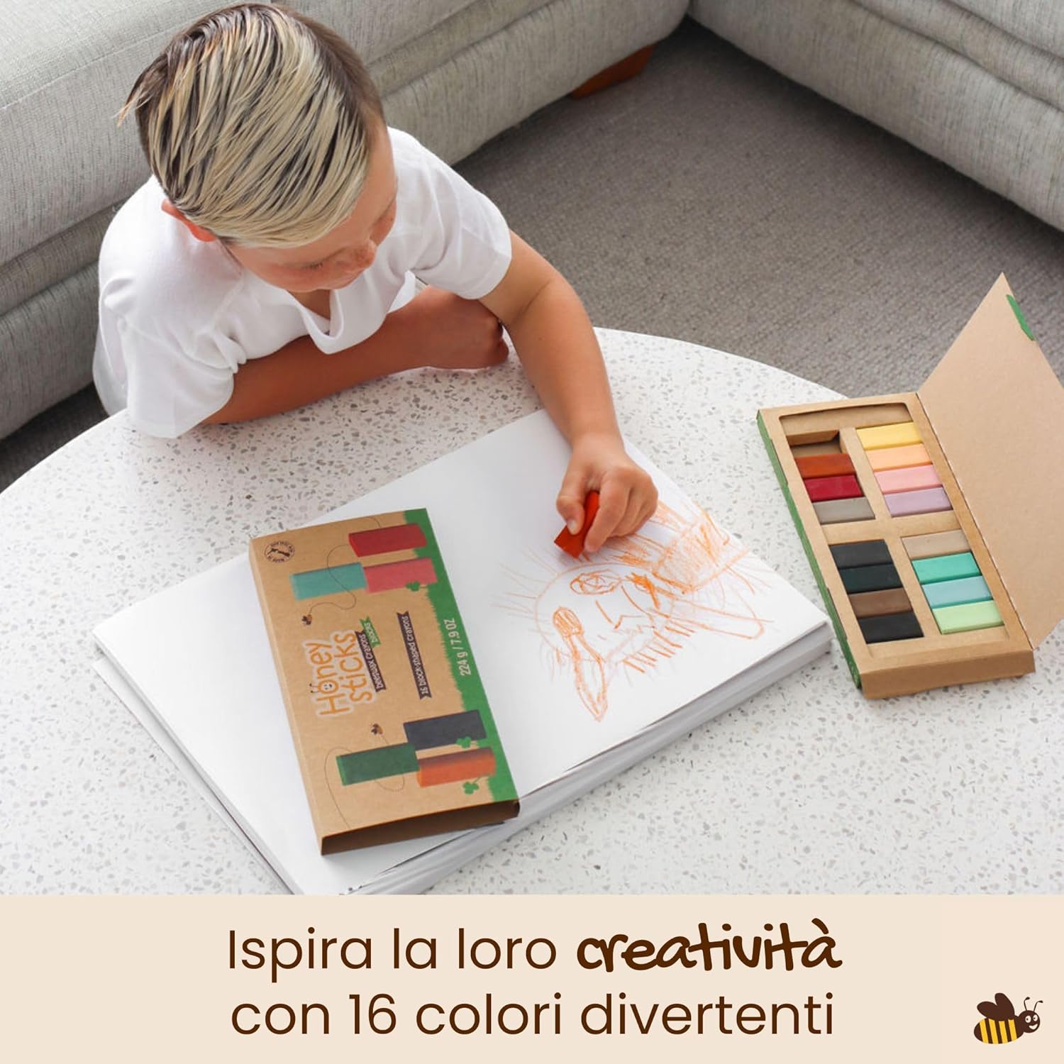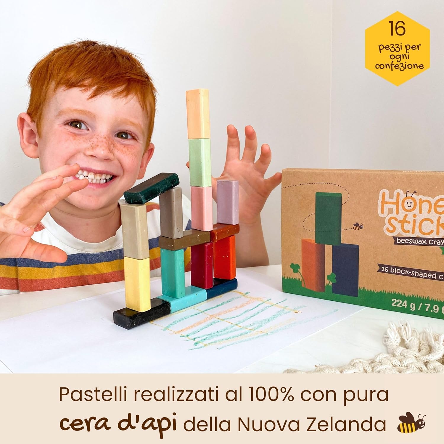 PUREZZA DI CUI TI PUOI FIDARE: realizzato a mano in Nuova Zelanda utilizzando cera d'api naturale e pigmenti per uso alimentare per il colore. Realizzato senza cera di parrafin a base di petrolio e riempitivi brutti che vengono utilizzati per fare altri pastelli. Sentirai e sentirai l'odore della differenza Honeysticks - nessun residuo ceroso, nessun odore chimico... solo il profumo naturale della pura cera d'api! SBLOCCA IL LORO POTENZIALE CREATIVO: questi pastelli a cera d'api a forma rettangolare aiuteranno il tuo bambino a esplorare il loro potenziale artistico oltre i pastelli a punta, colorano grandi aree, esplorare vari angoli di disegno e godere di sfumature e miscelazioni giocose, perfetti per principianti e artisti più avanzati LUNGA DURATA E DUREVOLE: i nostri grandi pastelli sono costruiti per durare e resistono a ore di colorazione, ombreggiatura e maneggevolezza ruvida. Ogni blocco di pastelli misura 4,6 cm di altezza, 2,1 cm di larghezza e 1,1 cm di spessore. Confezionato in una scatola resistente per conservare al sicuro quando non in uso a casa o in classe. 16 COLORI ENTUSIASMANTI PER UNA VARIETÀ ANCORA MAGGIORE: Honeysticks sono gli unici pastelli a blocco ad avere sia colori classici che colori pastello per una maggiore varietà. I nostri pastelli impilabili colorano bene, si trasferiscono facilmente sulla carta creando grandi esperienze di colorazione per il tuo bambino. CREATIVITÀ SICURA PER I BAMBINI E PER IL PIANETA: la nostra missione in Honeysticks è creare prodotti sicuri e sostenibili che stimoleranno la creatività del tuo bambino nei primi anni importanti. Esplora il nostro negozio oggi per scoprire l'intera gamma.
