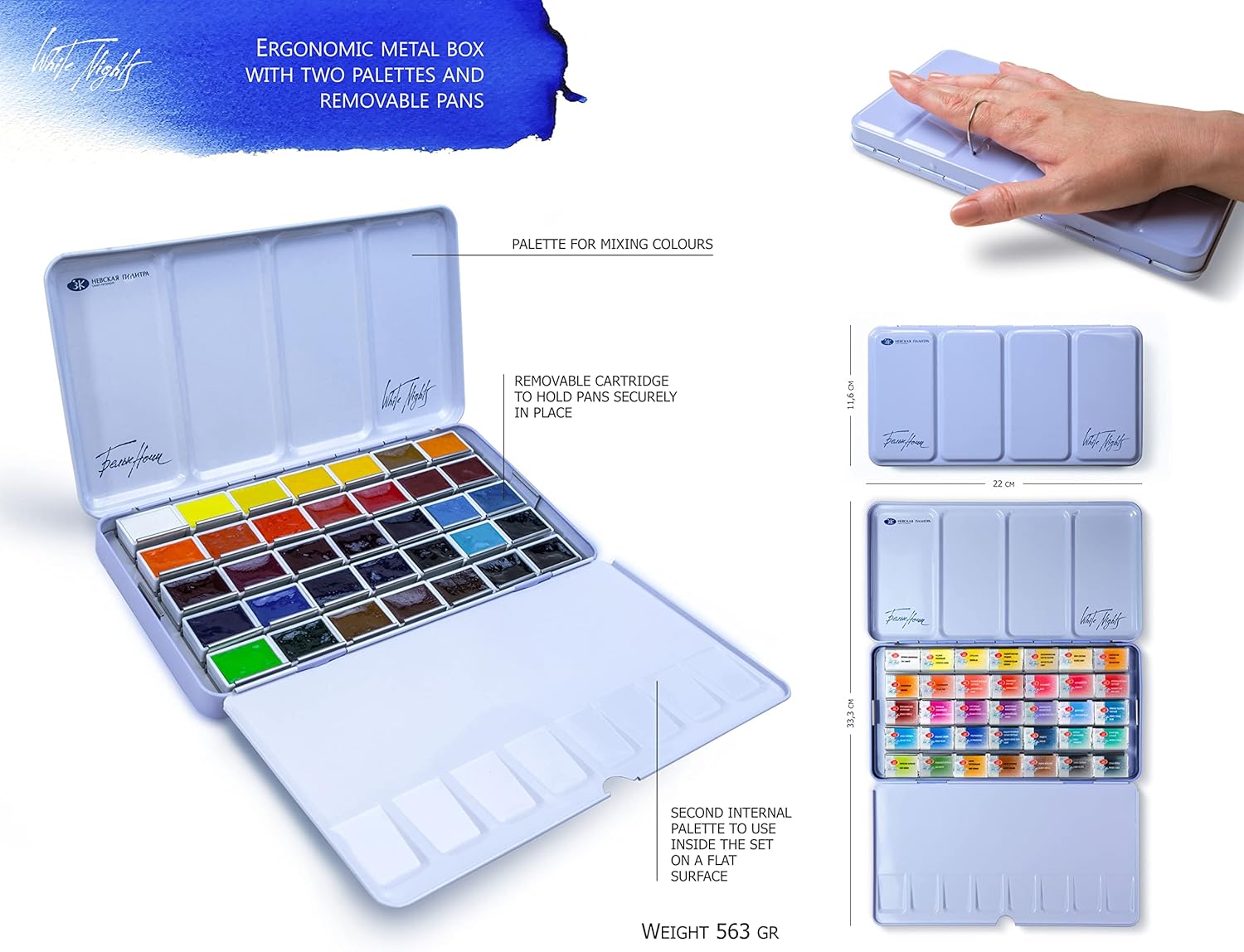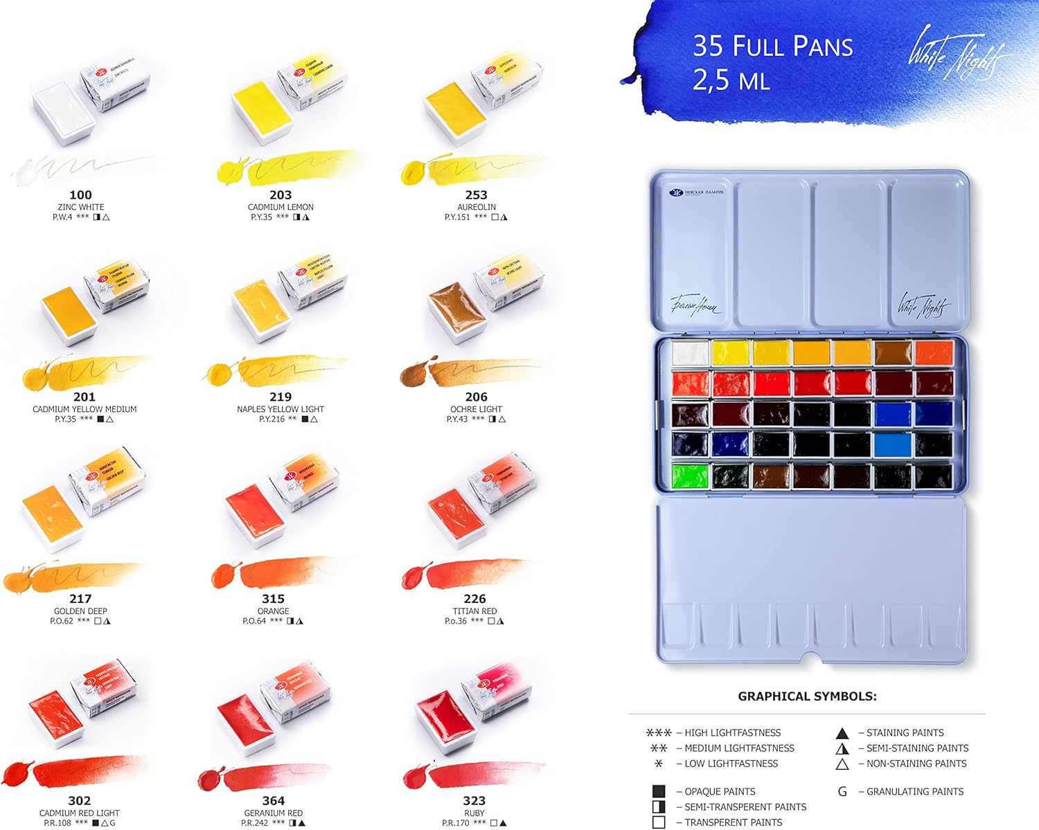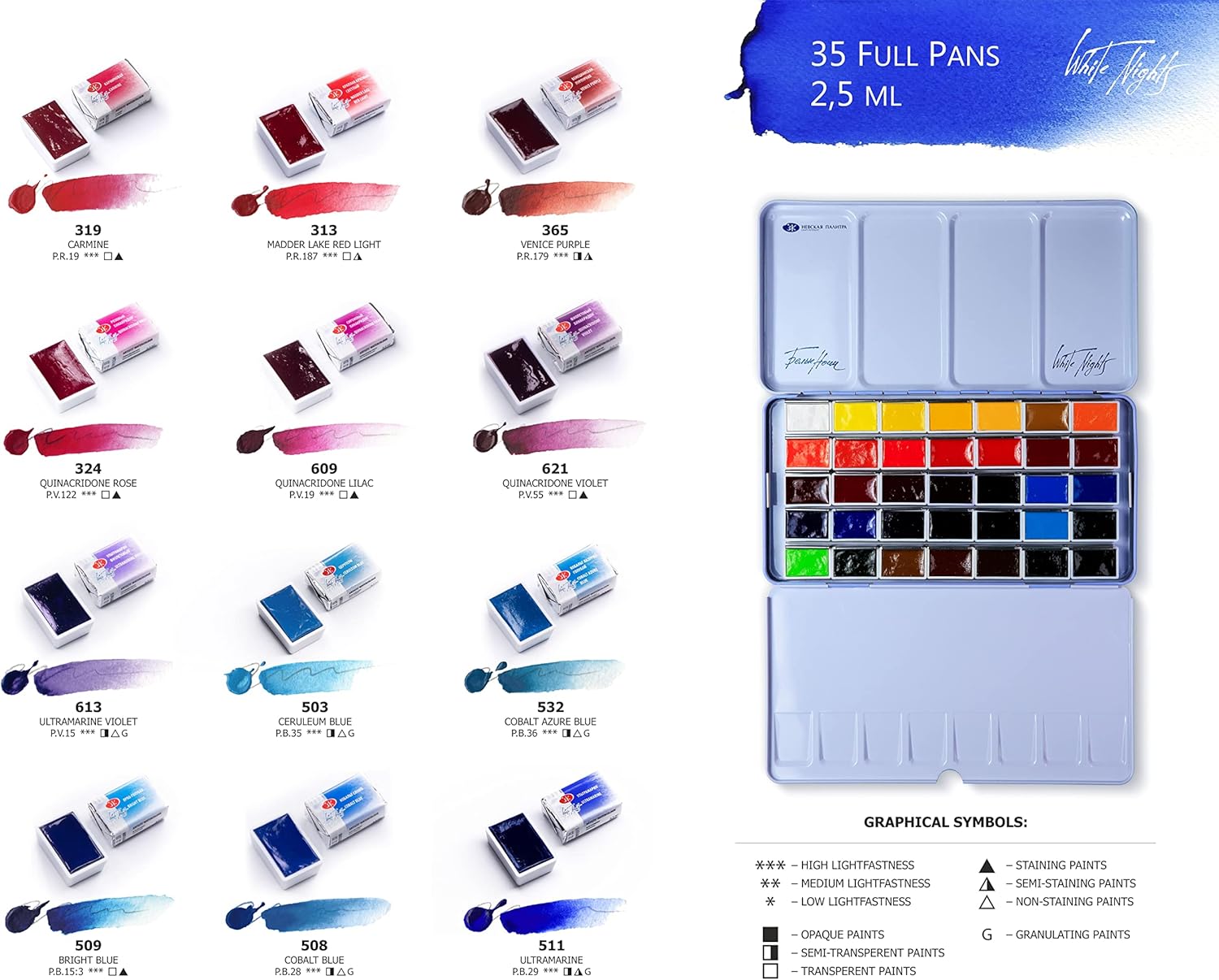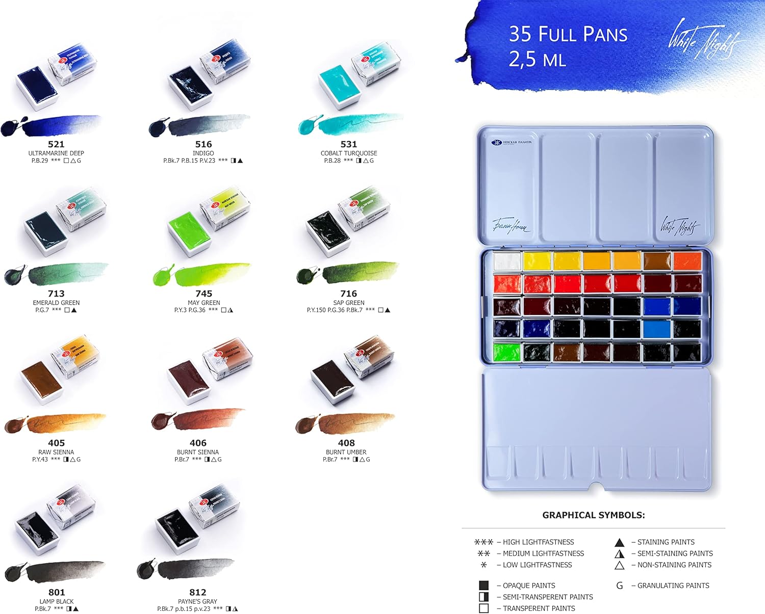Pittura ad acquerello extra fine Ottima scelta per artisti professionisti e principianti. Caratterizzato da trasparenza, che consente all'artista di lavorare con una vernice fine. I colori puri consentono di scrivere nella miscela e ottenere una ricca varietà di sfumature. Una tavolozza equilibrata di "White Night" è composta da 35 colori, può risolvere molti compiti creativi di acquerello. Prodotto a San Pietroburgo, in Russia, secondo i più alti standard e con orgoglio di alta qualità.