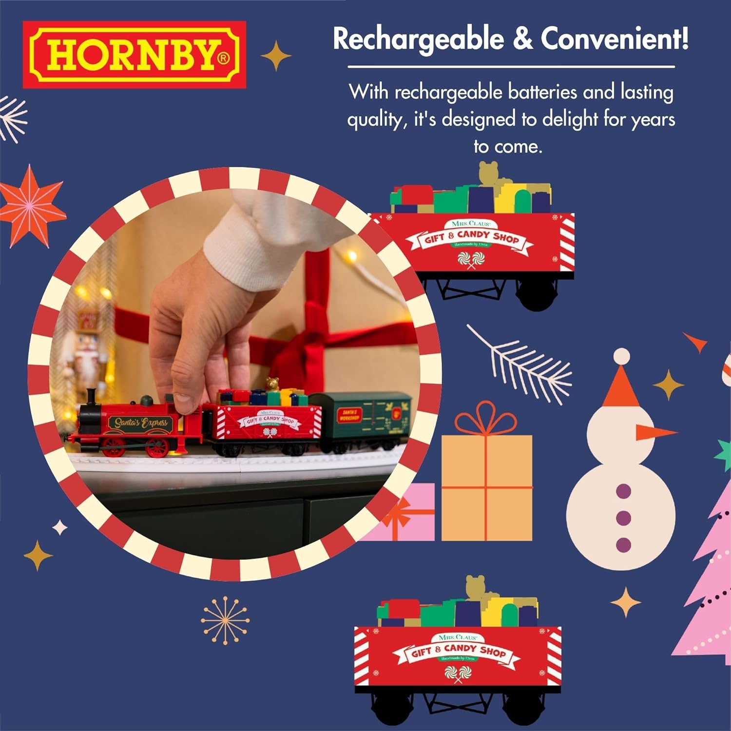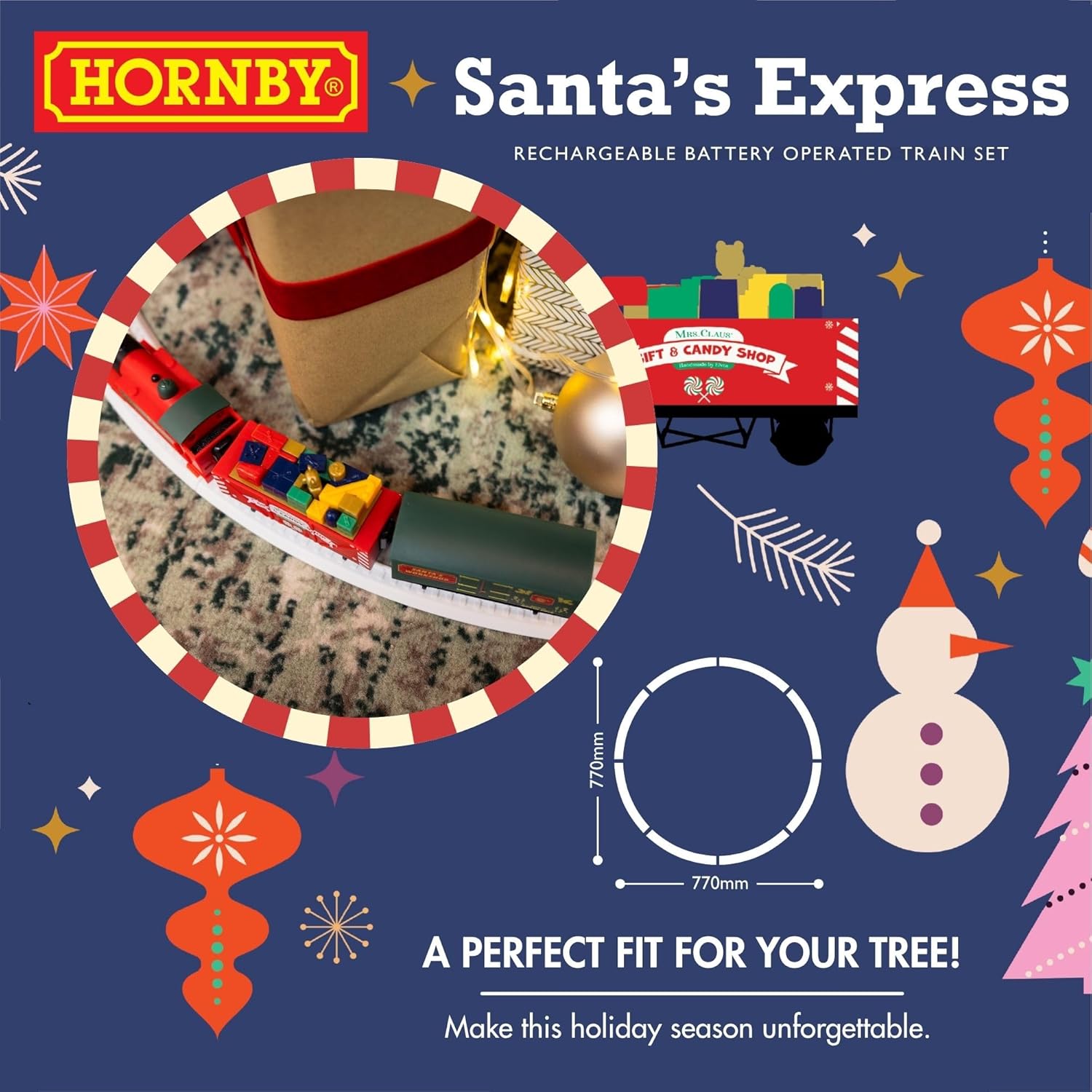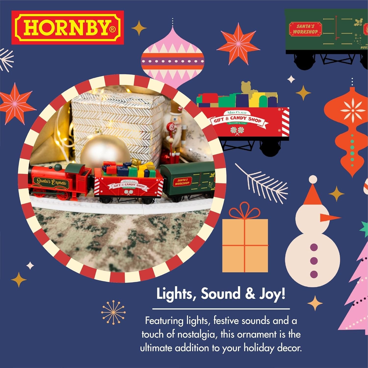 Santa's Express: questo Natale, trasforma il tuo albero con l'ornamento natalizio perfetto per correre intorno alla base. Caratterizzato da luci, suoni festosi e un tocco di nostalgia, questo ornamento è l'aggiunta definitiva al tuo arredamento per le vacanze Set di treni natalizi per sotto l'albero: questa decorazione natalizia ricaricabile offre agli appassionati di ferrovie un'esperienza festiva brillante e unica, un piccolo modello di treno a vapore per correre intorno alla base di qualsiasi albero di Natale Regali Ferroviari Modelli: Tutti a bordo del treno di Natale con tutta la famiglia! Il nostro set di treni viene fornito con istruzioni facili da seguire, luci e suoni per un display accattivante con i classici suoni del treno a vapore che riempiono la stanza di allegria festosa Layout espandibile: questo set di treni elettrici è compatibile con ulteriori pacchetti e accessori Hornby 00 Gauge, consentendo di espandere il layout delle decorazioni natalizie man mano che la passione per i modellini di treni cresce Contenuto della confezione: questo set di avviamento per treni include: locomotiva personale del motore a vapore di Babbo Natale, 1 locomotiva, 2 vagoni, pista circolare, cavo di ricarica e istruzioni (lingua italiana non garantita) Informazioni su Hornby: In qualità di leader nel Regno Unito, Hornby è entusiasta degli appassionati di modellismo da oltre 100 anni. Dal 1920 Hornby è il marchio leader nel design ferroviario 00 Gauge