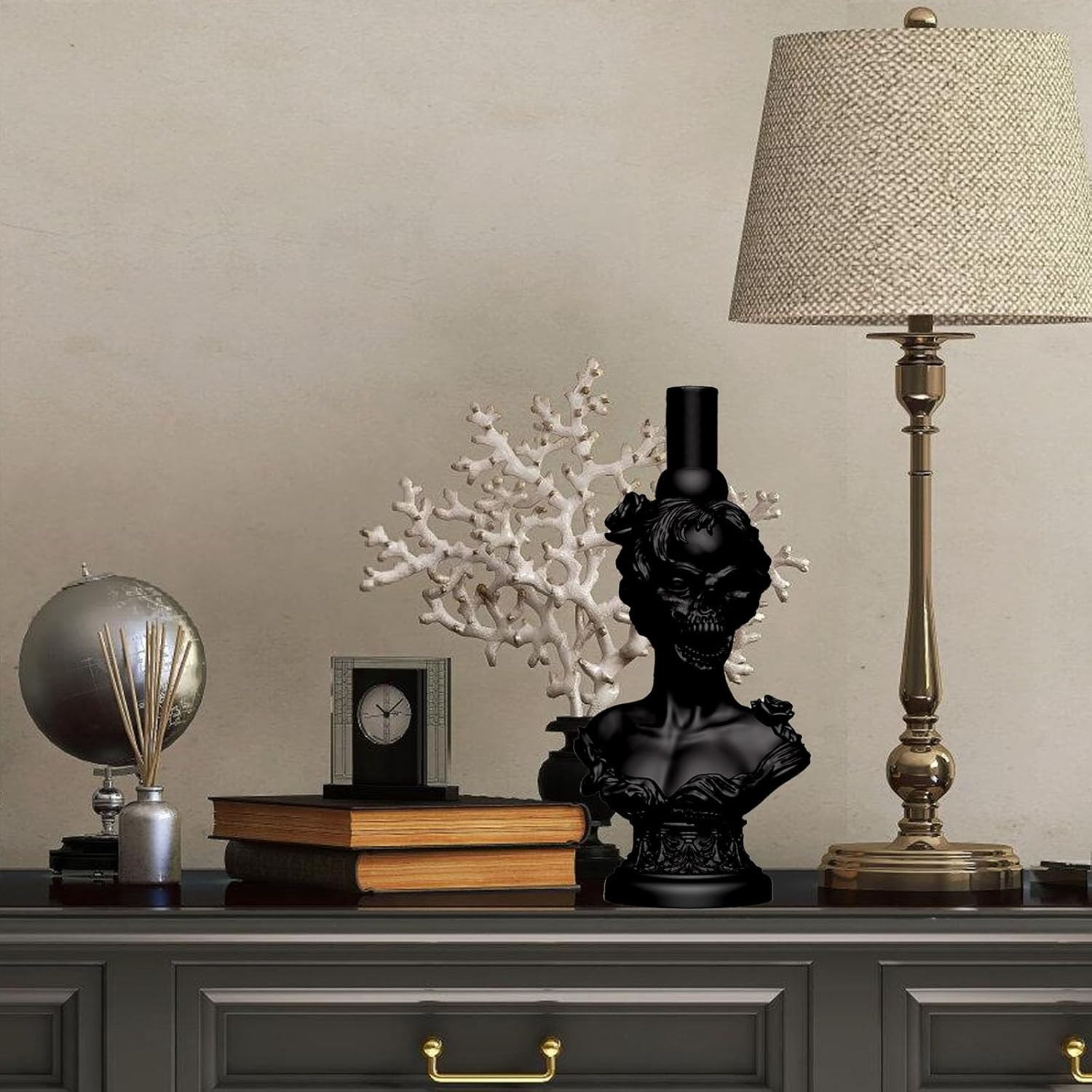 Questa versatile scultura di busto di strega in resina atossica valorizza in modo sicuro le feste di Halloween dei bambini, gli stand delle convention horror e le decorazioni dei bar con vampiri senza emissioni chimiche. Realizzato in resina di alta qualità, questo busto di teschio di strega riccamente dettagliato combina il fascino inquietante di Halloween con una durabilità duratura ed è perfetto per essere esposto all'interno o all'esterno come inquietante centrotavola o decorazione per scaffale. Ideale per organizzatori di feste a tema horror, appassionati di decorazioni per la casa di Halloween e collezionisti alla ricerca di pezzi unici che combinano l'estetica horror con la durevolezza funzionale La struttura in resina leggera ma robusta con intagli scheletrici neri e realistici garantisce prestazioni antigraffio pur mantenendo la complessa abilità artistica di Halloween Vesti tavoli di Halloween, metti in risalto gli scaffali delle librerie nelle sale studio o crea spettrali decorazioni per l'ingresso per eventi stagionali e interni scuri ed estetici tutto l'anno