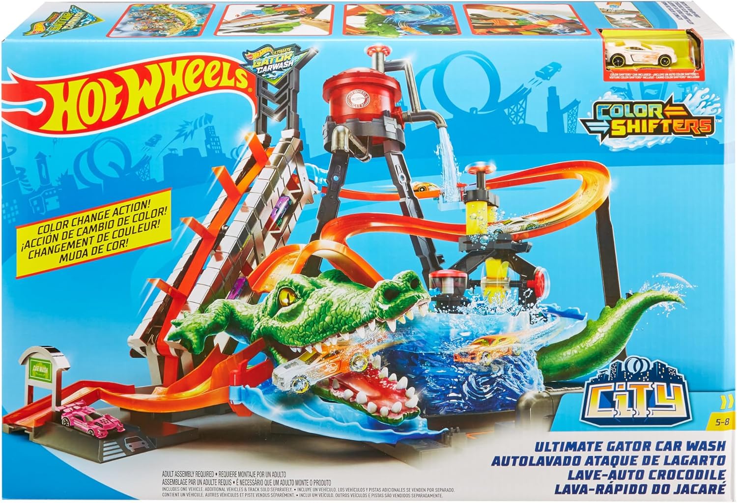 Mega Autolavaggio con effetto cambia colore e alligatore gigante! Gira la manovella del montacarichi per far salire la tua macchinina e farla sfrecciare lungo la pista con un effetto cambia colore. I rulli e le spazzole per pulire le macchinine favoriscono le capacità motorie e l'effetto cambia colore accende la fantasia. Scappa dal vortice senza farti agguantare dall'alligatore gigante! Il playset include un montacarichi a manovella, pista selvaggia, torre dell'acqua, vasca del vortice e 1 macchinina Color Shifters.