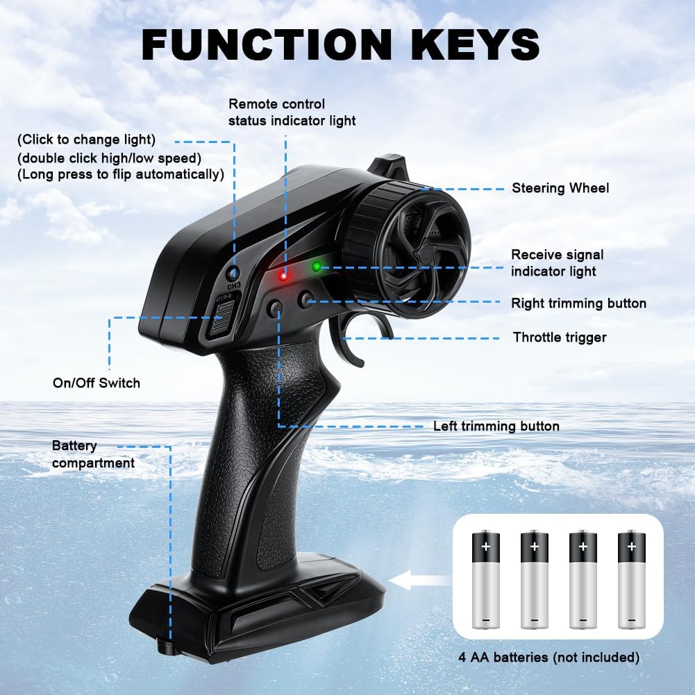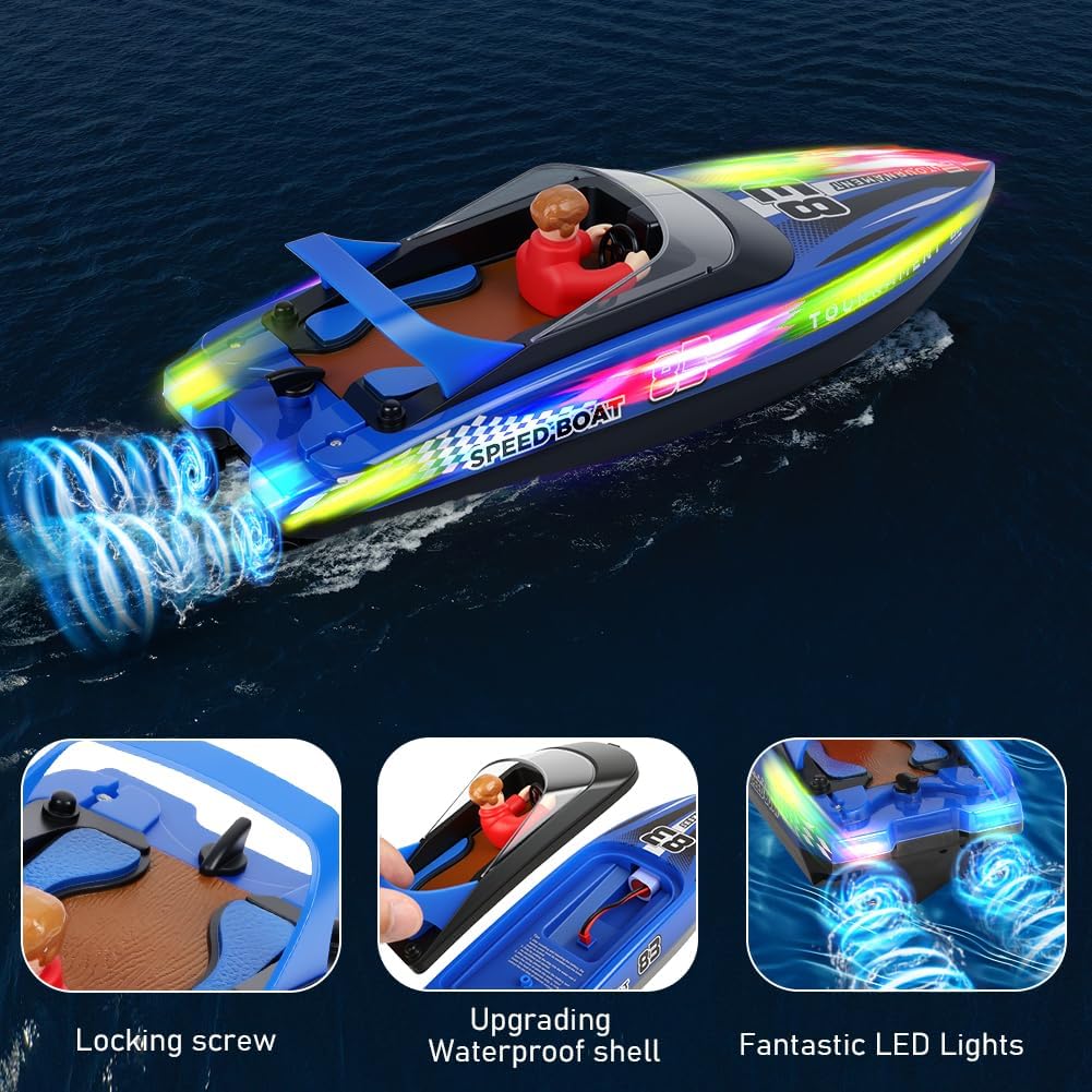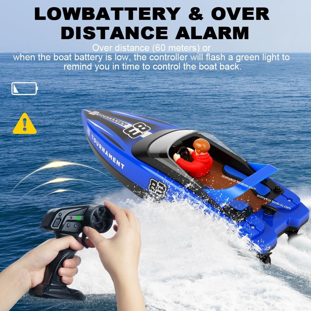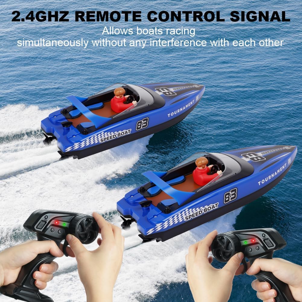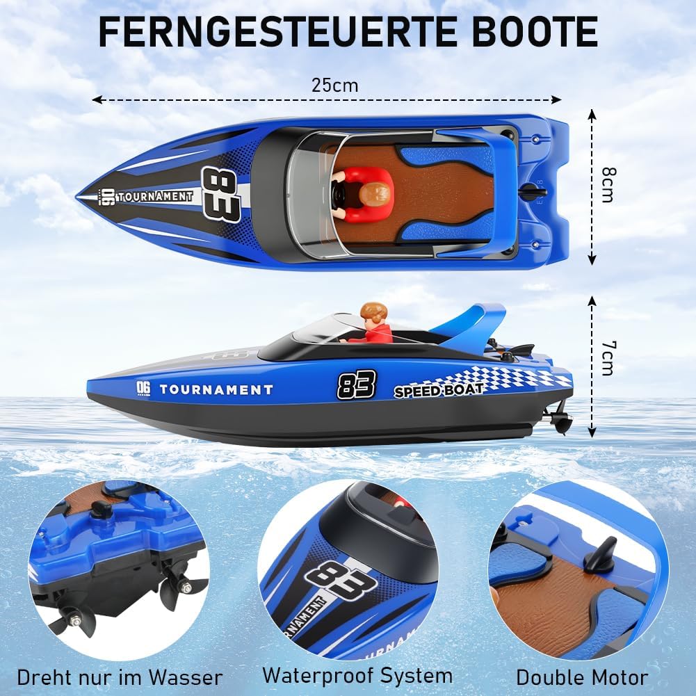 [Barca da corsa ultraveloce] La nostra barca telecomandata è amata sia dai bambini che dagli adulti grazie alla sua costruzione robusta e al design elegante. Dotato di due batterie ricaricabili da 3,7 V e 1200 mAh, offre fino a 120 minuti di autonomia e una velocità di 15 km/h. Esplora istantaneamente nuovi mondi acquatici e vivi avventure emozionanti con la nostra barca telecomandata! [Controllo flessibile] Questa barca da regata ultraveloce offre manovrabilità flessibile sull'acqua; puoi regolare la direzione e la velocità in tempo reale tramite il telecomando. La luce LED lampeggiante integrata consente di utilizzare questa barca telecomandata anche di notte. Entro 60 metri o quando la batteria è scarica, il telecomando lampeggerà in verde per ricordarti di tornare indietro. [Funzione di ripristino con un solo tocco] La funzione di raddrizzamento con un solo tocco assicura che la tua barca rimanga ferma anche se si capovolge. Questo design garantisce che la nostra barca rimanga stabile anche in caso di forti venti e onde, evitando che scompaia nel mare o nel lago. Consigliato per l'uso in laghi e piscine. [Maniglia con sensore wireless da 2,4 GHz] Il controller di frequenza da 2,4 GHz è altamente resistente alle interferenze, consentendo di controllare due o più imbarcazioni RC contemporaneamente senza interferenze. Combina semplicemente la barca e il telecomando per divertirti con i giochi acquatici multiplayer con i tuoi amici nei tornei. [Regalo ideale per bambini dai 14 anni in su e adulti] La confezione include un manuale di istruzioni dettagliato, che facilita il controllo e fornisce un'esperienza di guida realistica ed emozionante. Questa barca telecomandata è un regalo ideale per compleanni, festa dei bambini, Natale e altre occasioni.