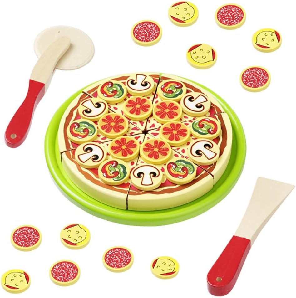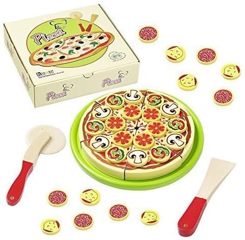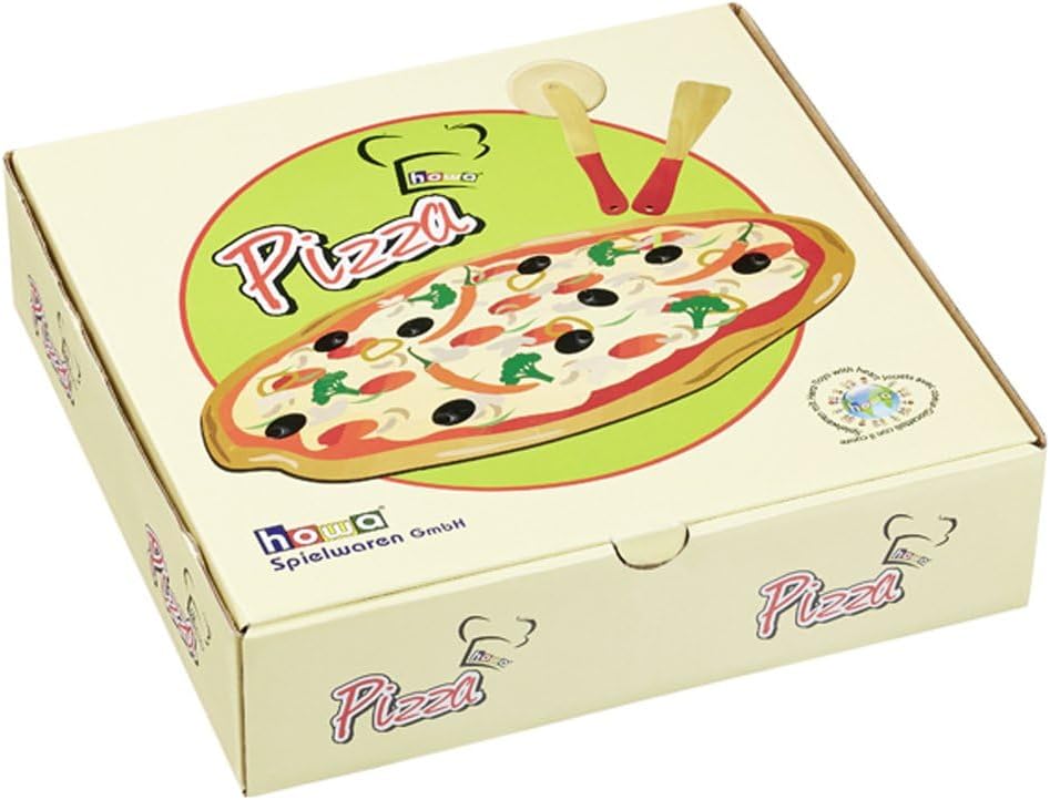 Pizza in legno da tagliare con tagliapizza, pala per pizza e cartone Con 5 diversi condimenti: pomodoro, formaggio, peperoni, salame e funghi Diametro pizza: 23 cm Gli angoli della pizza e le guide sono fissati con velcro. Cartone per pizza: Altezza: 6 cm, Larghezza: 23,5 cm, Profondità: 23,5 cm