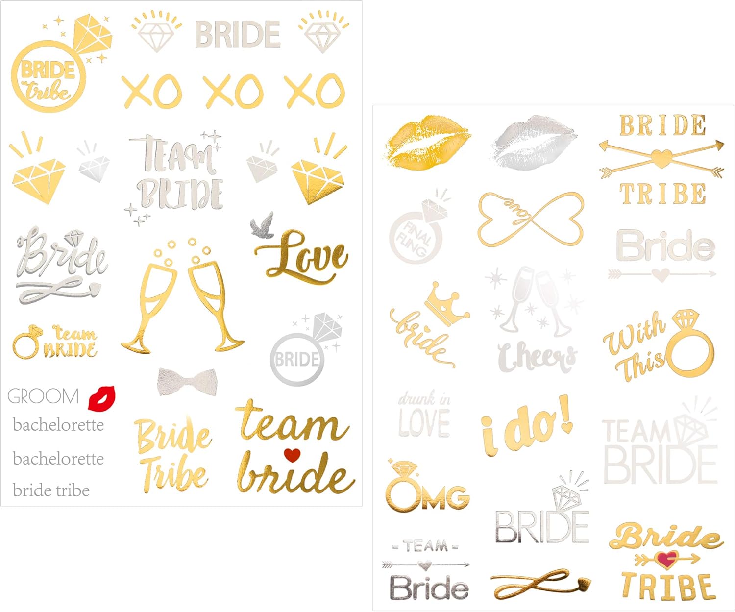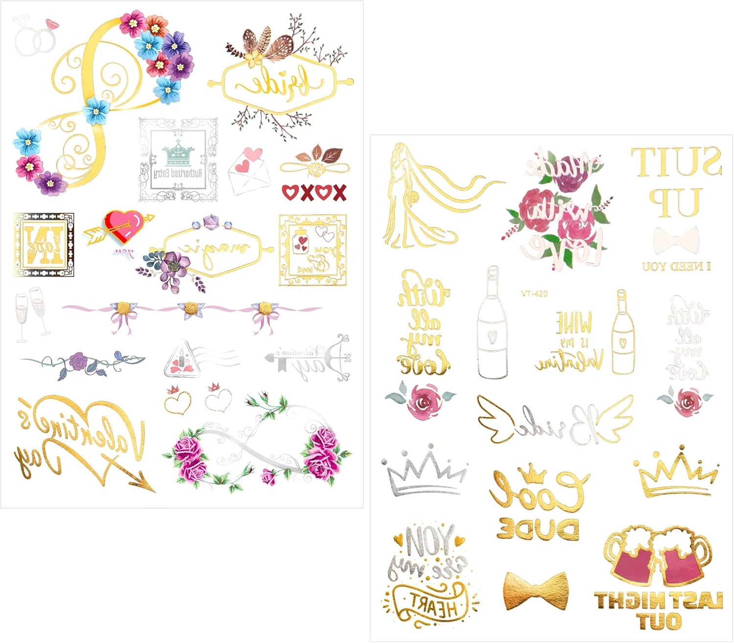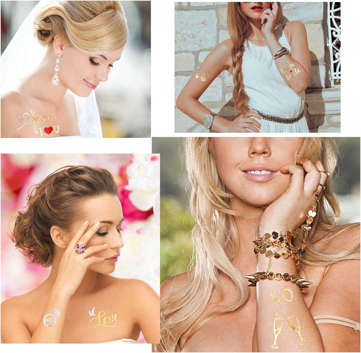 Addio al nubilato Accessori - 8 fogli in oltre 100 design. come ad esempio l'anello di fidanzamento dell'elettrocardiogramma, lo champagne, la cravatta a farfalla, il diadema, il bouquet di rose, bride, team bride, bride tribe e così via, perfetta decorazione per addio al nubilato amiche sposa DUREVOLE, IMPERMEABILE, RIMOVIBILE - Tatuaggio temporaneo di lunga durata per 2-5 giorni, resistente all'acqua e che non cadrà facilmente. può durare dal giorno alla notte sulla pelle, quindi puoi goderti la tua pazza festa senza preoccuparti. FACILE DA RICHIEDERE E RIMUOVERE - Queste galline fanno i tatuaggi appena bagnati con un panno umido, i tatuaggi possono essere applicati immediatamente sulla pelle. È molto comodo rimuoverli strofinando olio per bambini o crema per il viso. Addio al nubilato Gadget amiche sposa decorazioni - brillante, colorato e dorato, puoi metterlo sul tuo polso, sulla caviglia, sul viso o ovunque tu voglia, bello senza essere eccessivamente sgargiante o appiccicoso. Un grande accessorio per la festa di addio al nubilato, Matrimonio Acquista con fiducia, qualsiasi difetto ti preghiamo di contattarci via email per la sostituzione o il rimborso, ci impegniamo a fornire per te l'esperienza di acquisto al 100%.