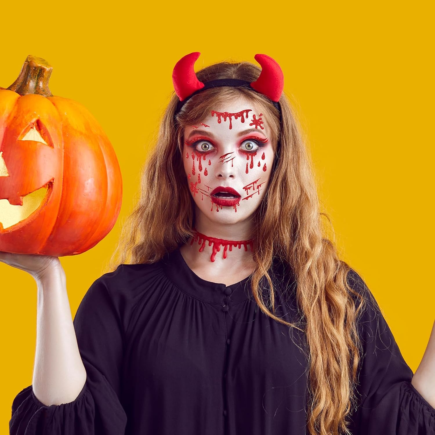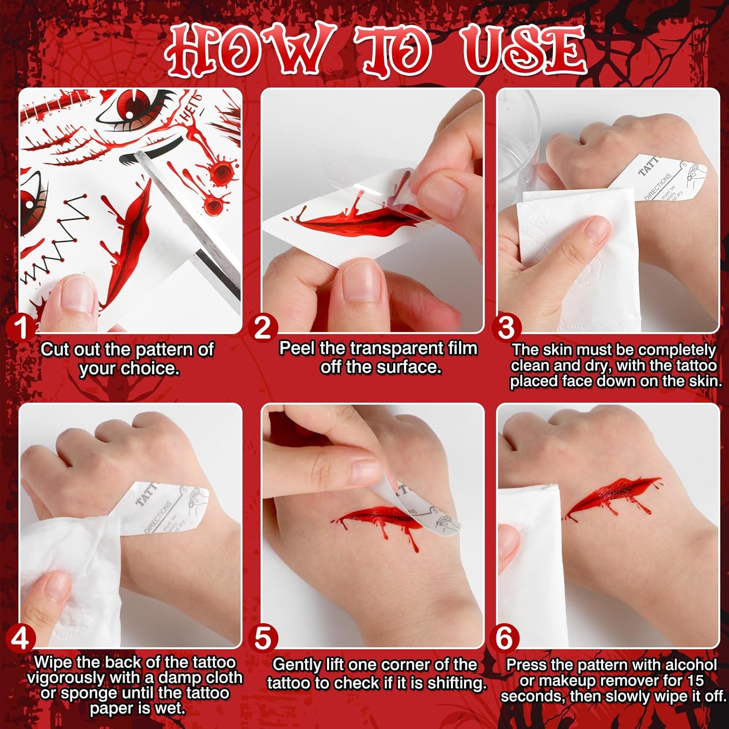 Faccia del tatuaggio di Halloween: riceverai 4 fogli di facce del tatuaggio di Halloween per adulti e bambini in 2 diversi modelli. I nostri adesivi per il viso di Halloween sono ideali per festival, Halloween o Natale. Disegni di Halloween: i nostri tatuaggi temporanei per cicatrici di Halloween con bellissimi elementi unici come zucca, strega, fantasma, ragno, pipistrello sono la combinazione perfetta per il tuo costume di Halloween! I nostri tatuaggi per il viso di Halloween sono sicuri, impermeabili e durano tutto il giorno. Durevole e facile da applicare: rimuovi la pellicola protettiva, ritaglia il disegno che desideri, inumidisci semplicemente il tatuaggio con acqua e attaccalo sul tuo corpo, viso o ovunque tu voglia. Può essere facilmente rimosso con olio per bambini o alcol denaturato. I colori duraturi e brillanti lo rendono ancora più divertente per i bambini. Costume di Halloween: questi tatuaggi temporanei con ferite insanguinate sono la migliore aggiunta al tuo costume da vampiro di Halloween e ai costumi di Halloween insanguinati! Rendi indimenticabile il tuo costume speciale con questi tatuaggi facciali di Halloween! Nuovi e interessanti, aggiungono un'atmosfera festosa alla tua festa in costume e creano bellissimi ricordi. Acquista con fiducia: renderà sicuramente più divertente la tua festa di Capodanno! In caso di problemi, contattaci per la nostra faccia del tatuaggio di Halloween. Puoi trovare altri tatuaggi temporanei steampunk, tatuaggi di Halloween, tatuaggi temporanei al neon e tatuaggi temporanei dorati nel negozio Howaf.