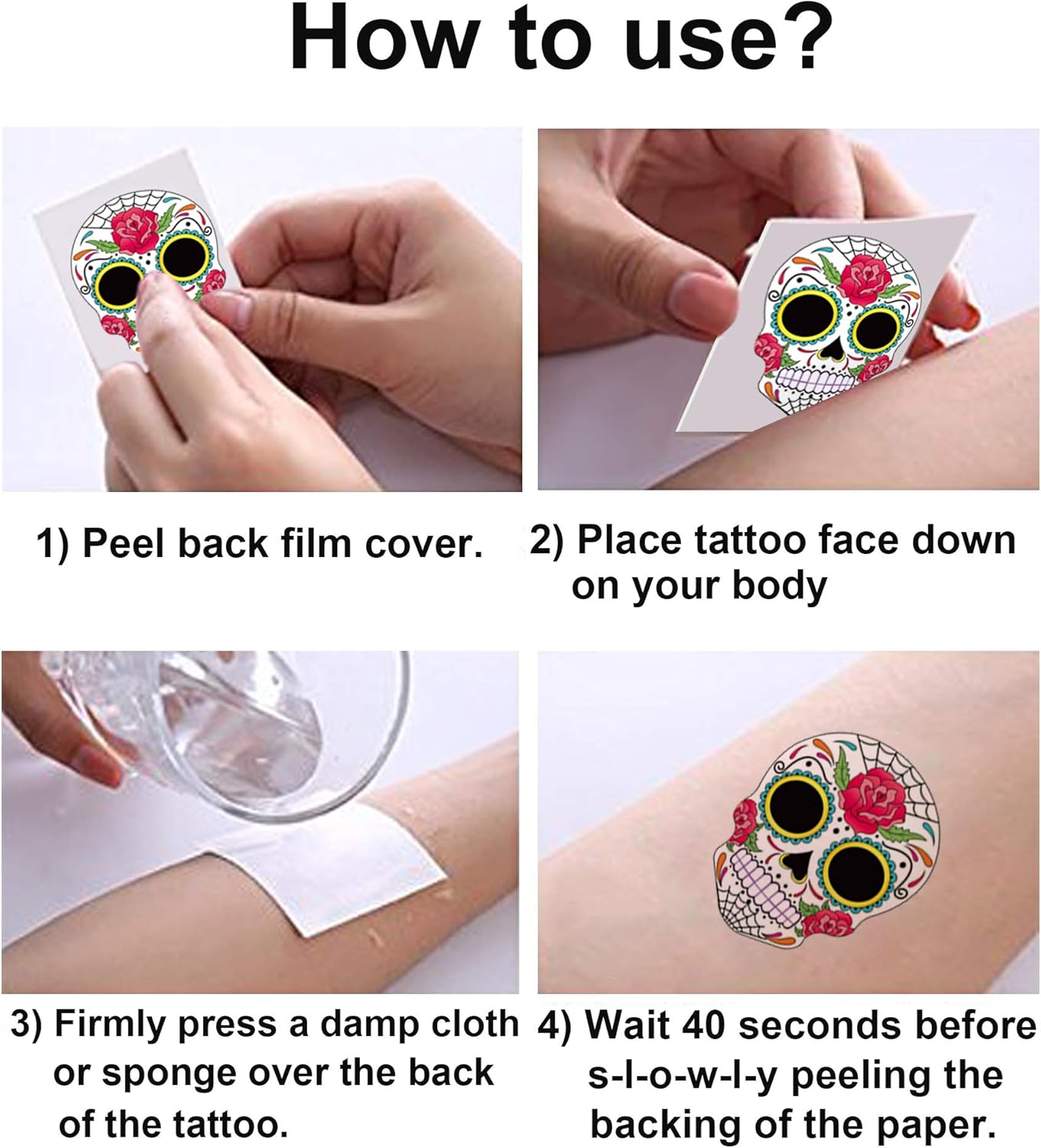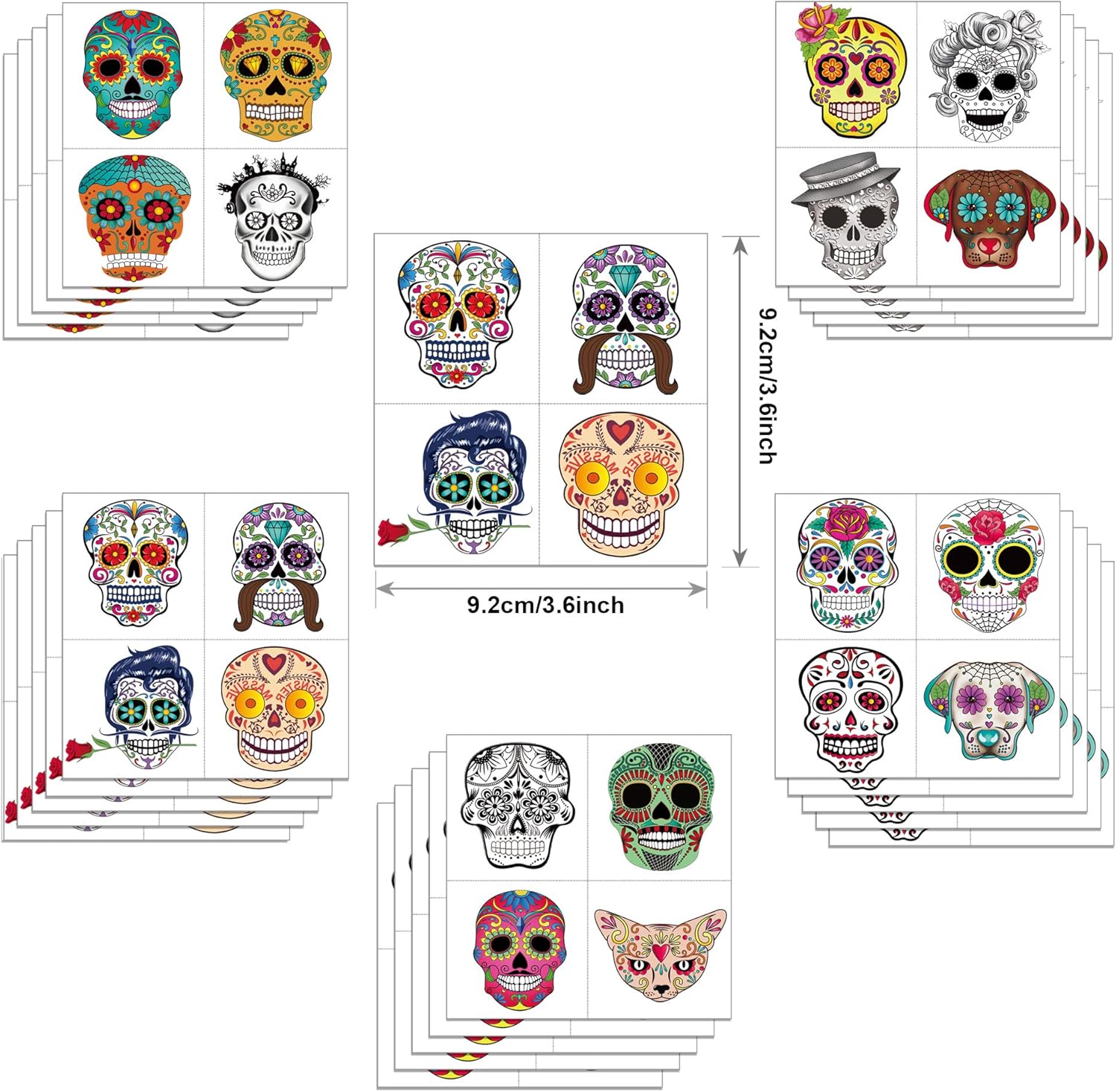 25 fogli in totale 100 pezzi Cranio Halloween Tatuaggi Temporanei! ogni Tatuaggi misura 4.6 * 4.6cm / 1.82 * 1.82inch, misura unica adatta a tutte le ragazze ragazzi bambini Donne Uomini Adulti Halloween tatuaggio temporaneo includere Cranio Floreale Nero Scheletro Web Rose rosse e cuori colorati molto dettagliati. perfetto per viso, petto, le spalle o le mani. Sicuro, resistente, impermeabile e rimovibile, dura da 2 a 5 giorni, Facile da applicare in 10-20 secondi con sola acqua e facilmente rimovibile con alcool, olio per il corpo, olio di oliva, aggiunta perfetta a qualsiasi Giorno dei Morti (Dia De Los Muertos) Un'ottima alternativa alle caramelle per le borse della festa di Halloween o per un regalo goliardico o dolcetto! Divertimento per una festa di Halloween per bambini, festa in costume o festa in casa stregata, regalo di Halloween, grandi accessori per abbinare il tuo costume di Halloween. Acquista con fiducia, i nostri finti Halloween tatuaggi temporanei per bambini sono supportati da un SOLDO DI RIMBORSO e GARANZIA SODDISFATTA, la tua soddisfazione è la nostra priorità. più forniture di favore per favore visita il negozio di Konsait, prendilo per divertimento!