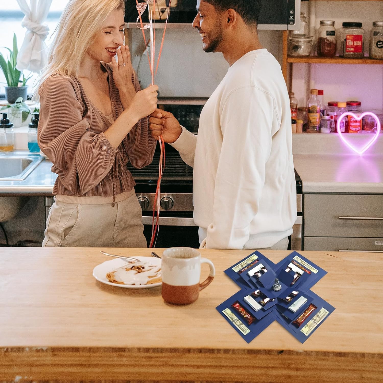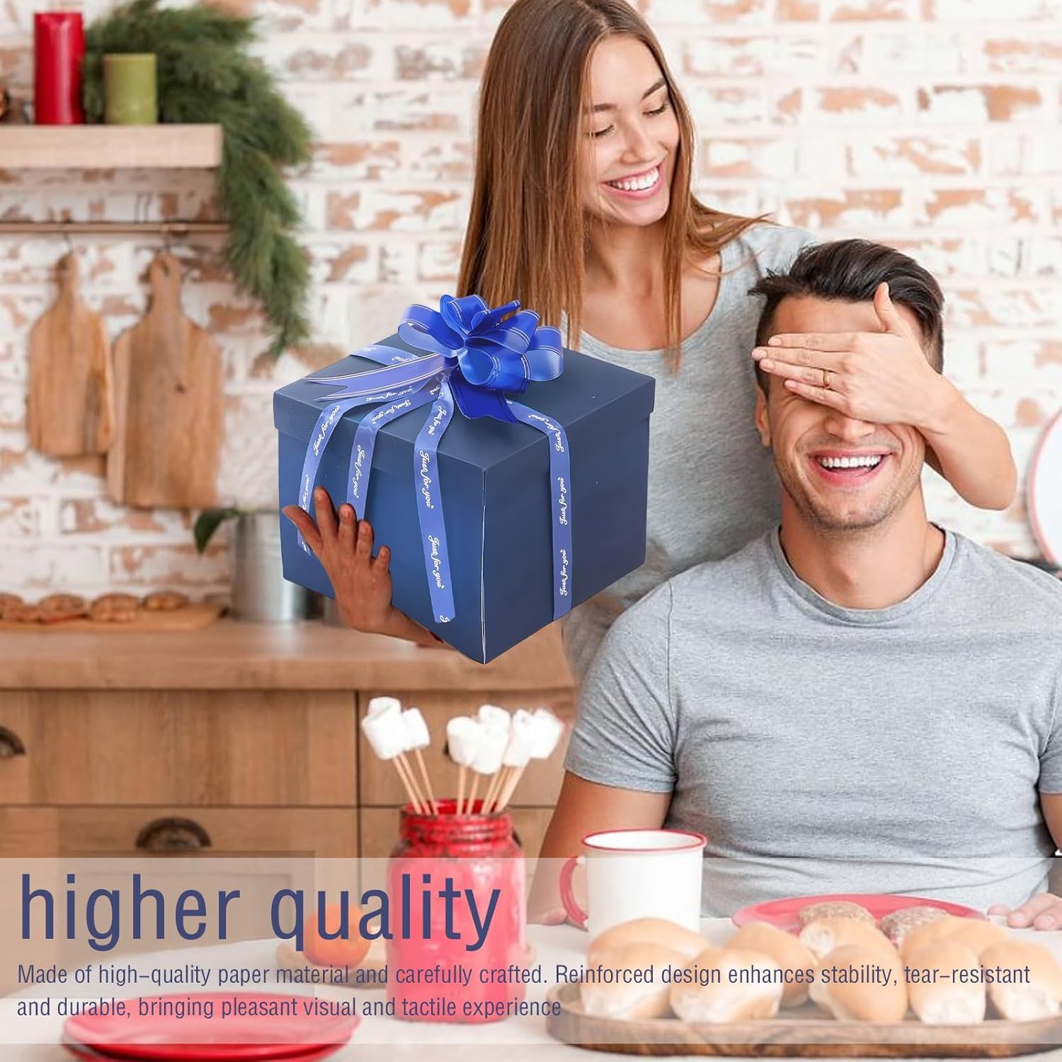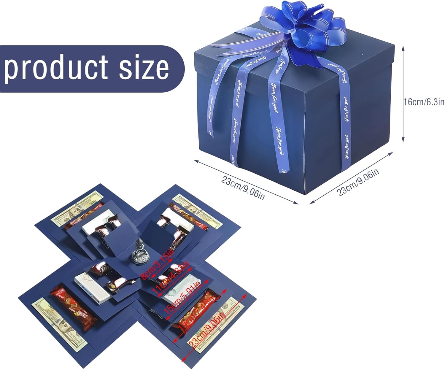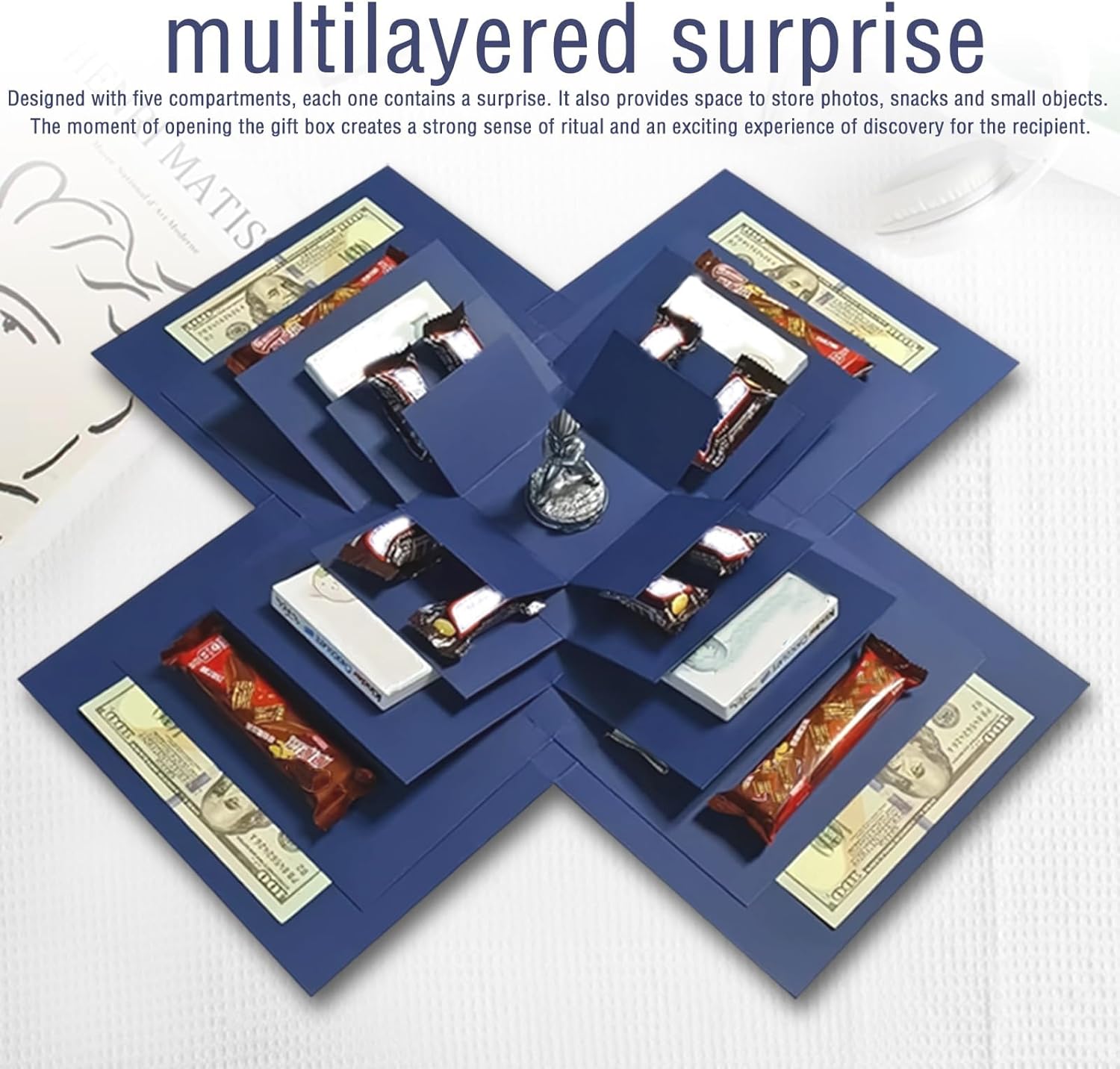 Sorpresa multistrato: la confezione regalo con coperchio presenta un design divisorio a 5 strati, che ha una sorpresa in ogni strato, offre spazio per foto, snack e piccoli oggetti, l'apertura della scatola crea un forte senso di cerimonia e un'emozionante esperienza di scoperta per il destinatario Alta qualità: la confezione regalo di compleanno è realizzata in materiale cartaceo di alta qualità ed è realizzata con cura, il design rinforzato garantisce ulteriore stabilità, è resistente agli strappi e durevole, offre una piacevole esperienza visiva e tattile Accessori estesi: scatola di caramelle esplosiva viene fornita con 5 fiocchi decorativi con fiori (in diverse dimensioni), 1 nastro biadesivo e 2 fiocchi in tessuto, ideali per attaccare regali e personalizzare la decorazione della confezione regalo Design fai da te: la scatola esplosiva è facile da montare, puoi goderti l'assemblaggio insieme alla famiglia o agli amici, lascia all'interno della confezione regalo Cattura messaggi personali e bellissimi ricordi - per gioia e sorpresa per il destinatario. Ampia gamma di usi: la confezione regalo fotografica a sorpresa è adatta per compleanni, anniversari, matrimoni, San Valentino e molte altre occasioni, ideale anche come regalo per fidanzamenti, celebrazioni o anniversari: un'ottima scelta per esprimere il tuo affetto