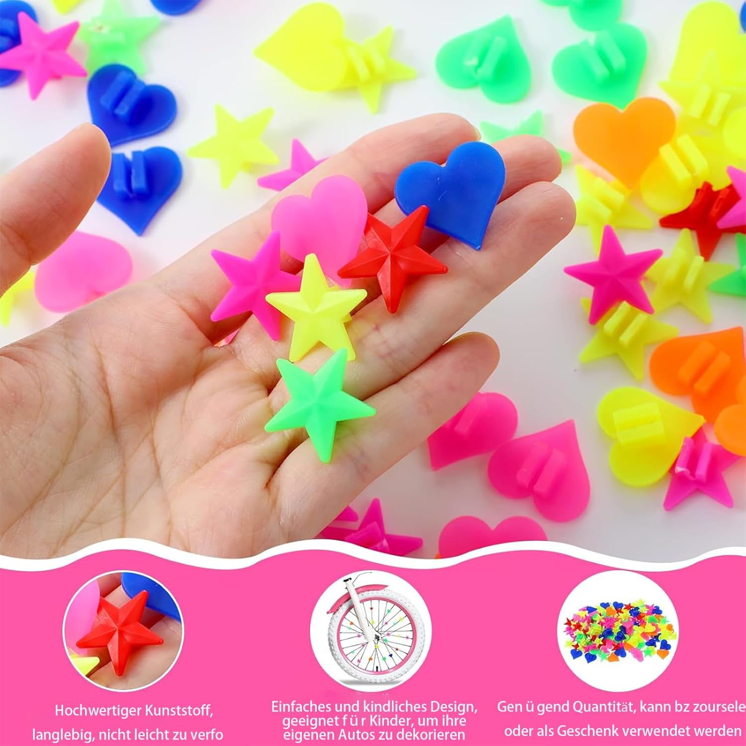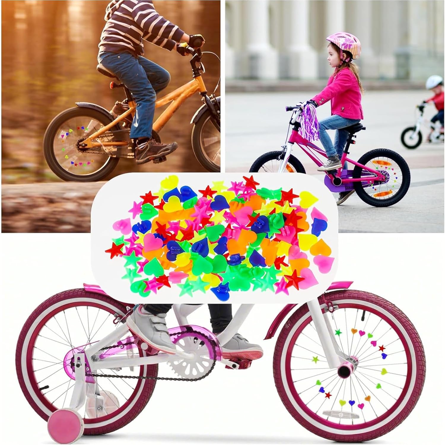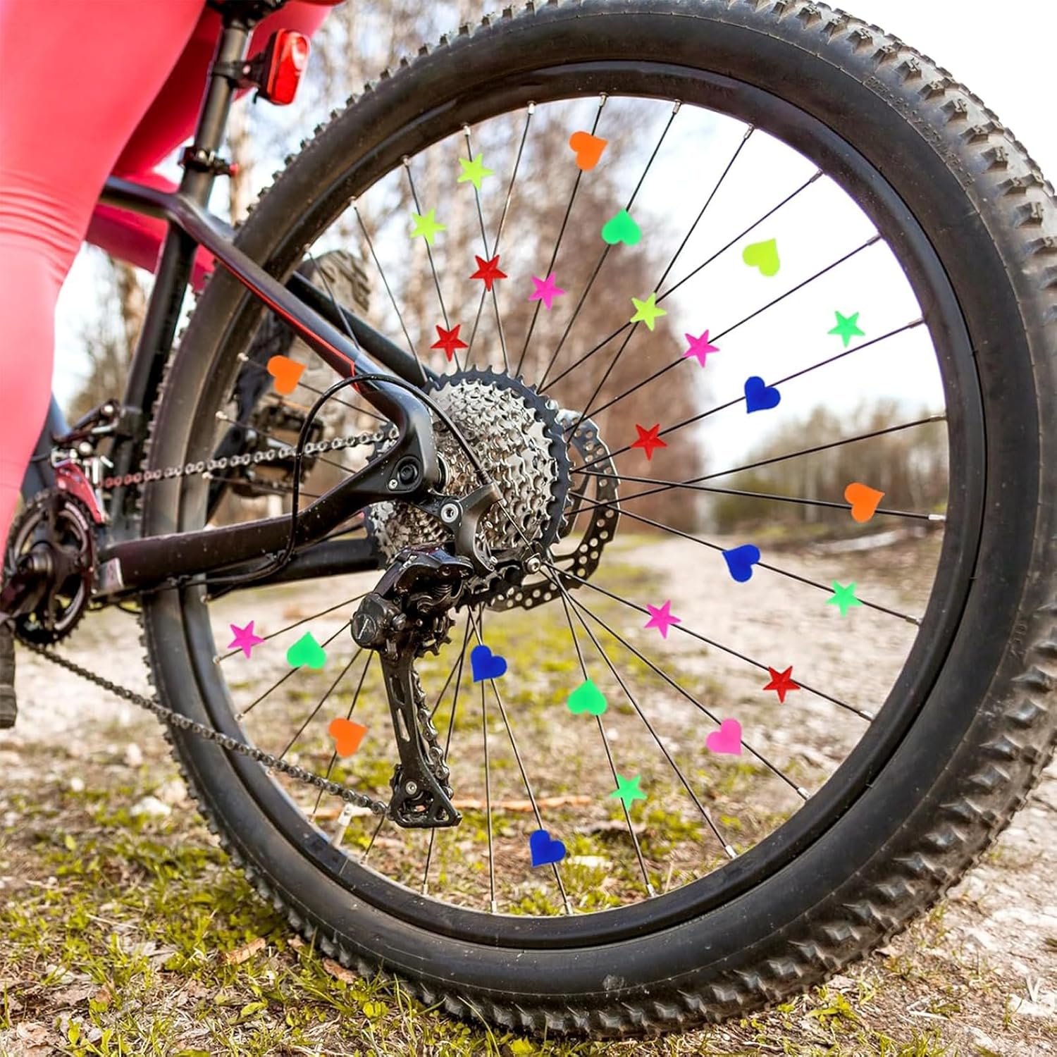 【Design con motivi creativi】: Questo prodotto contiene 180 fiori colorati per biciclette disegnati con cuori e stelle carini, che rendono la tua bicicletta un vero e proprio eye-catcher durante la guida. facile smontaggio, permettendoti di cambiare il modello in base al tuo umore e alla stagione a piacimento 【Maggiore sicurezza】: I fiori radioattivi non solo migliorano l'aspetto, ma aumentano anche la visibilità della tua bicicletta, garantendo maggiore sicurezza durante la guida notturna, in modo che gli altri utenti della strada possano riconoscerti meglio 【Opzione regalo perfetta】: Questi colorati zoccoli per bicicletta sono il regalo ideale per gli amanti della bicicletta e sono eccellenti in diverse occasioni per far divertire i tuoi amici e familiari durante la guida