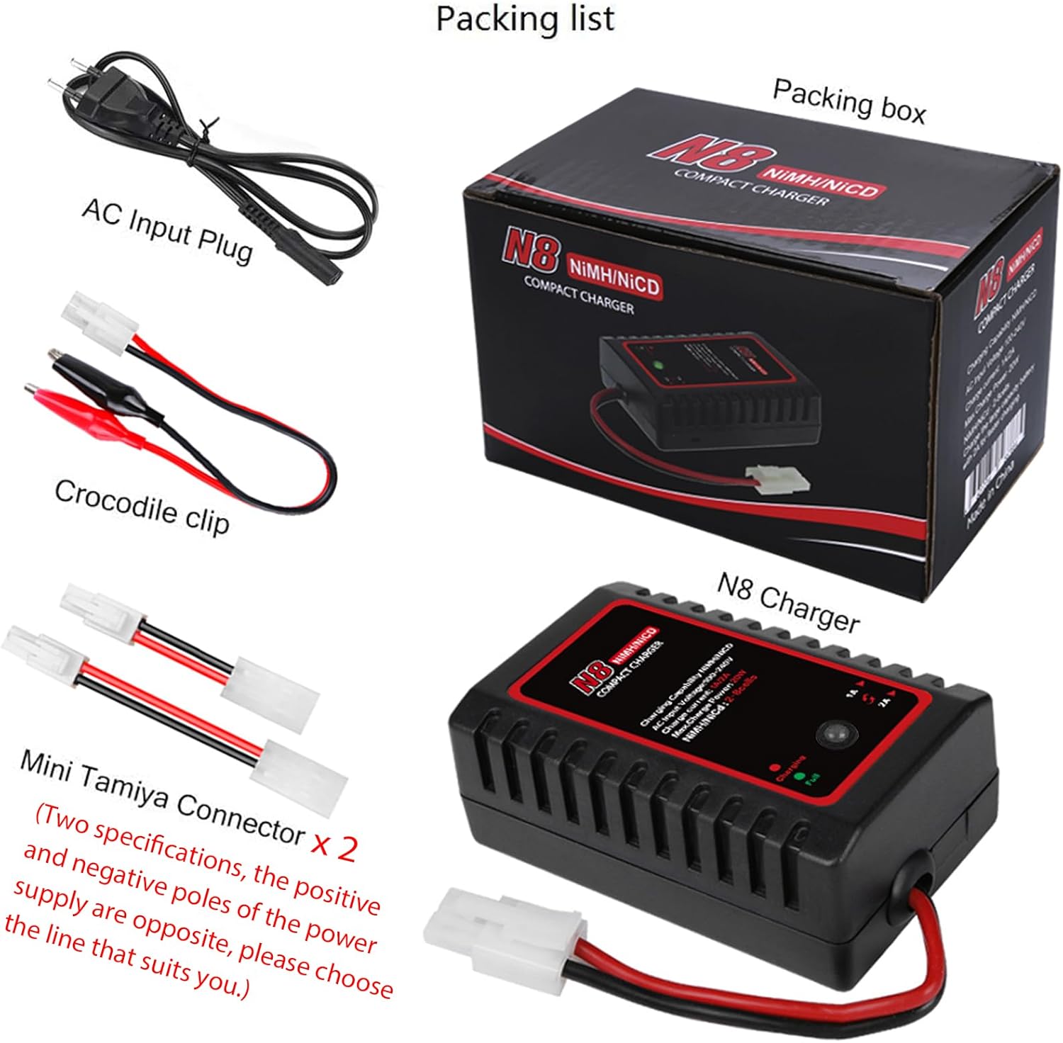【Caricabatterie NiMH intelligente】 Questo caricabatterie NiMH N8 HTRC è progettato professionalmente per batterie NiMH/NiCD da 2-8 s (2,4-9,6 V) di droni/auto RC/barche RC/pistole softair. Ricarica intelligente con protezione da sovraccarico, sicura ed efficiente. 【Ingresso e uscita】Tensione di ingresso CA: 100-240 V. Potenza in uscita: 20 W, corrente di carica: 1 A/2 A. La corrente di carica può essere regolata su 1 A o 2 A a seconda della capacità della batteria utilizzando l'interruttore sul lato del caricabatterie. Facile da usare: il caricabatterie viene fornito con un connettore Tamiya standard e un cavo di ricarica con connettore Tamiya standard a Mini Tamiya, in modo da poter caricare facilmente la batteria NiMH/NiCD. Devi solo collegare il cavo di alimentazione, il caricabatterie e la batteria. Design compatto ed elegante, facile da trasportare e adatto ai viaggi. 【Display a due colori】Una luce rossa fissa indica che la ricarica è in corso, una luce verde costante indica che la ricarica è completa, un flash rosso e verde indicano alternativamente che la batteria non è collegata. Nota: questo caricabatterie è adatto per batterie NiMH/NiCD con connettore standard o mini Tamiya. Le clip a coccodrillo possono essere utilizzate per il fai-da-te. Il polo positivo (filo rosso) del connettore Mini Tamiya è rotondo e il polo negativo (filo nero) è quadrato. Assicurati che qualcuno si occupi della ricarica della batteria.