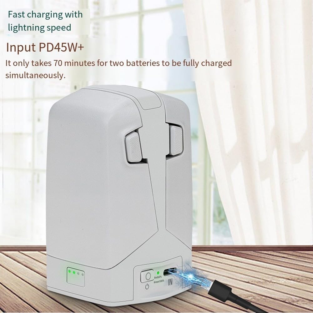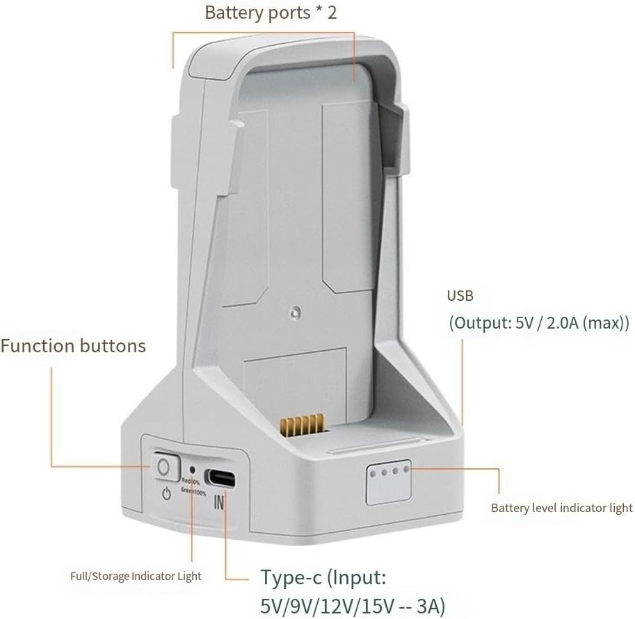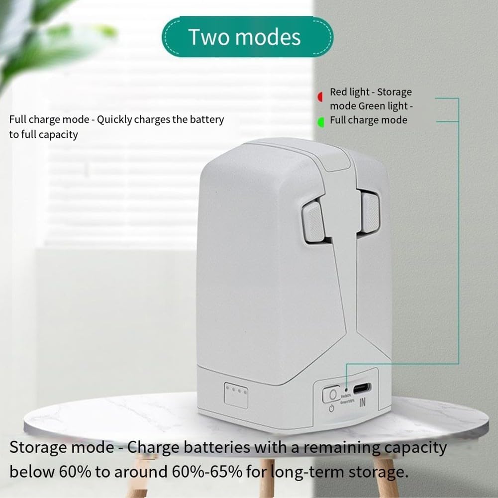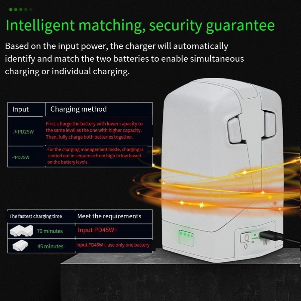 Capacità di ricarica rapida: carica due batterie contemporaneamente in circa 70 minuti, consentendo di massimizzare il tempo di volo senza lunghe attese. Funzionalità di ricarica a due vie: utilizza la carica residua della batteria non solo per i droni, ma anche per smartphone e altri dispositivi, rendendolo uno strumento essenziale per gli appassionati di tecnologia. [TECNOLOGIA SMART MODE] Dispone di due modalità distinte per ottimizzare la longevità della batteria, livelli di archiviazione sicuri fornendo al contempo una carica completa quando necessario. [MECCANISMI DI SICUREZZA ROBUSTI] Dotato di protezione avanzata contro sovraccarico, surriscaldamento e sovracorrente, garantendo un ambiente sicuro per tutti i tuoi dispositivi. [COMPATTO E DESIGN] Realizzato in materiale ABS con dimensioni compatte di 6 x 5,8 x 5,5 cm, questo hub è leggero e facile da trasportare per l'uso in movimento.