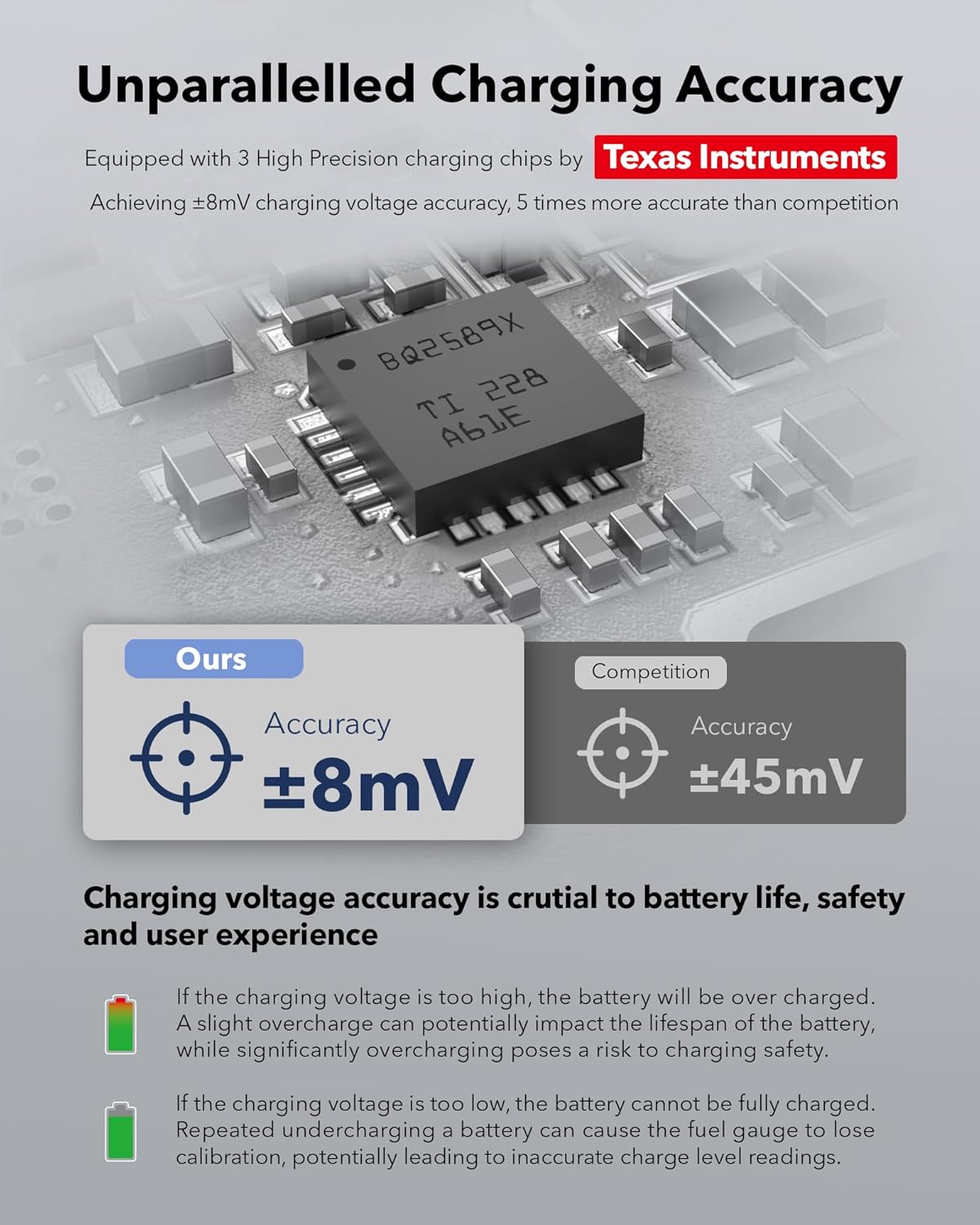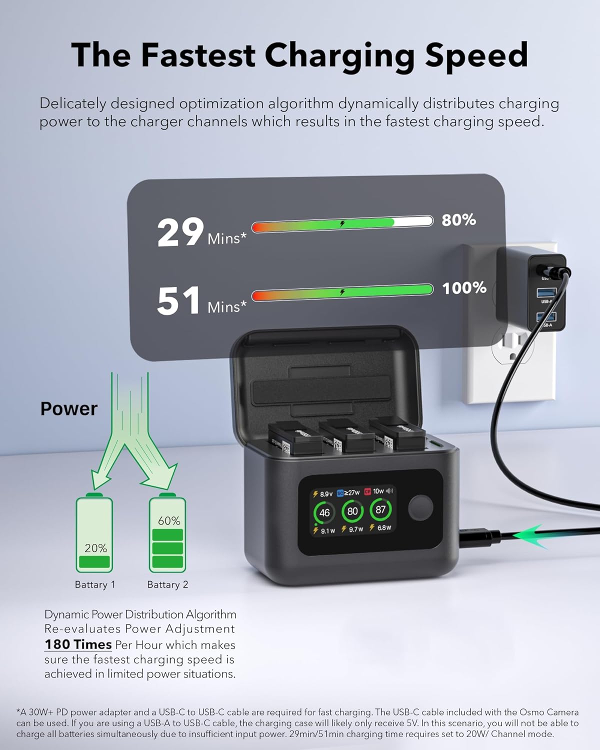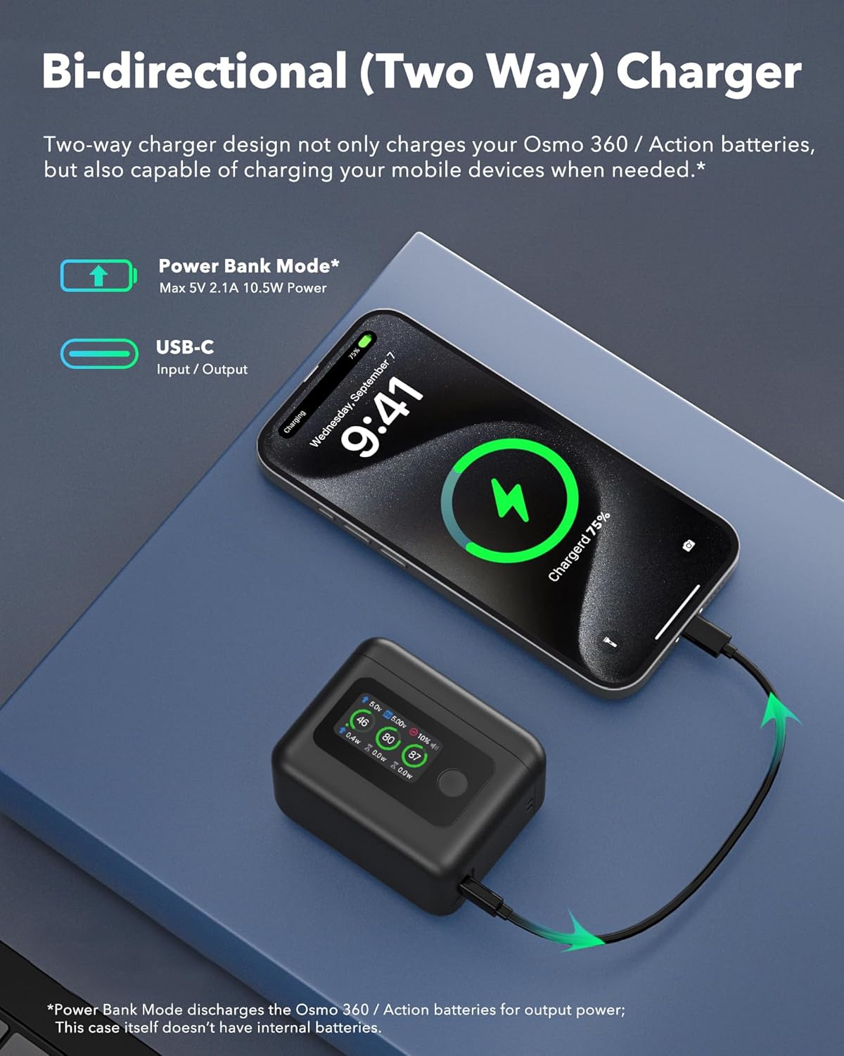 Alloggiamento di ricarica rapida intelligente all-in-one: alloggiamento di ricarica rapida a 3 canali per DJI Osmo 360/Action 5 Pro/Action 4/Action 3, fonte di alimentazione in uscita, dispositivo di accumulo della batteria, compensatore della batteria e alloggiamento di memorizzazione della batteria, 5 funzioni in un unico dispositivo. Nota: questa custodia di ricarica è in grado di caricare una batteria fino a 20 W, lo standard di fabbrica è impostato su 10 W/canale, basta impostarlo su 20 W/canale (leggere il manuale di istruzioni) nel menu delle impostazioni. Controllo totale a colpo d'occhio: la custodia di ricarica dispone di uno schermo LCD ad alta risoluzione, che fornisce letture cristalline in tempo reale, tra cui stato di carica (SOC), tensione, ciclo sanitario, temperatura e fonte di alimentazione. Questo display avanzato consente una gestione precisa e informata della batteria in modo da poter conoscere lo stato della batteria a colpo d'occhio. 【Precisione progettata per la sicurezza】 Dotato di chip per la gestione della carica ad alta precisione di Texas Instruments, che forniscono una precisione di ± 8 mV, molto superiore ai tipici -45 mV trovati in altri caricabatterie. Ogni canale viene calibrato individualmente per eliminare i rischi di sovraccarico o scarica e garantire che le batterie ricevano esattamente la carica necessaria. Sicuramente protegge la salute della batteria con protezione integrata ad alta e bassa temperatura, in modo che non venga mai danneggiata durante la ricarica. Fonte di alimentazione bidirezionale versatile: trasforma il tuo caricabatterie in una comoda banca di alimentazione mobile. Questa funzione intelligente consente di scaricare la corrente immagazzinata dalle batterie tramite un'uscita USB-C da 10,5 W e fornisce un modo affidabile per caricare il telefono, tablet o altri dispositivi essenziali. (Nota: questo caricabatterie non contiene batterie incorporate e richiede la batteria della fotocamera per utilizzare la funzione di alimentazione) Modalità avanzate di ottimizzazione della batteria: prendete il pieno controllo della gestione della corrente con due modalità intelligenti per prestazioni e durata. Modalità di accumulazione: fonde cariche parziali in una batteria completa per garantire che una batteria completamente carica sia pronta. Modalità Even Out: bilancia i livelli di carica delle batterie, prolunga la loro durata e consente una conservazione più sicura evitando i rischi derivanti da celle squilibrate. Queste due modalità offrono una soluzione intelligente e flessibile. Nota: per liberare tutto il potenziale della ricarica rapida, sono necessari un adattatore di alimentazione (PD) da 30 W e un cavo USB-C USB-C. È possibile utilizzare il cavo USB-C fornito con la fotocamera Osmo. Si prega di notare che l'uso di un cavo USB-A USB-C limita il consumo energetico della custodia di ricarica a circa 18 W. Solo caricabatterie e cinturino, batteria e cavo di ricarica non inclusi.
