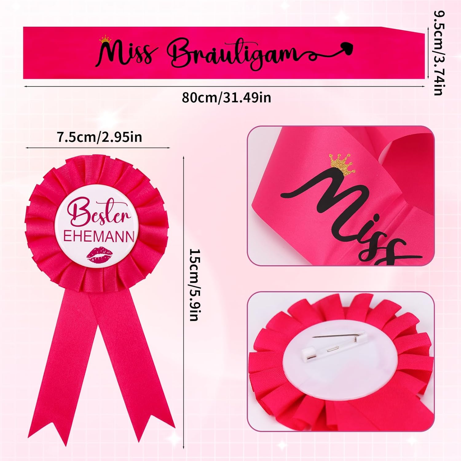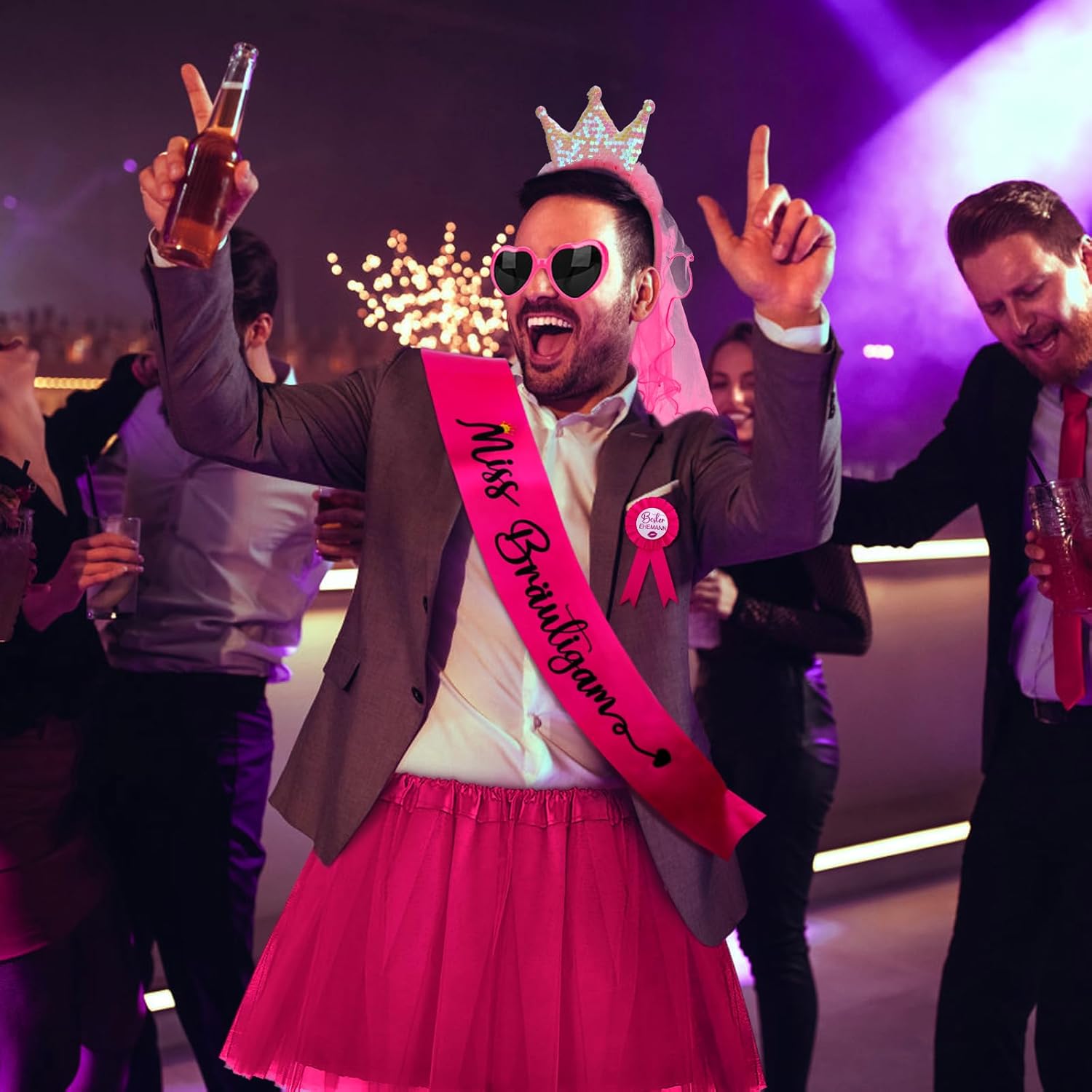 Descrizione prodotto Contenuto della 1 fascia Miss Sposo, 1 badge Best Husband. 1 paio di occhiali da sole a forma di cuore rosa, 1 velo rosa turbante corona, 1 gonna in tulle rosa. Avviso di sicurezza Nessuna avvertenza applicabile