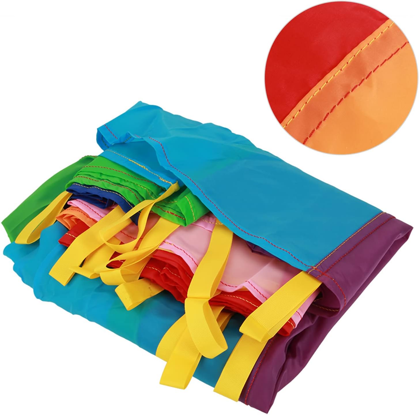 Questo paracadute di questo gioco per bambini adotta il tessuto Oxford, resistente all'abrasione, robusta e resistente in uso Stile arcobaleno multi -colo, questo paracadute sembra molto bello e attraente Adatto ai multi -giocatori, benefici per aumentare la consapevolezza dei bambini sulla cooperazione del team e promuovere l'interesse delle attività fisiche Aiuta ad allenare l'avambraccio per bambini e i muscoli delle dita nel processo di giochi e attività divertenti È un divertente giocattolo da gioco all'aperto per bambini, anche un bell'asilo per la scuola materna