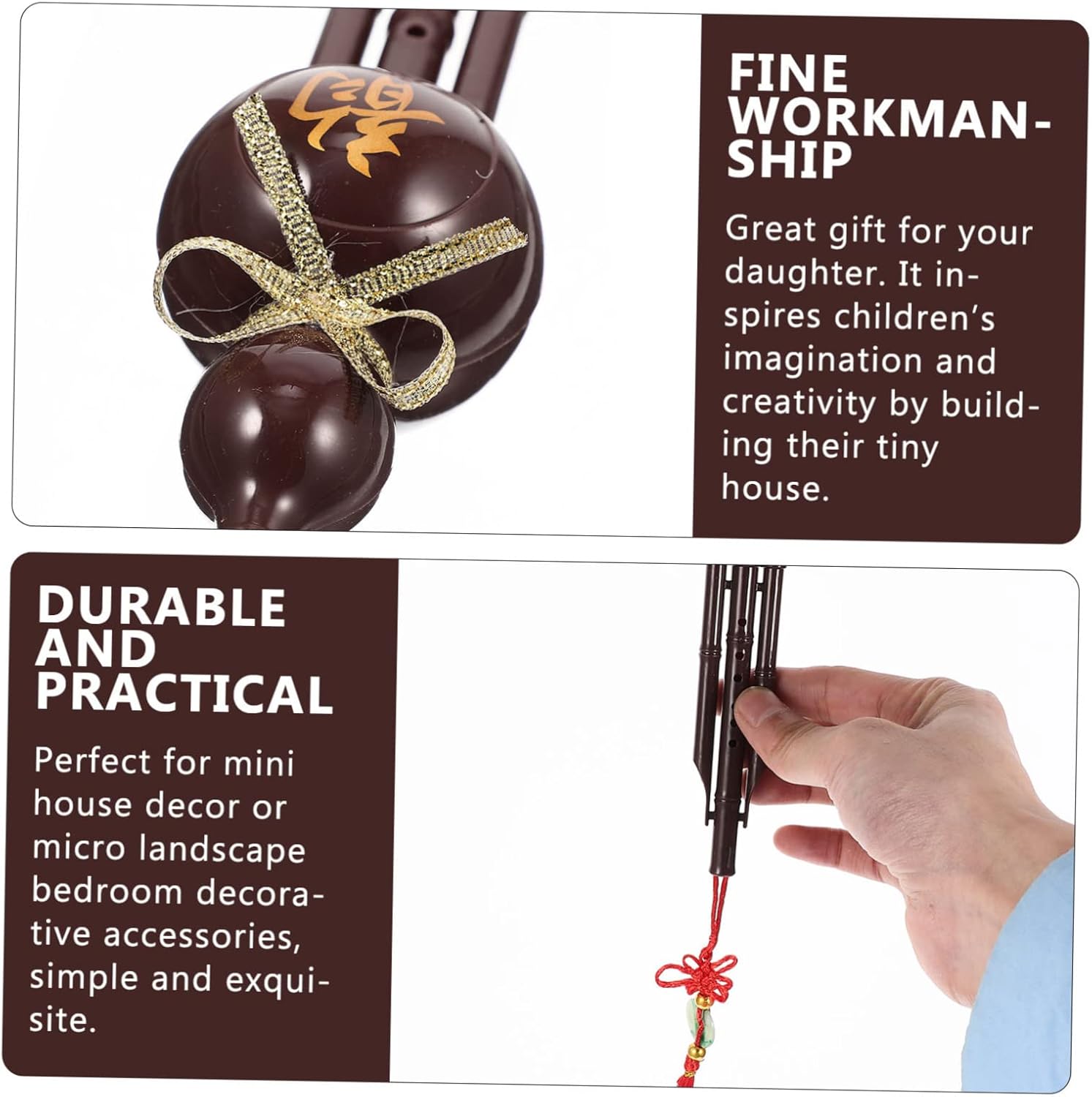 ACCESSORI PER CASE DELLE BAMBOLE IN MINIATURA: ha una dimensione adatta, una decorazione supplementare per mini case. MODELLO DI FLAUTO GIOCATTOLO: questo flauto in miniatura è un accessorio per la casa, facile da posizionare e molto versatile. ACCESSORI PER BAMBOLE: realizzati in materiale stabile, il flauto in miniatura è pratico, non facile da usare. DECORAZIONE PER FLAUTO DA SCRIVANIA: è necessaria per i mobili della mini casa nella camera da letto in miniatura o nella sala da pranzo della mini casa. DECORAZIONI PER FLAUTO DI CUCURBITA PER BAMBINI: questo mini flauto può ben abbinato a mini libri, mini sculture e altre miniature.