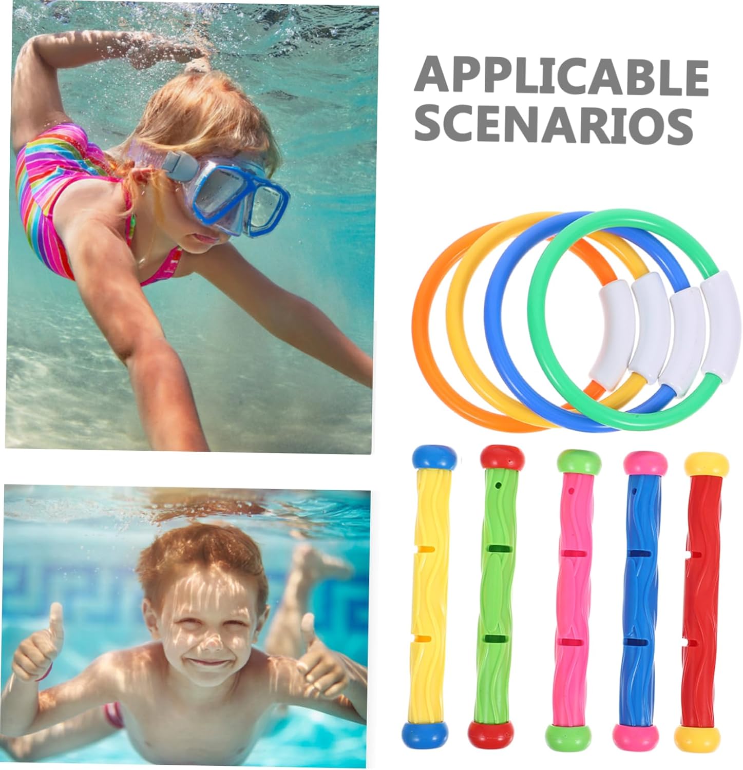 Giocattoli da piscina per immersioni: il design colorato dei giocattoli da nuoto li rende facili da trovare, non solo attira molto i bambini, ma li rende anche divertenti, giochi d'acqua Giocattoli da piscina: questo kit di giocattoli per immersioni è leggero, di piccole dimensioni, anche molto facile da riporre quando non in uso, giocattolo per anello da nuoto Giocattolo acquatico per bambini per piscina: giocare con questi bastoncini da immersione e giocattoli ad anello è un buon uso come strumenti didattici per l'immersione, per aggiungere divertimento all'estate, giocattoli divertenti Anello da nuoto: i giocattoli da immersione possono aumentare il divertimento e la piscina con i tuoi bambini, trascorrere momenti interessanti, anelli da piscina Giocattoli da piscina per bambini: colori vivaci e una forma possono aiutare a stimolare la visione del tuo bambino, incoraggiarlo a toccare ed esplorare, giocattoli per immersioni in piscina