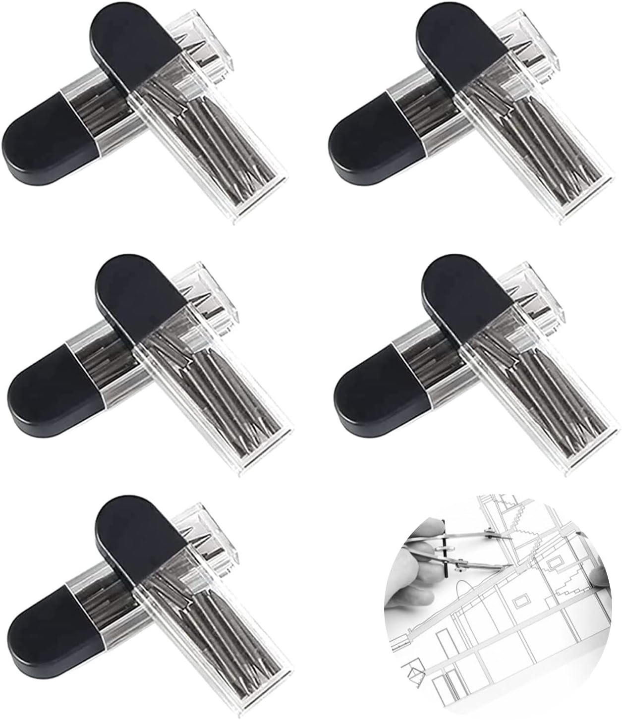 Inclusi i cavi di ricambio in una scatola Bussola piccola e pratica Modifica del raggio semplicemente tirando o spingendo tra loro Punta in metallo all'estremità della prima gamba e portamine all'estremità della seconda gamba Bussole e ricariche in una custodia per una protezione ottimale durante il trasporto