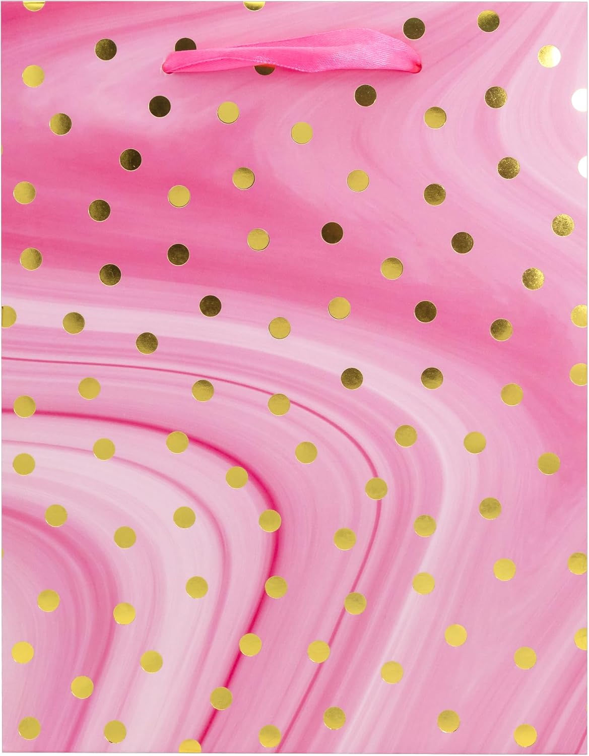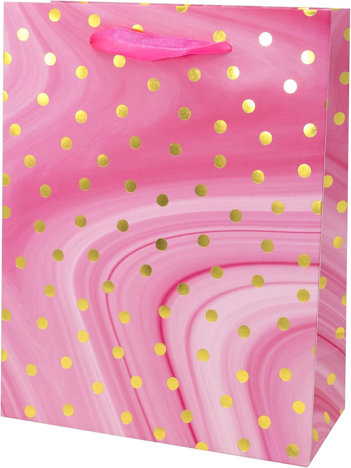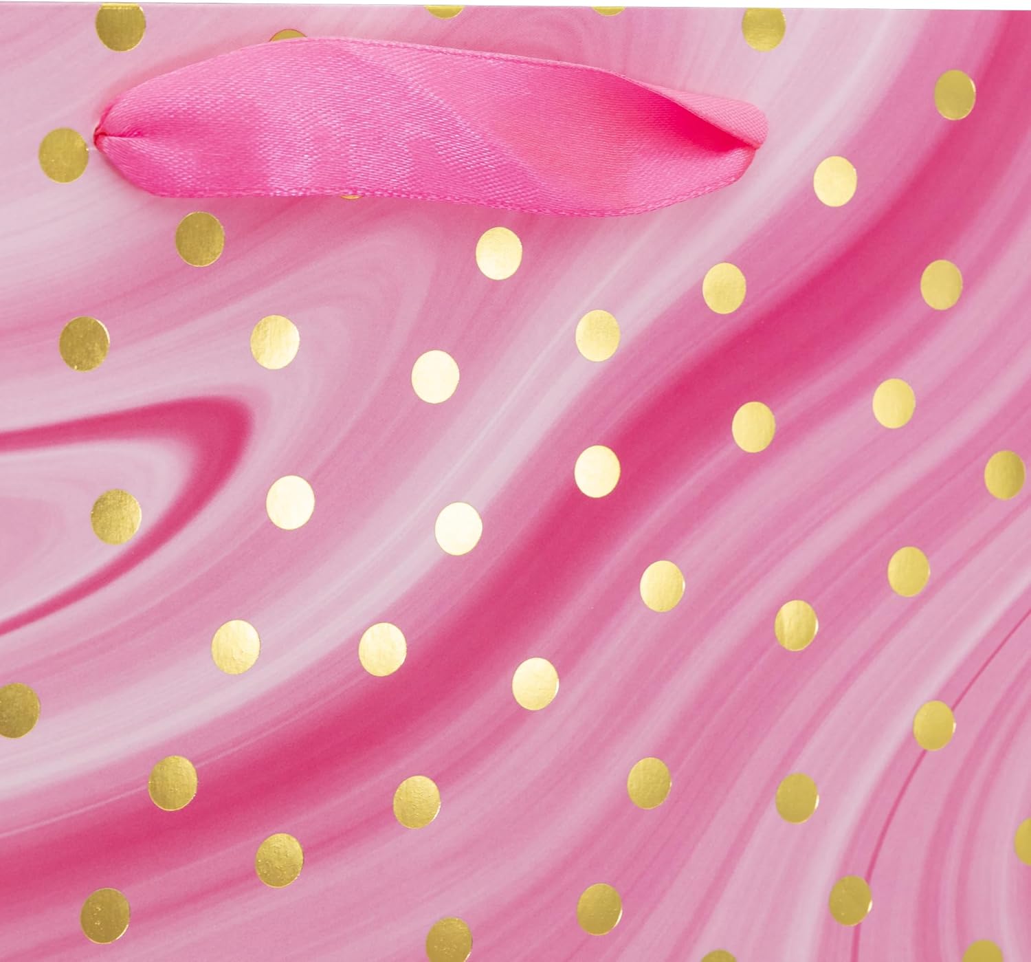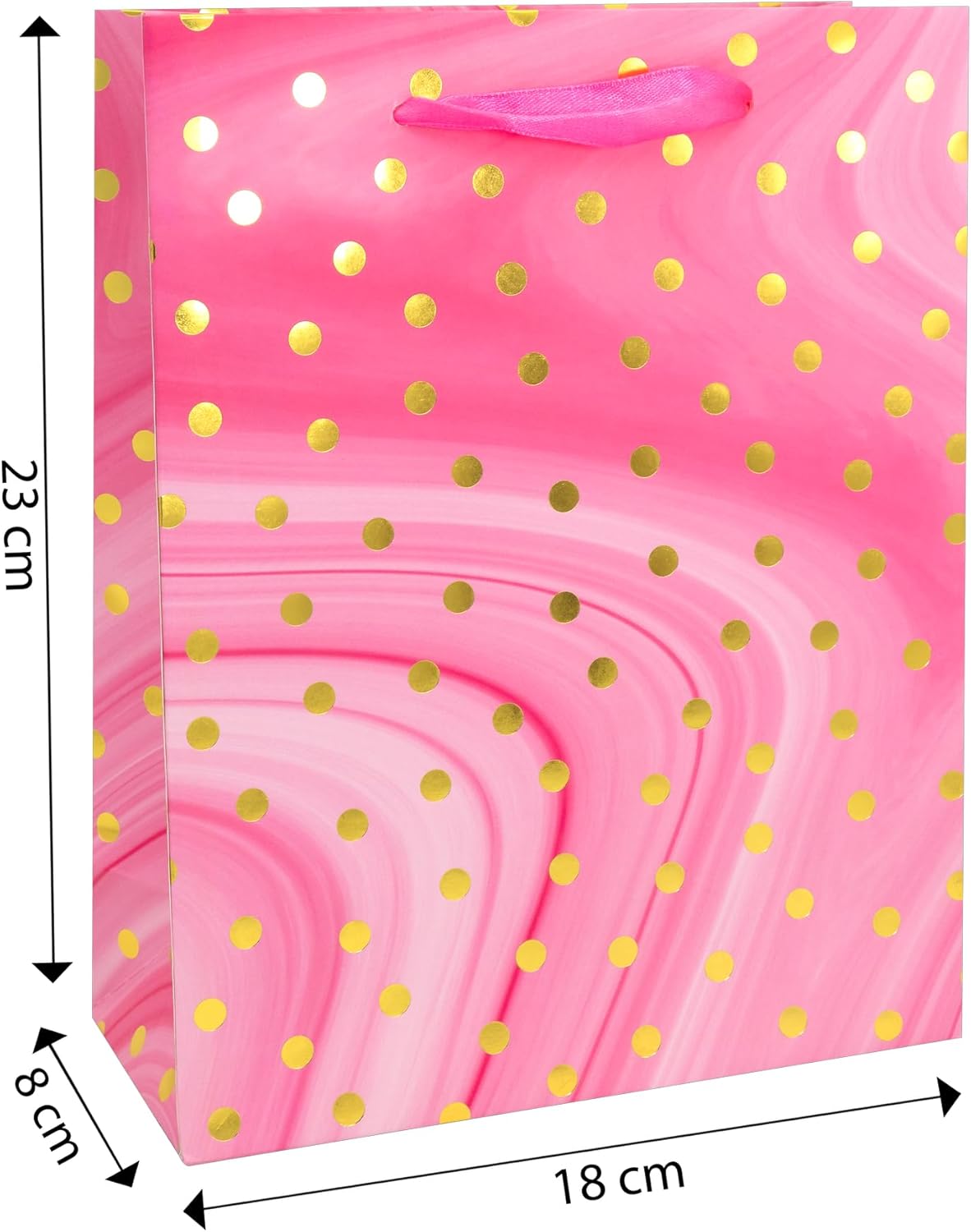 Con i sacchetti regalo dal design elegante i tuoi regali saranno confezionati in modo rapido e bello. La fornitura comprende 10 sacchetti in rosa con punti dorati. Ogni sacchetto regalo ha una dimensione di circa 18 x 8 x 23 cm (larghezza x profondità x altezza). Elevata stabilità grazie alla base di appoggio e comodo da indossare grazie a due cordoncini di raso. I sacchetti regalo sostenibili realizzati con carta mista certificata FSC possono essere riutilizzati e regalati