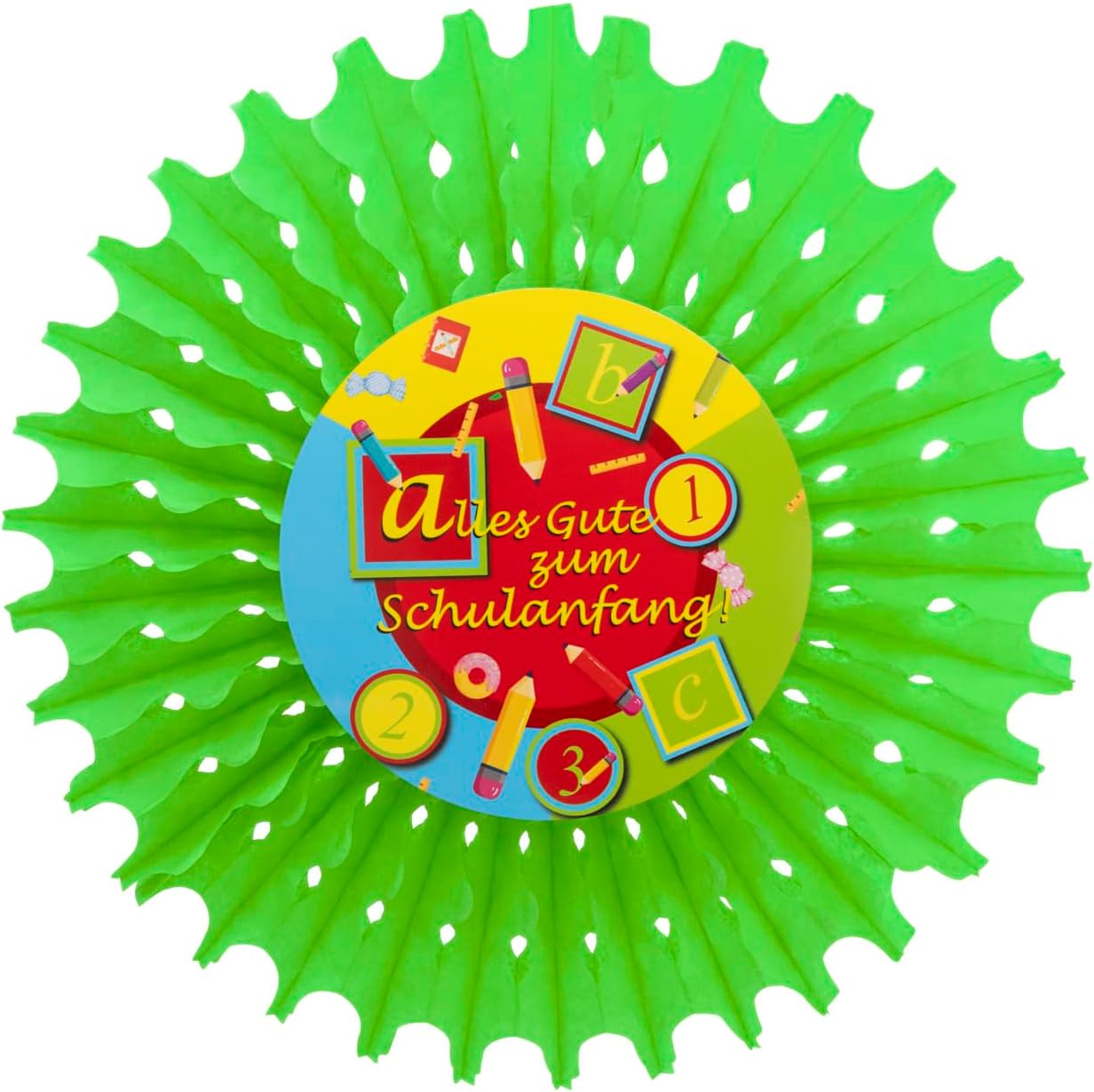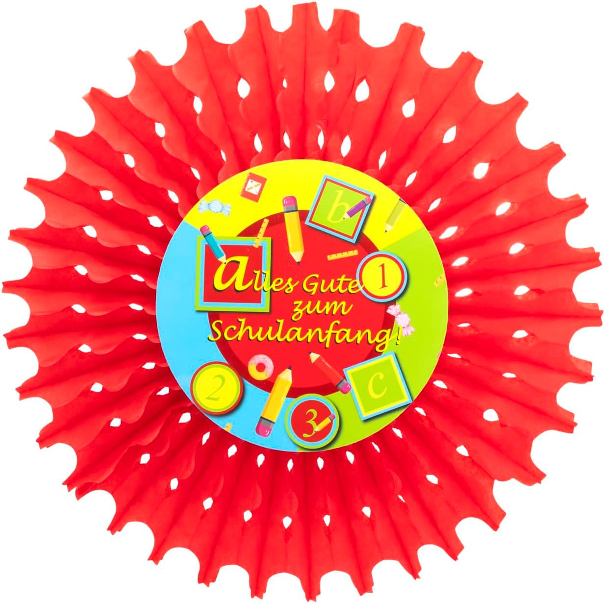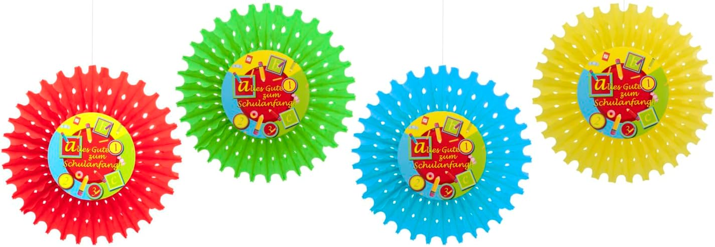 Decorazione colorata per feste con 4 ciondoli rotondi Nella confezione sono inclusi 4 ganci colorati con la scritta "Alles Gute zum Schulanfang!" "incluso In carta certificata FSC Mix – Promuove un buon uso forestale (FSC 112861) La decorazione è semplice da montare e da appendere Ideale come decorazione per l'inizio della scuola, per l'inizio della scuola o per l'inizio della scuola