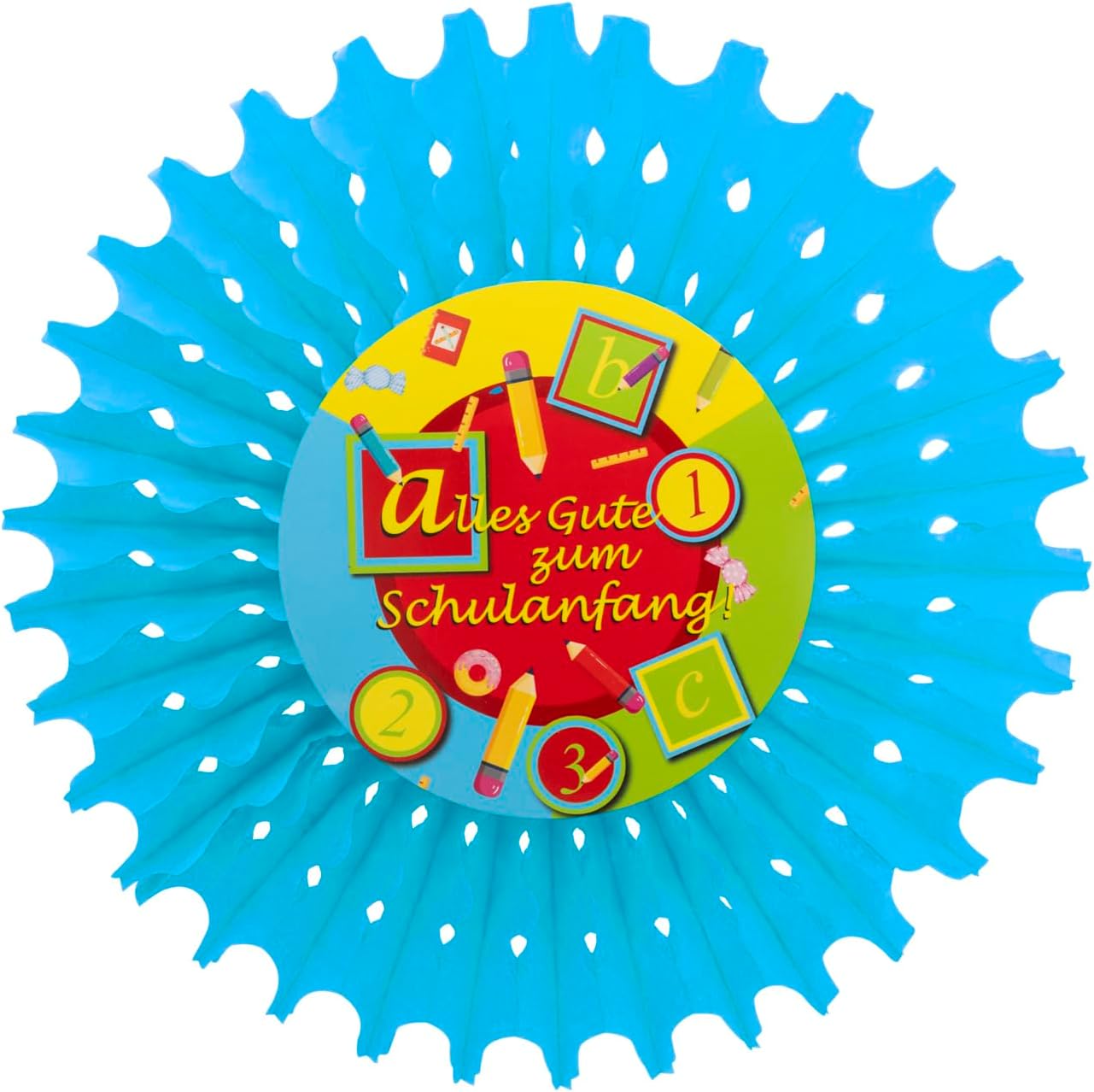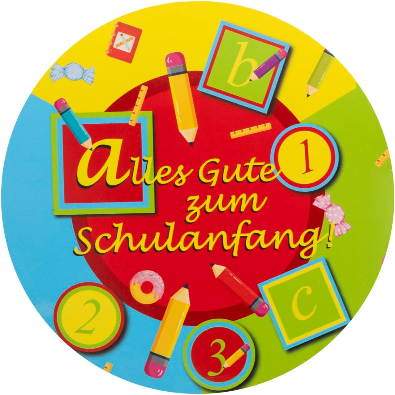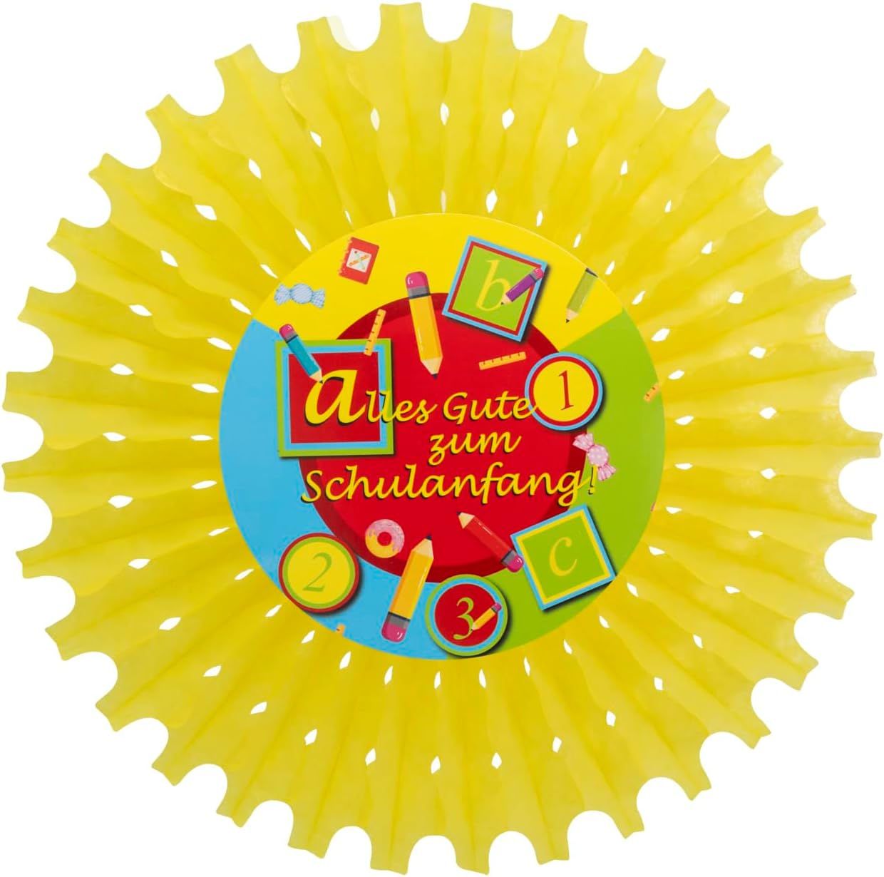 Decorazione colorata per feste con 4 ciondoli rotondi Nella confezione sono inclusi 4 ganci colorati con la scritta "Alles Gute zum Schulanfang!" "incluso In carta certificata FSC Mix – Promuove un buon uso forestale (FSC 112861) La decorazione è semplice da montare e da appendere Ideale come decorazione per l'inizio della scuola, per l'inizio della scuola o per l'inizio della scuola