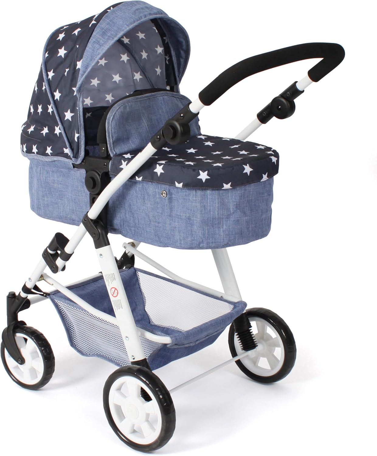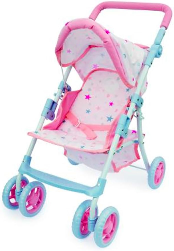 Passeggino con struttura in metallo, dimensioni circa 26,5 x 55 x 41 cm, altezza di scorrimento circa 55 cm Il rivestimento blu (100% poliestere) con grazioso motivo fiabesco può essere rimosso e lavato in caso di sporco Per una bambola o un peluche fino a un massimo di 46 cm, la cintura di sicurezza impedisce che cada Dotato di doppie ruote per una facile spinta e un blocco di sicurezza Può essere facilmente ripiegato in caso di necessità (circa 63 x 11 x 11 cm) e facile da trasportare