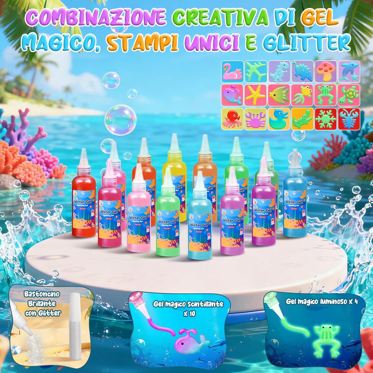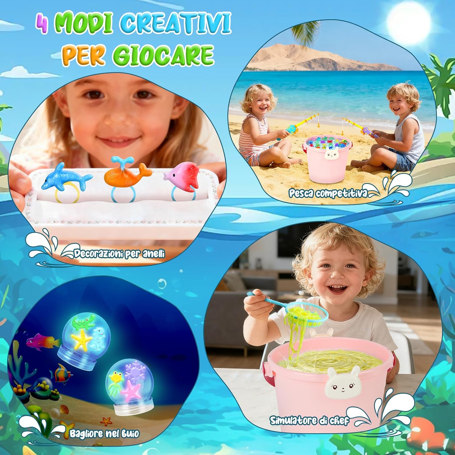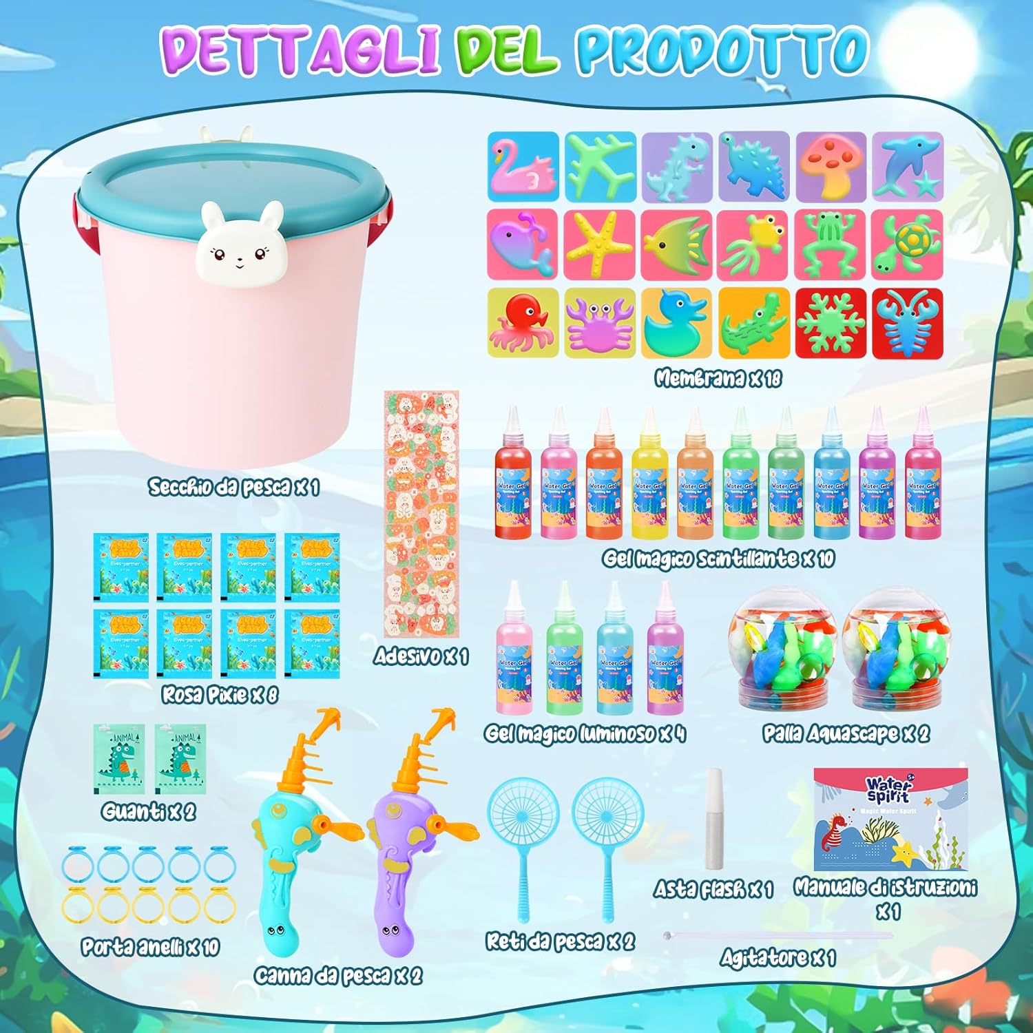 🎣 【Set da Pesca con Gel Magico da Sogno】 Il nostro Magic Water Elf Set da Pesca offre ai bambini un’esperienza creativa davvero incantata. Il set include: 1 secchiello da pesca, 2 canne da pesca, 10 gel perlati, 4 gel luminosi notturni, 8 bustine di polvere magica, 18 stampi divertenti, 2 setacci, 10 supporti ad anello, 2 flaconcini decorativi, una bacchetta scintillante, un bastoncino per mescolare, adesivi, guanti e istruzioni. I bambini possono combinare liberamente colori, forme e accessori, liberando la loro fantasia illimitata con il 3D Magic Gel e l’universo del Magico Acqua Fairy! ✨ 【Il Magico Water Elf Luminoso】 Questo kit modificato di 3D Magic Gel è diverso dalla versione standard in quanto utilizza gel perlato e gel luminoso al posto del normale gel. Di giorno brillano come perle preziose, mentre di notte emanano una luce delicata, come veri Magic Water Elf che danzano nel buio. Trasforma le creazioni dei tuoi figli da meravigliosi artigianati a piccole decorazioni luminose. 🐠 【Gioco Interattivo di Pesca – Esperienza Immersiva】 Il set Magic Water Elf introduce un’innovazione unica con il suo secchiello da pesca, le canne e i supporti ad anello. Dopo aver creato i propri “anello water elf” utilizzando il gel magico 3D, i bambini possono pescare in barili o in piccole piscine come veri piccoli pescatori. Scoprono così la gioia dell’esplorazione e del divertimento, unendo gioco, Immergi ogni bambino nel suo mondo magico! 🧪 【8 Bustine di Polvere Magica per Creare 3D Water Elf】 Rispetto alla versione standard, questo 3D Magic Gel Set da Pesca contiene 8 pacchetti di polvere, per creare forme più numerose e piene. Con il 3D Magic Gel, è semplicissimo: mescola 1 litro di acqua tiepida con una bustina di polvere magica fino a ottenere il “liquido magico”, poi versa il gel colorato negli stampi ad anello. Dopo 3 secondi, immergilo nell’acqua, scuoti leggermente per staccare la forma e lascia riposare da 15 minuti a 2 ore finché non si solidifica. In pochi passi, i bambini potranno dare vita ai loro Magico Acqua Fairy 3D scintillanti – un’esperienza davvero magica! 🎁 【Confezione da Sogno – Regalo Perfetto per l’Infanzia】 Che sia per un compleanno, Natale o una festa, il Magic Water Elf Set da Pesca è un regalo da sogno per ogni bambino. Unisce creatività, bellezza e gioco interattivo: i piccoli potranno esporre le loro creazioni in una sfera decorativa o nel secchiello, creando il proprio “giardino acquatico incantato”, regalando infiniti momenti di meraviglia e ricordi felici.