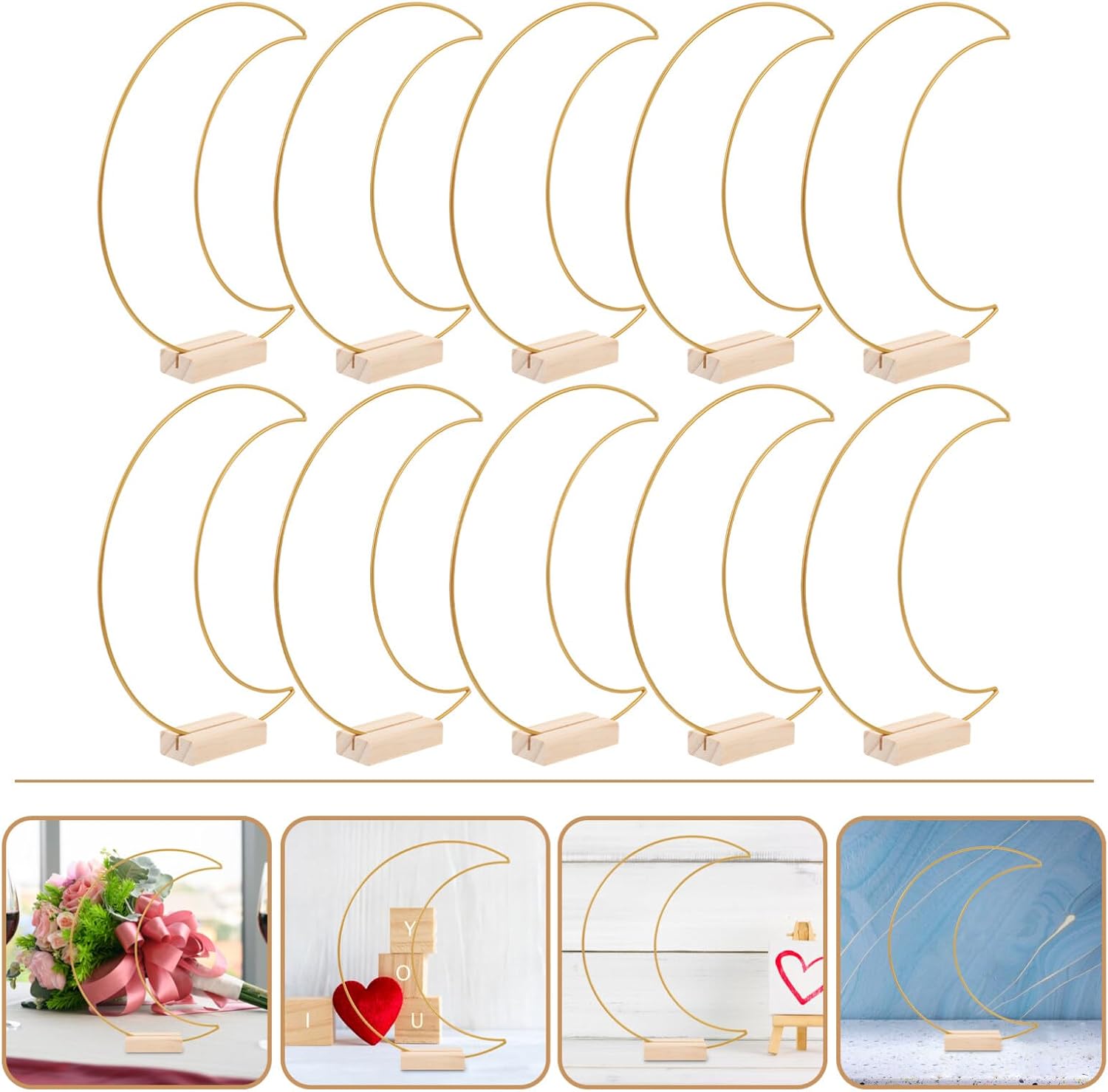 ✨✨Il nostro centrotavola in metallo con supporto è adatto a tutte le decorazioni per la tavola delle feste, come la tavola di nozze, decorazioni per la casa, anniversari, luna di miele e decorazioni natalizie del Ringraziamento. ✨✨PUOI CREARE LE TUE DECORAZIONI UNICHE E BELLISSIME PER UNA FESTA ROMANTICA. PROCESSO RIGOROSO, SELEZIONE DI BUON MATERIALI DI PRODUZIONE, APPARENTEMENTE SEMPLICE, MA OVUNQUE DELICATO. CENTROTAVOLA CERCHIO FLOREALE IN METALLO PER TAVOLO ANELLO GHIRLANDA A FORMA DI LUNA IN METALLO CON PORTA CARTE IN LEGNO CERCHIO CORONA PER LA DECORAZIONE DELLA TAVOLA DELLE FESTE ARTIGIANATO PER MATRIMONI FAI DA TE. ✨✨L'anello del fiore in metallo è realizzato in metallo robusto, resistente e non facile da rompere o deformare, la superficie è smaltata per prevenire l'ossidazione e la ruggine. Le staffe in legno sono realizzate in legno di pino naturale con superficie liscia, sono robuste e sostengono il peso degli anelli d'oro. ✨✨Il cerchio floreale in metallo è dorato, classico ed elegante, perfetto con la decorazione. Il supporto in legno è color tronco, conserva le venature naturali del legno e ha una scanalatura al centro, che si adatta perfettamente alla larghezza della ghirlanda. Il cerchio floreale in metallo e i supporti in legno sono una combinazione perfetta tra centrotavola nuziali e decorazioni per la casa. ✨✨I CENTROTAVOLA FLOREALI SONO ADATTI PER LE TUE DECORAZIONI FAI DA TE, PUOI ESERCITARE LA TUA IMMAGINAZIONE E CREATIVITÀ PER UTILIZZARE FIORI, PIANTE, TESSUTI, FILATI COLORATI, NASTRI E ALTRI MATERIALI AVVOLTI ATTORNO AGLI ANELLI DI METALLO PER CREARE DECORAZIONI PER LA TAVOLA UNICHE E BELLE E ARTIGIANATO SQUISITO, COME I FIORI CORONA, CORONA DI NOZZE, ACCHIAPPASOGNI, artigianato macramè, ecc.