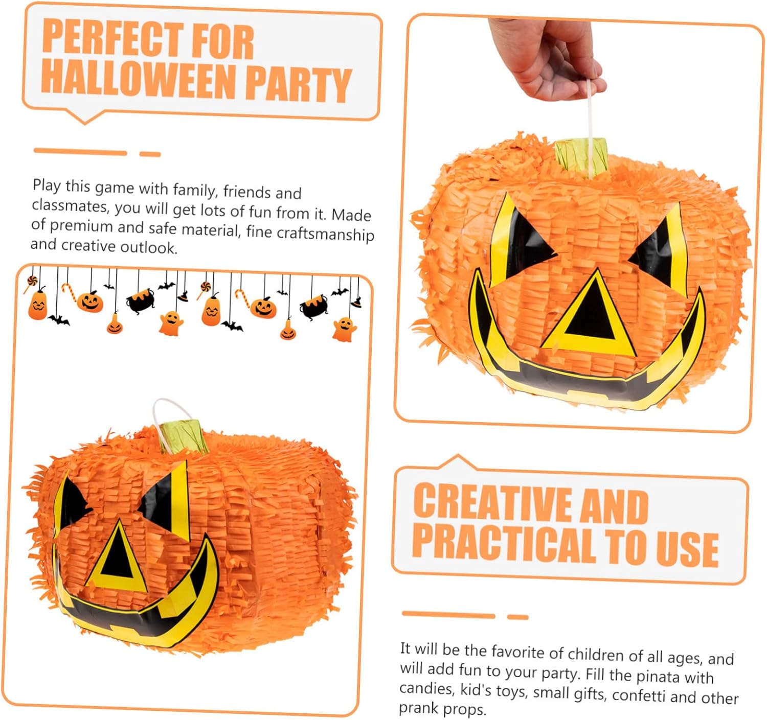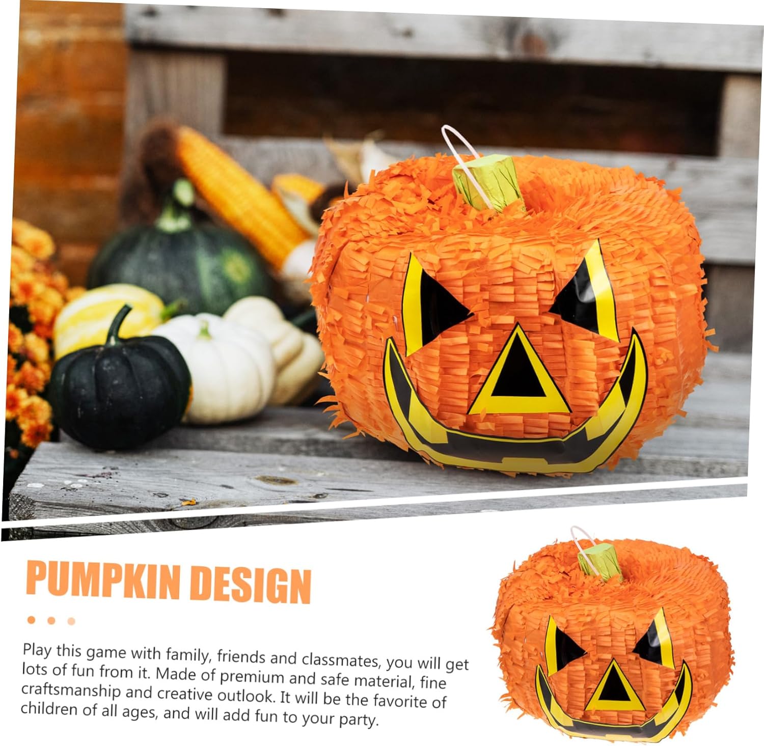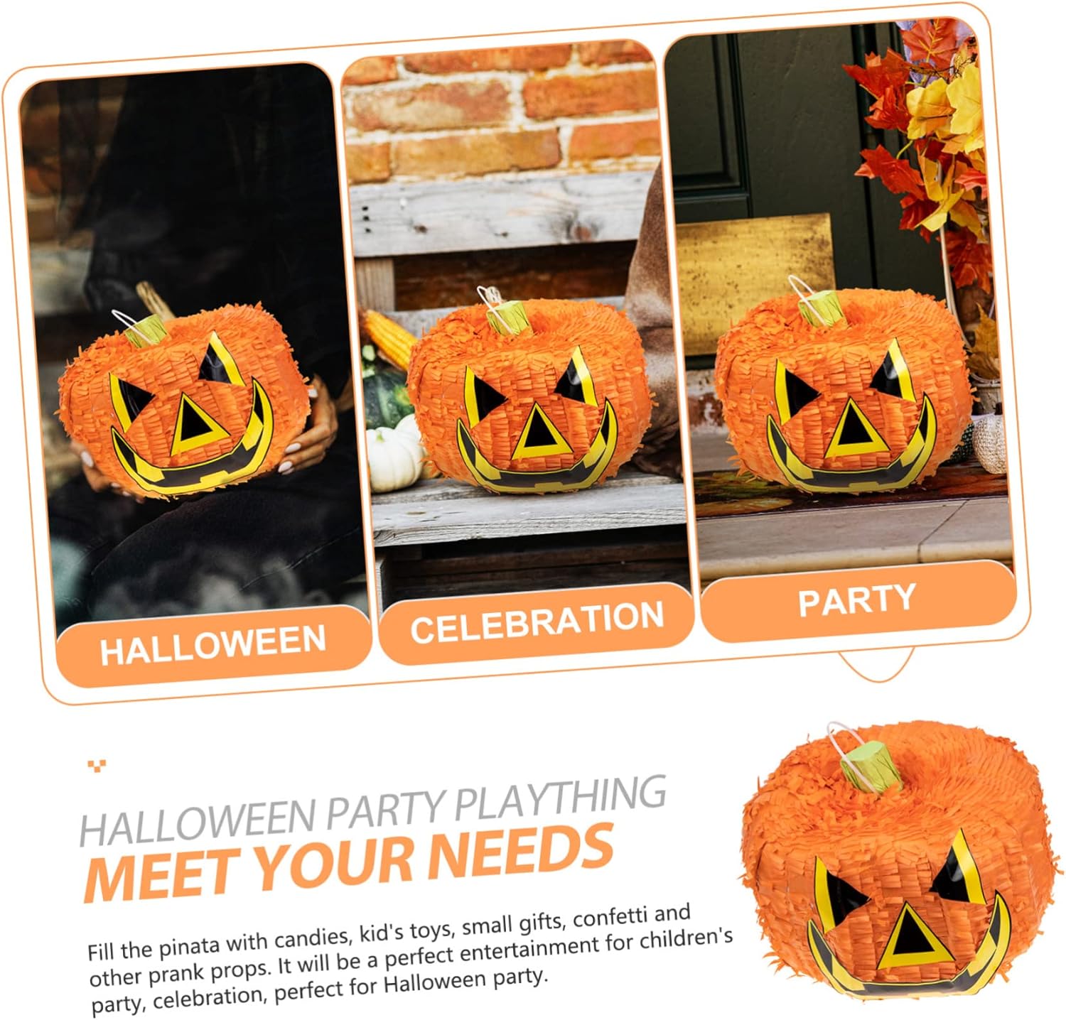 Decorazioni per esterni: pinata di zucca di Halloween per adulti e bambini, secchi di zucca preriempiti per Halloween, Ringraziamento, decorazioni per feste autunnali, oggetti di scena, compleanno di ottobre, divertenti giochi spettrali. Lanterne da esterno: abiti per riunioni di famiglia, feste di festival, feste di Halloween, ecc. Decorazioni da appendere per feste: gioca con la tua famiglia, i tuoi amici e i tuoi compagni di classe, ti divertirai molto. forniture per feste di Halloween Decorazioni per soffitto: questa tradizionale pinata di Halloween è fatta di carta e decorativa. La nostra amichevole decorazione di pinata di carta jack-o-lantern da appendere per Halloween presenta la classica zucca di Capodanno con una vivace pignatta, realizzata in materiale sicuro e durevole, pregevole fattura e aspetto. pinata
