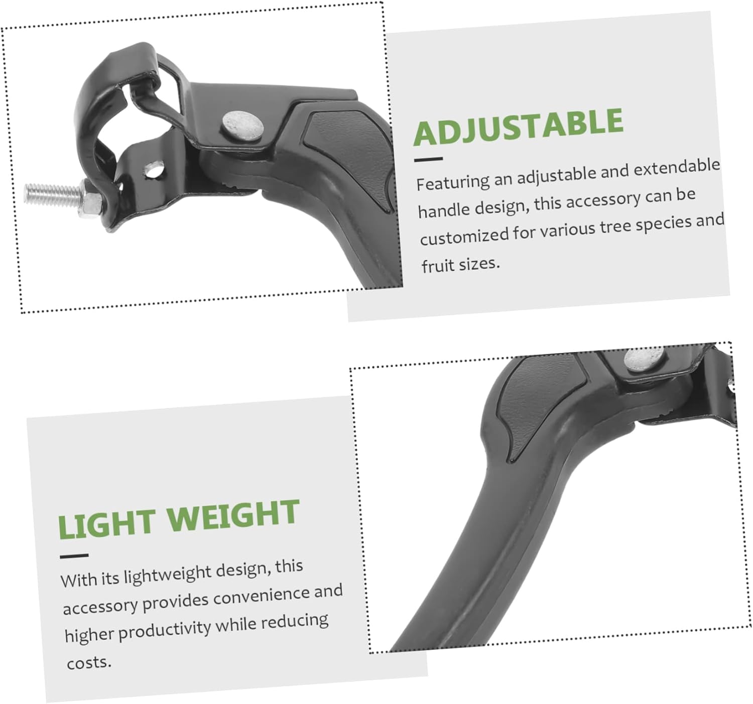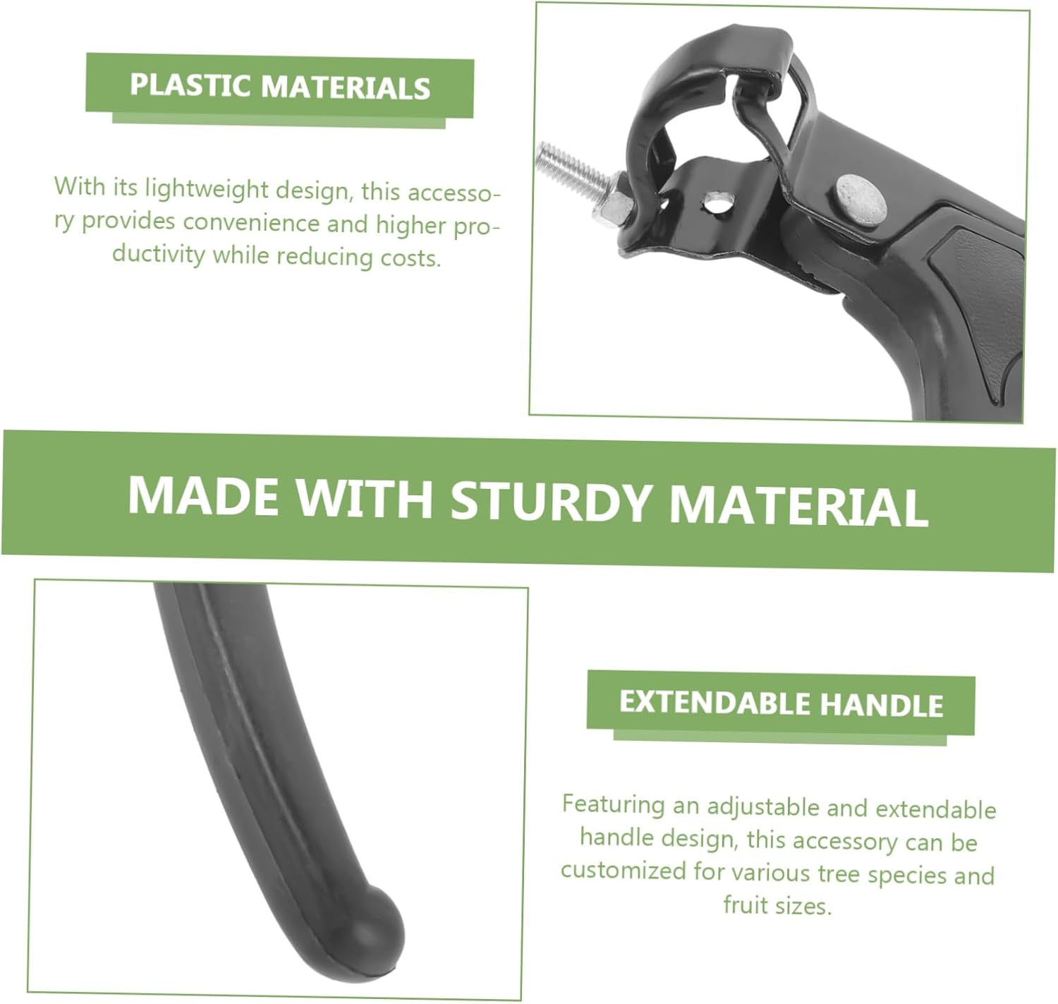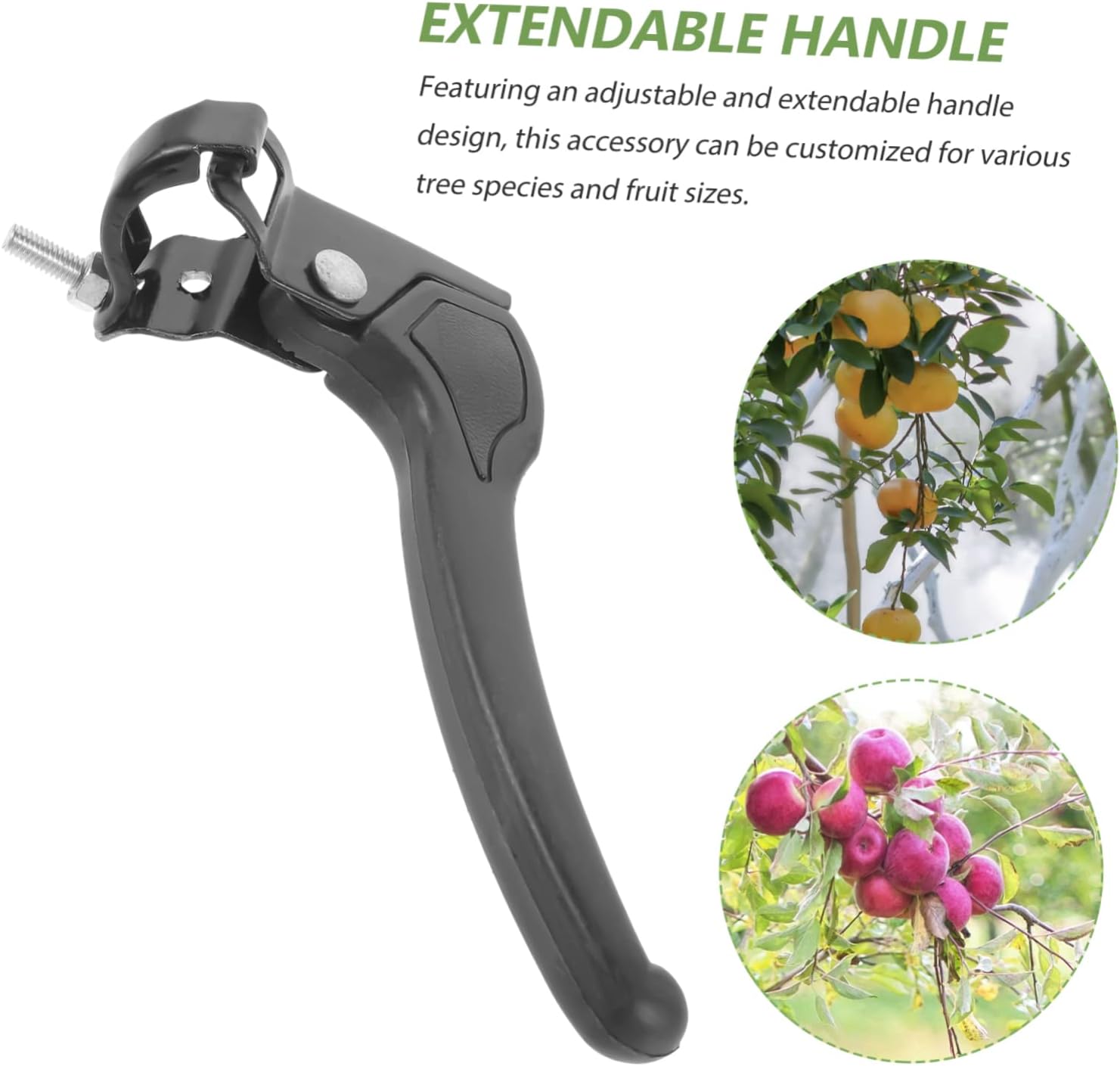 Palo per la raccolta della frutta: grazie al design della maniglia regolabile, questo accessorio si adatta ad alberi di diverse altezze e a diverse dimensioni di frutta, pinza per la raccolta dei sottaceti Manico per raccoglitrice di frutta a lunga portata: realizzato con materiale di alta qualità, il manico presenta una durata e una resistenza eccezionali, garantendo un funzionamento sicuro e stabile, raccoglitrice di frutta Strumento per la raccolta degli alberi da frutta: con la sua costruzione di qualità, questa impugnatura da giardino offre supporto affidabile per vari compiti, manico telescopico per la raccolta della frutta Accessorio per la raccolta della frutta: realizzato con materiale durevole, questo estensore per maniglia migliora la stabilità e supporta la raccolta lunga e il palo per la raccolta della frutta ad alta portata. Accessorio per la raccolta di frutta da frutteto facile da usare: ideale per raccogliere frutta da piante alte come gli alberi da frutto, questo accessorio aiuta gli agricoltori ad aumentare la loro efficienza e a i costi di manodopera, raccoglitore di alberi da frutto