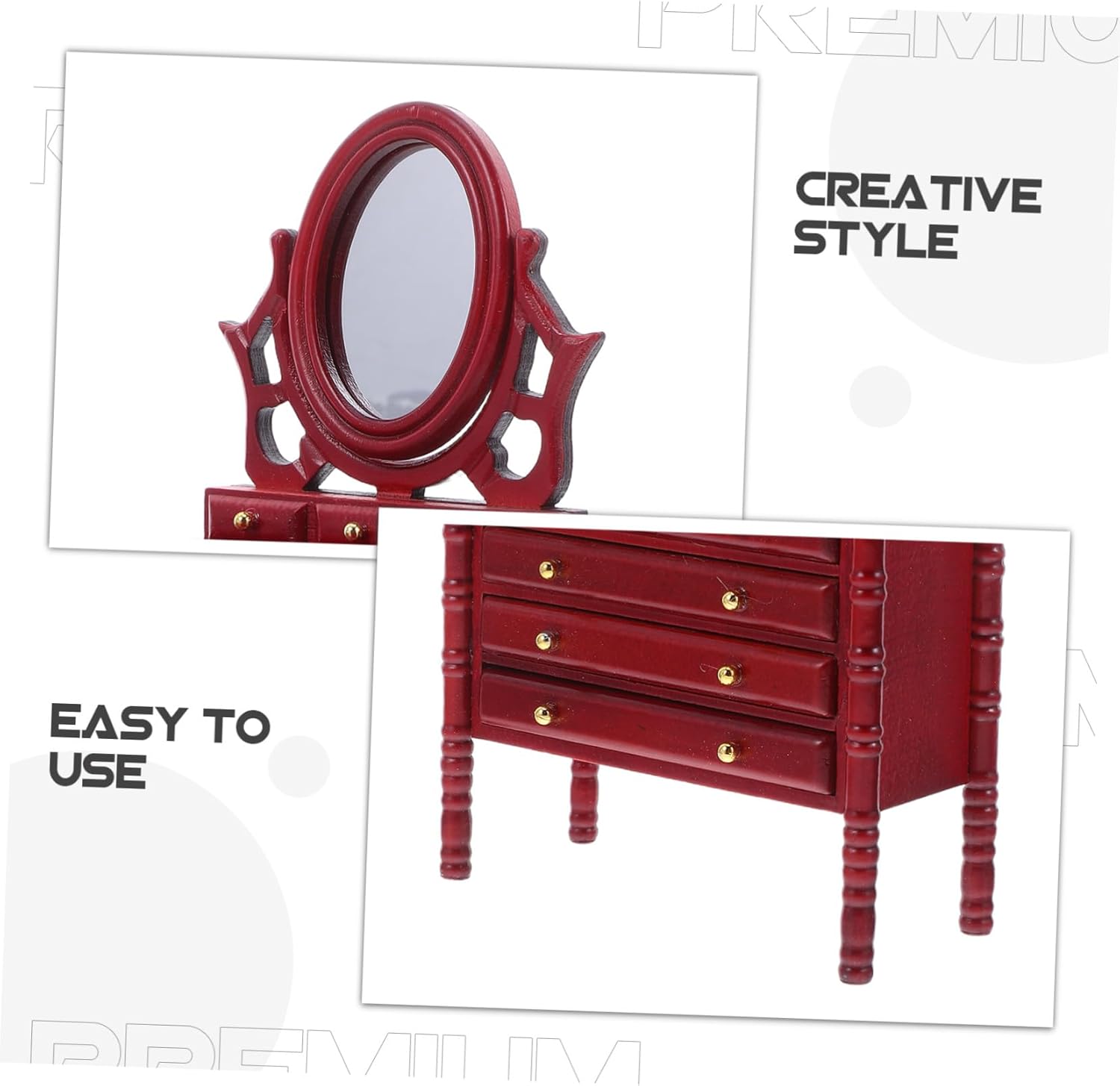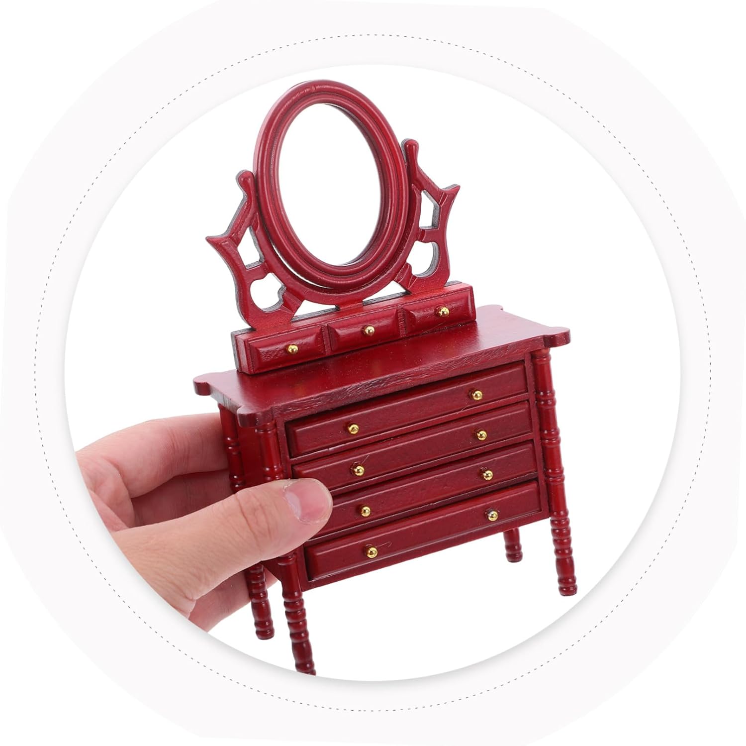 Costruzione: realizzati in legno robusto, questi mobili in miniatura garantiscono stabilità e longevità, rendendoli una scelta affidabile per i collezionisti di mobili per case delle bambole vintage, cassettiere vintage, modelli di cassettiere per case delle bambole Design elegante: tavolo da toeletta per casa delle bambole in miniatura con specchio e cassetti presenta una lavorazione artigianale intricata, aggiungendo fascino ai mobili della camera da letto della casa delle bambole e migliorando l'estetica delle scene in miniatura, piccola cassettiera per casa delle bambole, di mensola per cassetti in legno in miniatura Opzioni di decorazione flessibili: si facilmente con altri mobili per case delle bambole, come mini armadietti o tavolini da toeletta per case delle bambole, consentendo agli utenti di creare progetti di mobili per case in miniatura, comodini per case delle bambole, accessori per mobili in miniatura Elegante fascino in miniatura: tavolo da toeletta per casa delle bambole con specchio e cassetti aggiunge raffinatezza ai mobili della camera da letto della casa delle bambole, esaltando fascino degli accessori per casa delle bambole in miniatura, tavolo da toeletta per casa delle bambole, piccolo tavolo da toeletta Conservazione funzionale: dotato di mini ripiani in legno, di cassettiera per casa delle bambole offre un pratico di archiviazione per gli oggetti della casa delle bambole, risolvendo sfide organizzative negli accessori per case delle bambole in miniatura, tavolo da toeletta per case delle bambole in miniatura, accessori per case delle bambole in miniatura