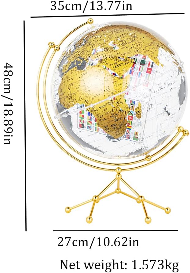 PERFETTAMENTE PRATICO: questo mappamondo con spilla indica e mostra le tue esperienze e destinazioni preferite, oppure ispira ed esplora nuovi luoghi e destinazioni. Se viaggiare per il mondo è la tua passione, questo è il regalo che fa per te. 【Alta qualità】Questo globo terrestre è realizzato in materiale acrilico, che ha una buona trasmissione della luce e stabilità chimica, sfera di cristallo, resistente all'usura e impermeabile [Stampa HD] La sfera adotta la tecnologia di stampa serigrafica a inchiostro dorato dell'area politica mondiale. L'interno della sfera adotta un cubo acrilico trasparente girevole ed è stampato con il motivo della bandiera mondiale. Gli strati sono chiari, i colori sono chiari, la scrittura a mano è chiara e la visione è chiara a colpo d'occhio 【Base in metallo】Base di supporto triangolare, struttura solida e lavorazione pregiata, perfetta per la decorazione di casa e ufficio, come un look moderno ed elegante, si abbina perfettamente all'arredamento della tua casa esistente 【Rotazione a 360°】La superficie sferica è liscia e rotonda, la stampa della sfera è chiara e il contenuto è completo, non importa in quale angolazione ti trovi, puoi facilmente capovolgere il globo per trovare ciò che vuoi mostrare, puoi facilmente portare qualsiasi area nei tuoi occhi.