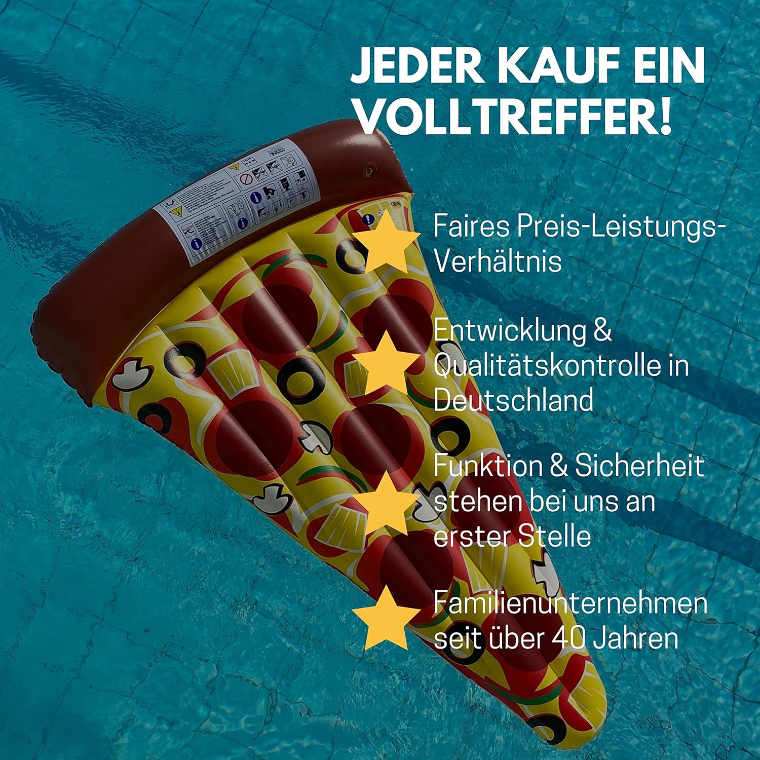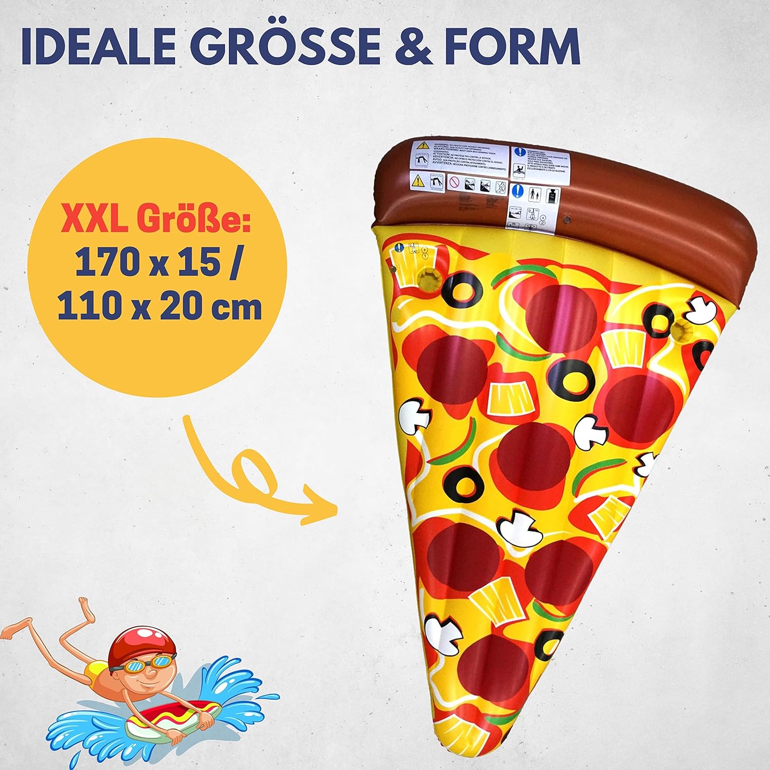 Stile casual: con la pizza gonfiabile XXL ti distinguerai sulla prossima spiaggia o piscina e avrai il posto più comodo in acqua e sulla spiaggia. Specifiche: lunghezza: 170 cm, larghezza: 110 cm, carico massimo: 100 kg, ideale per tutte le età e taglie. Un must per bambini e adulti per la prossima vacanza al mare. Altezza: superficie di appoggio: 15 cm, bordo pizza: 20 cm Garante assoluto delle feste – sia in piscina, durante una festa in spiaggia, o rilassandosi al mare, in piscina o al lago. Con questa pizza galleggiante dici sì alla festa, al buon umore e al piacere di fare il bagno. Qualità convincente - Per voi, come azienda a conduzione familiare Bremer, da oltre 40 anni stabiliamo le tendenze nei prodotti per lo sport e il tempo libero - La vostra soddisfazione è la nostra motivazione
